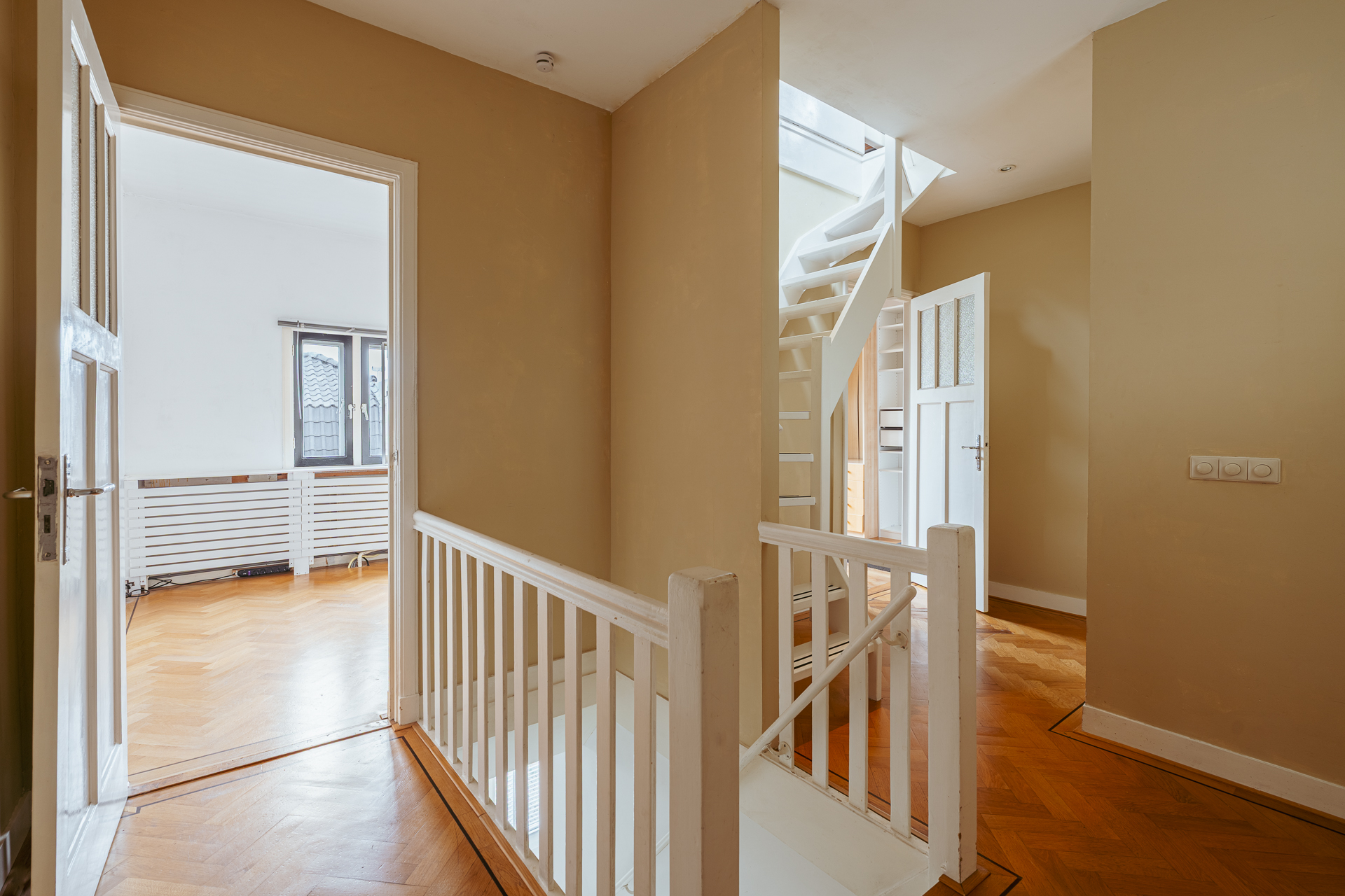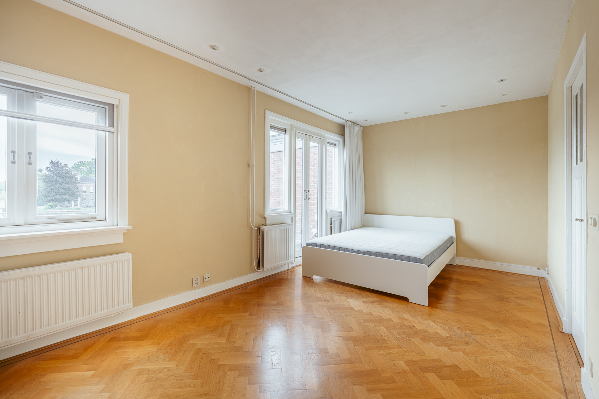 تستقبلكم المدخل عبر شارع هادئ وتاريخي إلى ردهة مزودة بمساحات تخزين وافرة ووسائل راحة للضيوف. في الواجهة، توجد غرفة متعددة الاستخدامات يغمرها الضوء الطبيعي مع نوافذ عالية ومدخل خاص، مثالية كمكتب أو جناح للضيوف. تتوزع غرفة المعيشة الواسعة على عرض المنزل بأكمله، وتزدان بأرضية خشبية بنمط السمك، ونوافذ طويلة، وأبواب فرنسية تطل على الحديقة المصممة بعناية ومشاهد خلابة لنهر أمستل.