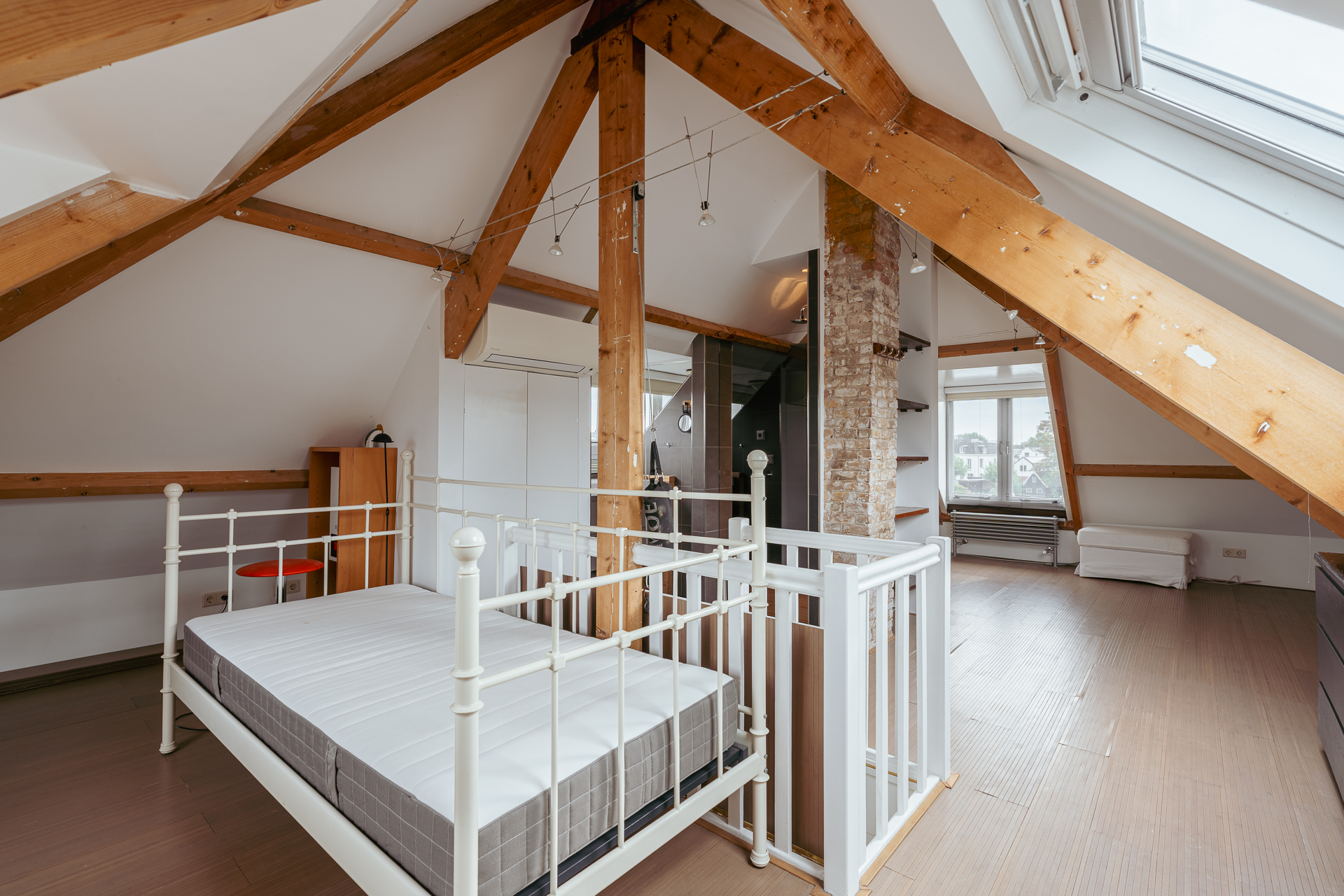 في الأعلى، يفتح الجناح الرئيسي على شرفة بمساحة 17 مترًا مربعًا تطل على المياه. وتكمل جناحين إضافيين مع حلول تخزين مصممة خصيصًا، وحمام أنيق مزود بدش مستقل وتدفئة أرضية، ملاذًا خاصًا. أما الطابق العلوي، فيتميز بعوارض مكشوفة وأسقف عالية وتكييف هواء ونوافذ سقفية وحمام ثان، مما يوفر مساحة مرنة للاستخدام أو التقسيم الإضافي.