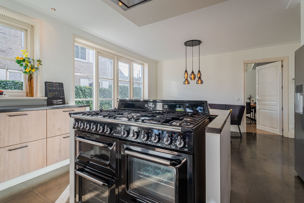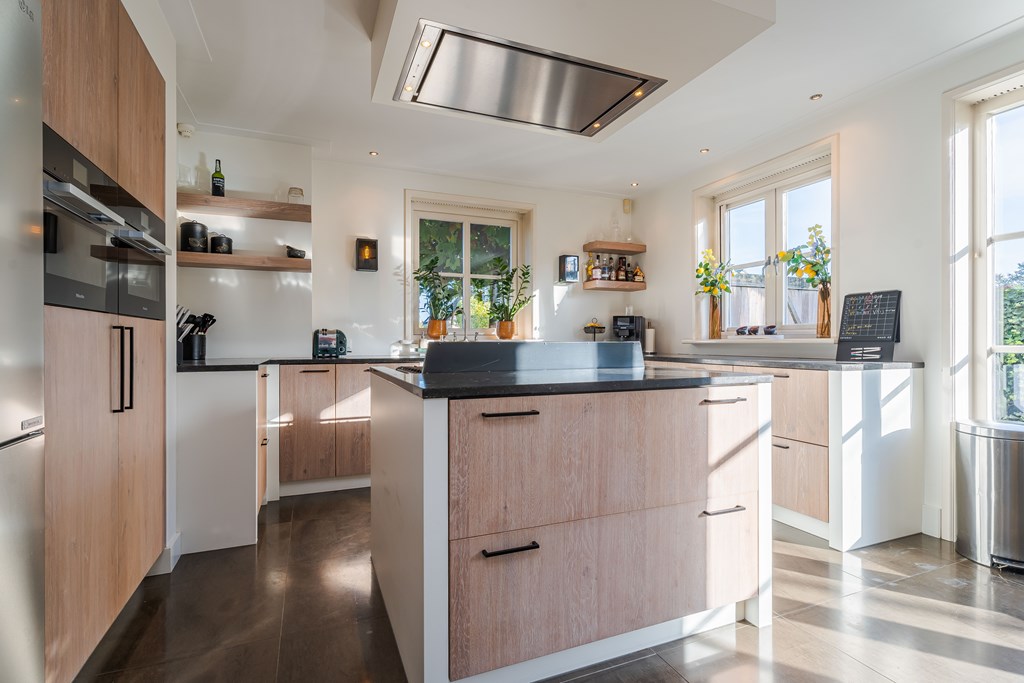 De gezellige leefkeuken is geplaatst in een hoekopstelling met kastenwand en kookeiland. De keuken is voorzien van een tegelvloer, 7-pits gasfornuis met diverse oven (SMEG), een afzuigkap, een dubbele gootsteen, een combi oven (Miele), een combi stoomoven (Miele) en diverse kastruimte en lades. Verder heeft de keuken een gezellige eethoek en heeft u middels openslaande tuindeuren toegang tot de zij tuin. Door de grote raampartijen is er ook in de leefkeuken veel natuurlijke daglichttoetreding.