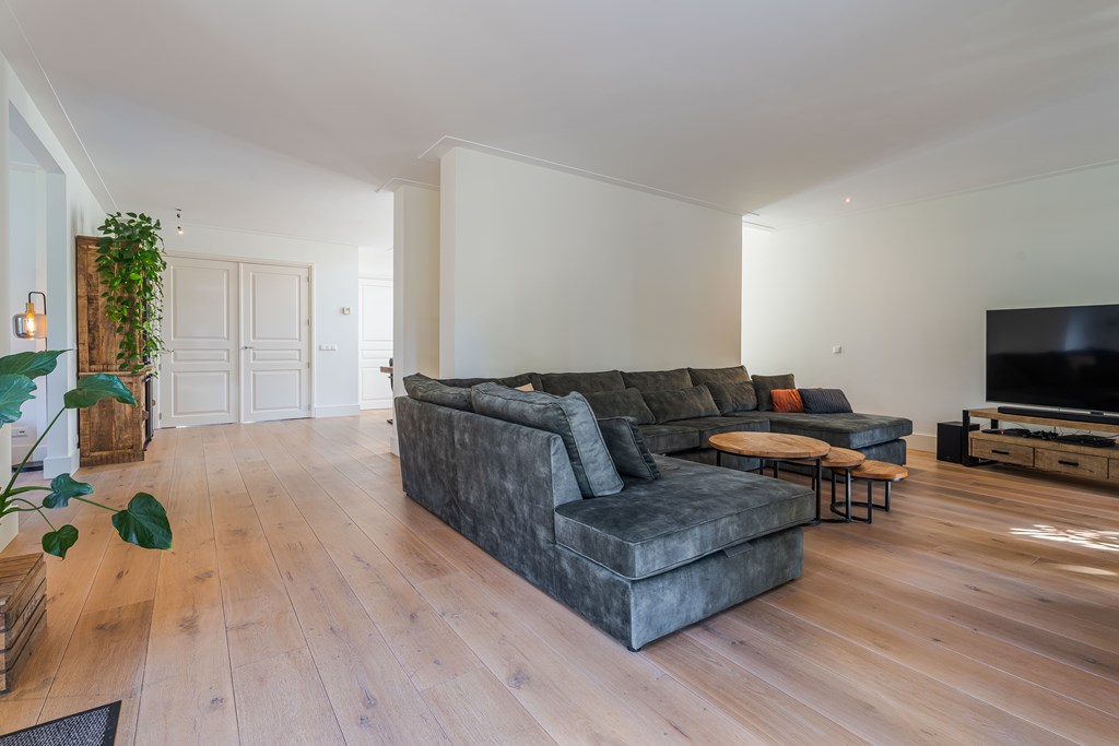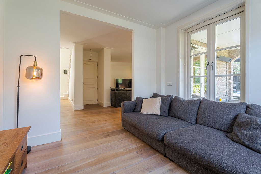 De living is onderverdeeld in een eetkamer, woonkamer en zitkamer. Opvallend zijn de grote en hoge raampartijen waardoor er veel natuurlijke daglichttoetreding in de woning is. De living is voorzien van een parketvloer, inbouwverlichting en een mooie gashaard met schouw. Er zijn maar liefst 3 openslaande tuindeuren waardoor u hier het absolute binnen-buiten gevoel kunt ervaren. De stijlvolle trapopgang is centraal geplaatst met uittreders richting zowel de woonkamer als eetkamer.