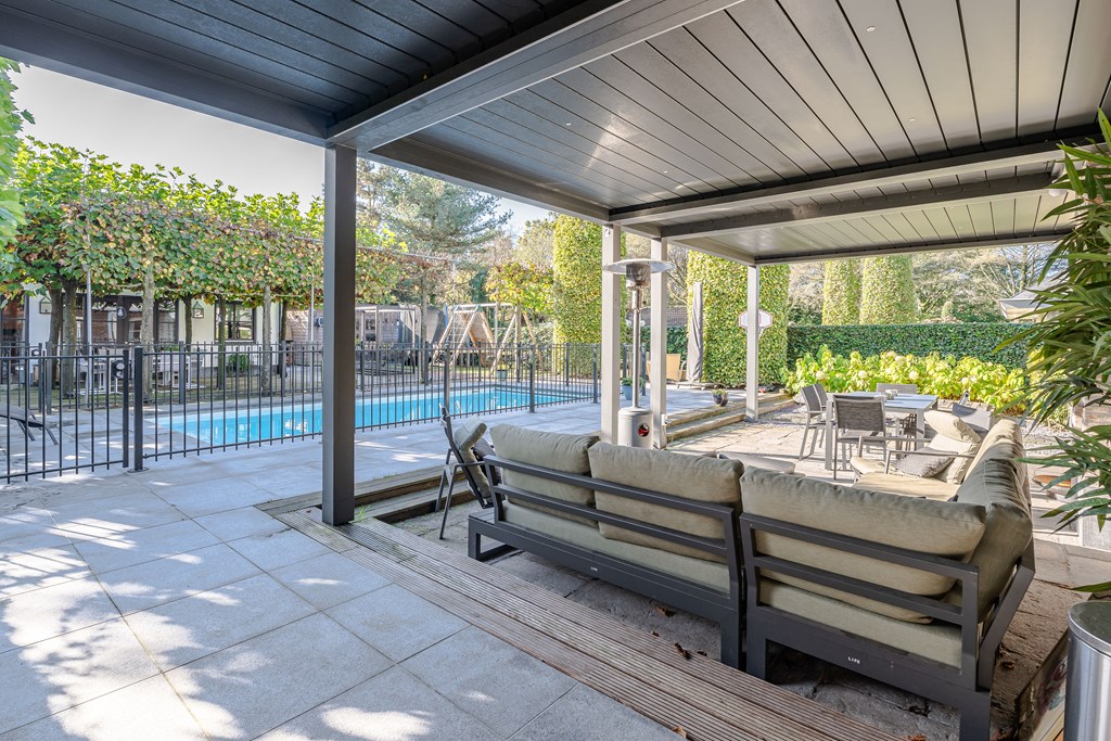 In het midden van de tuin ligt een verwarmd zwembad (Starline) met een elektrisch bedienbaar afdekscherm en verlichting. Het daaromheen geplaatste hekwerk kan relatief simpel verwijderd worden.