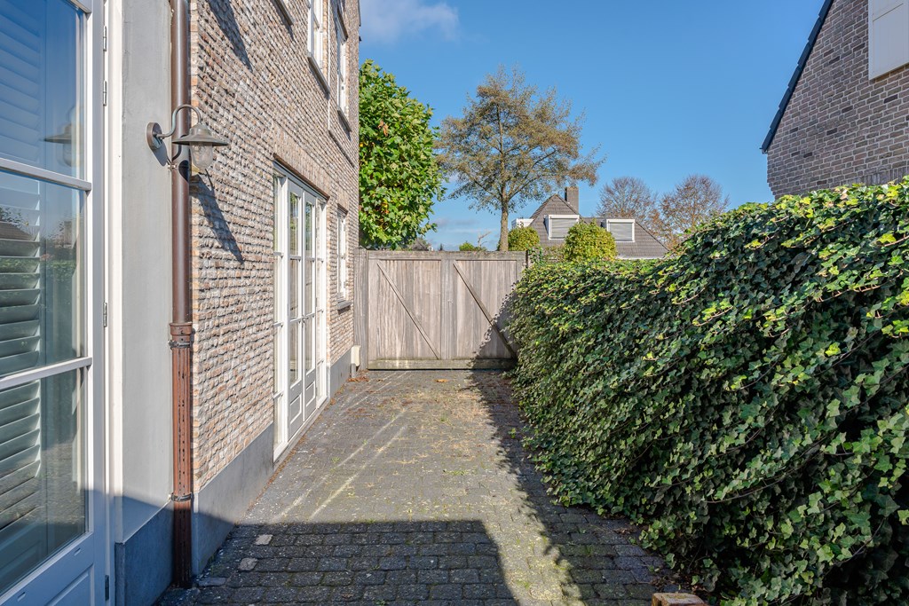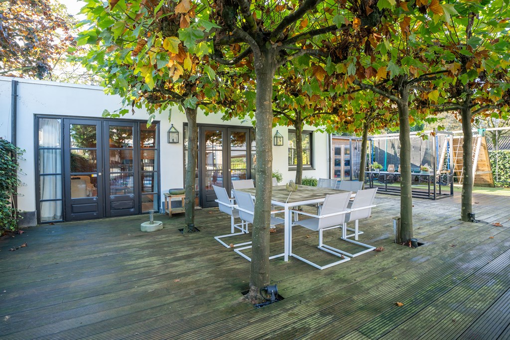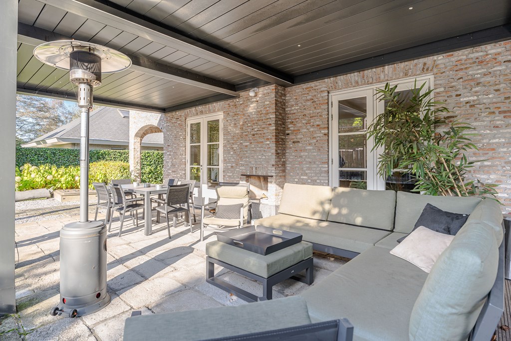 Dit is dé ideale tuin voor iedereen die van zowel het buitenleven als luxe en comfort houdt. Tegen de achtergevels is een mooie veranda geplaatst met open haard, verlichting en elektra. Deze open veranda is als het ware een schakel tussen de woonkamer en de tuin.
