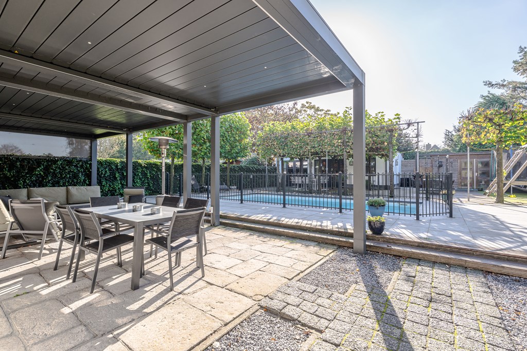 De absolute parel van deze tuin is de bijzonder luxe poolhouse. Dit bijgebouw is werkelijk van alle gemakken voorzien. Zo is er een prachtige leefruimte met een gezellige bar, een derde badkamer met inloopdouche en dubbele wastafel met meubel, een toiletruimte en een technische ruimte t.b.v. de zwembadinstallatie.