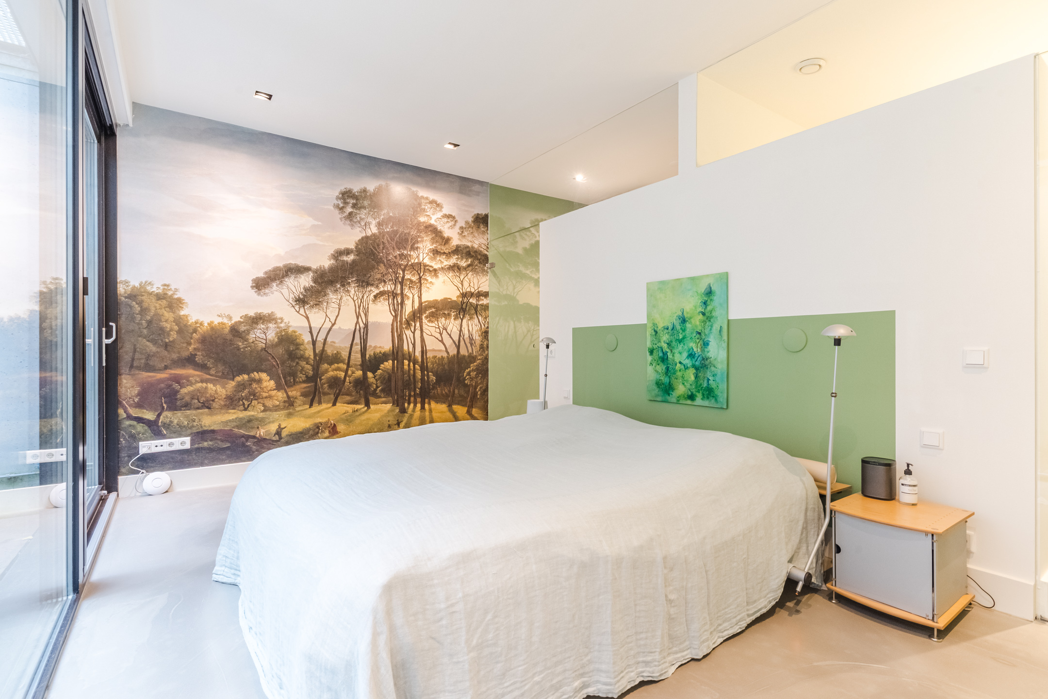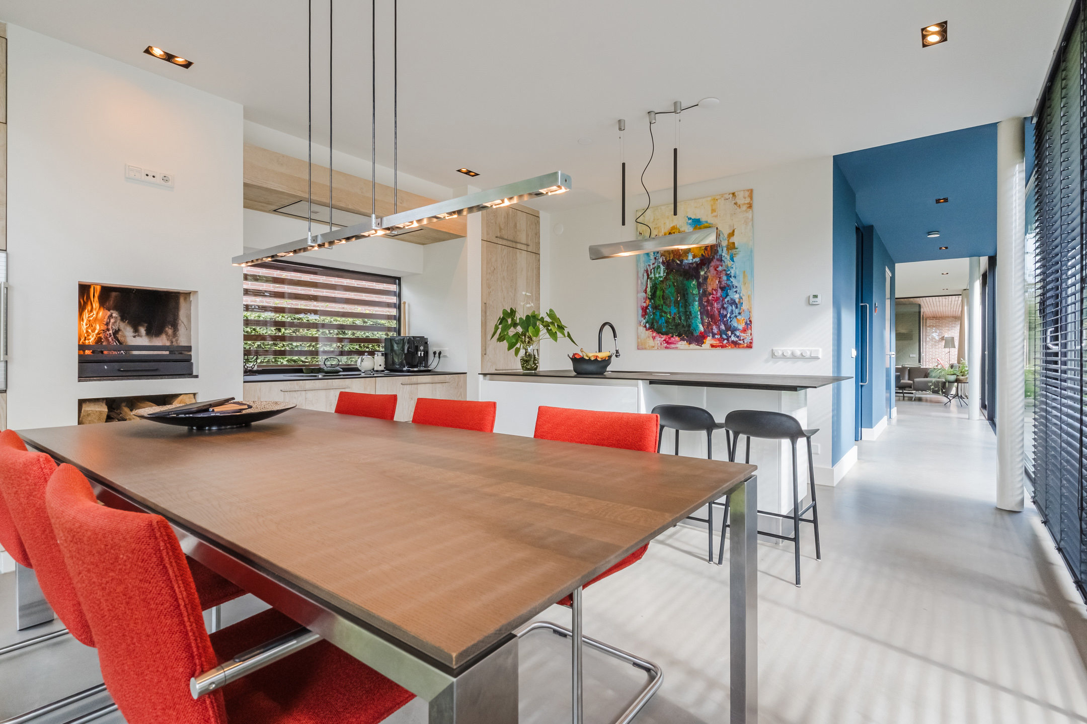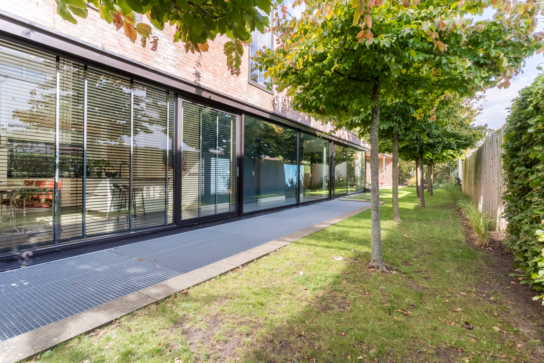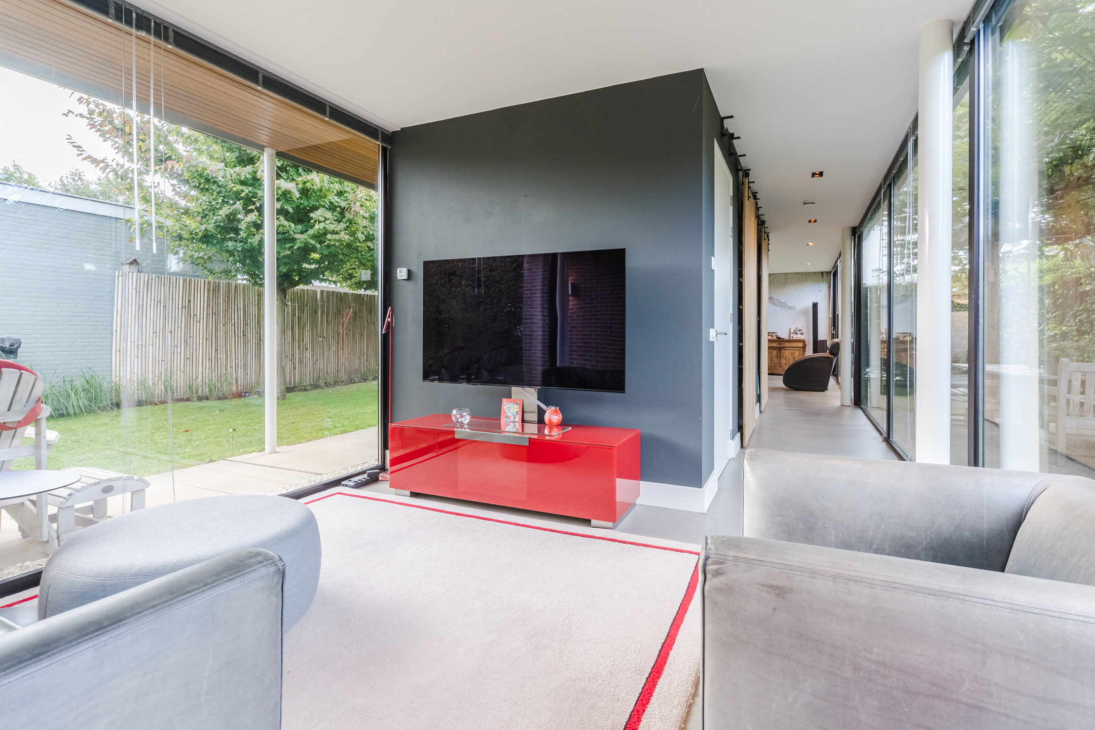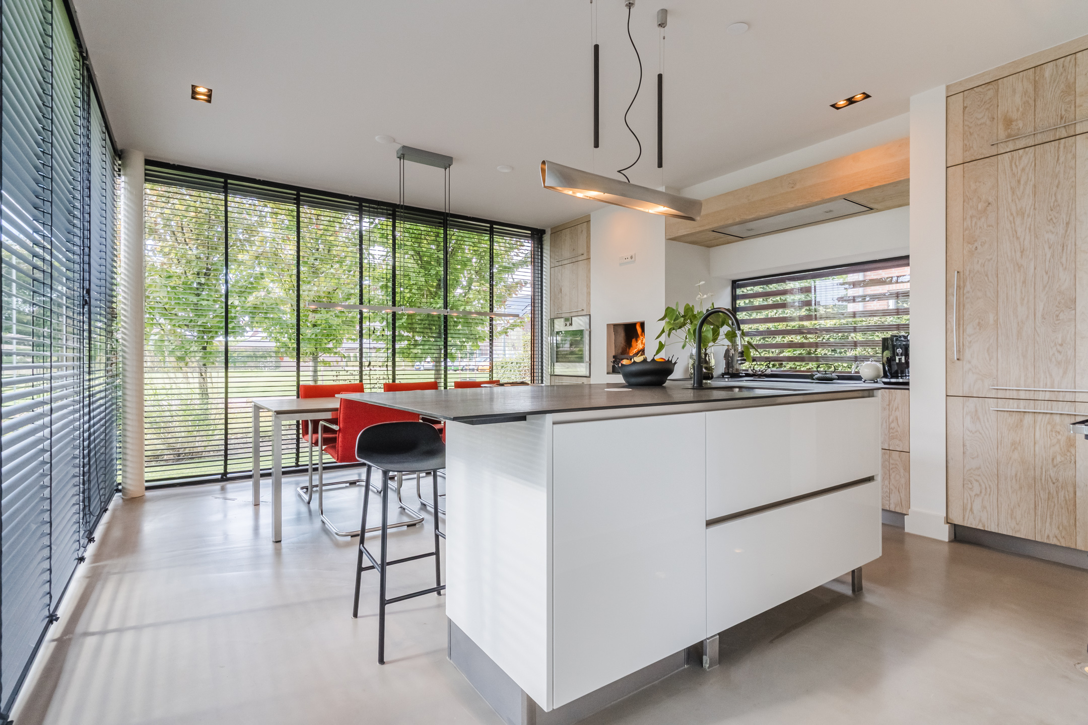 تتدفق المساحات الرئيسية بأجواء تشبه الدور العلوي: أسقف عالية، ونوافذ تمتد من الأرض حتى السقف، وانتقالات سلسة إلى التراسات الخارجية. في الطابق الأرضي، اكتشف أكثر من 100 م² مصممة لتعزيز التواصل والهدوء، بدءاً من مطبخ المعيشة المفتوح المجهز بغسالة صحون من Gaggenau وثلاجة عريضة، وصولاً إلى الصالات المضيئة وغرفة متعددة الاستخدامات تصلح للاستوديو أو المكتب. تحافظ كل مساحة على تواصل بصري مع الحديقة الواقعة جنوب شرق المنزل والتراس المغطى، حيث ينمو شجر بمهارة عبر فتحة مميزة في السقف.