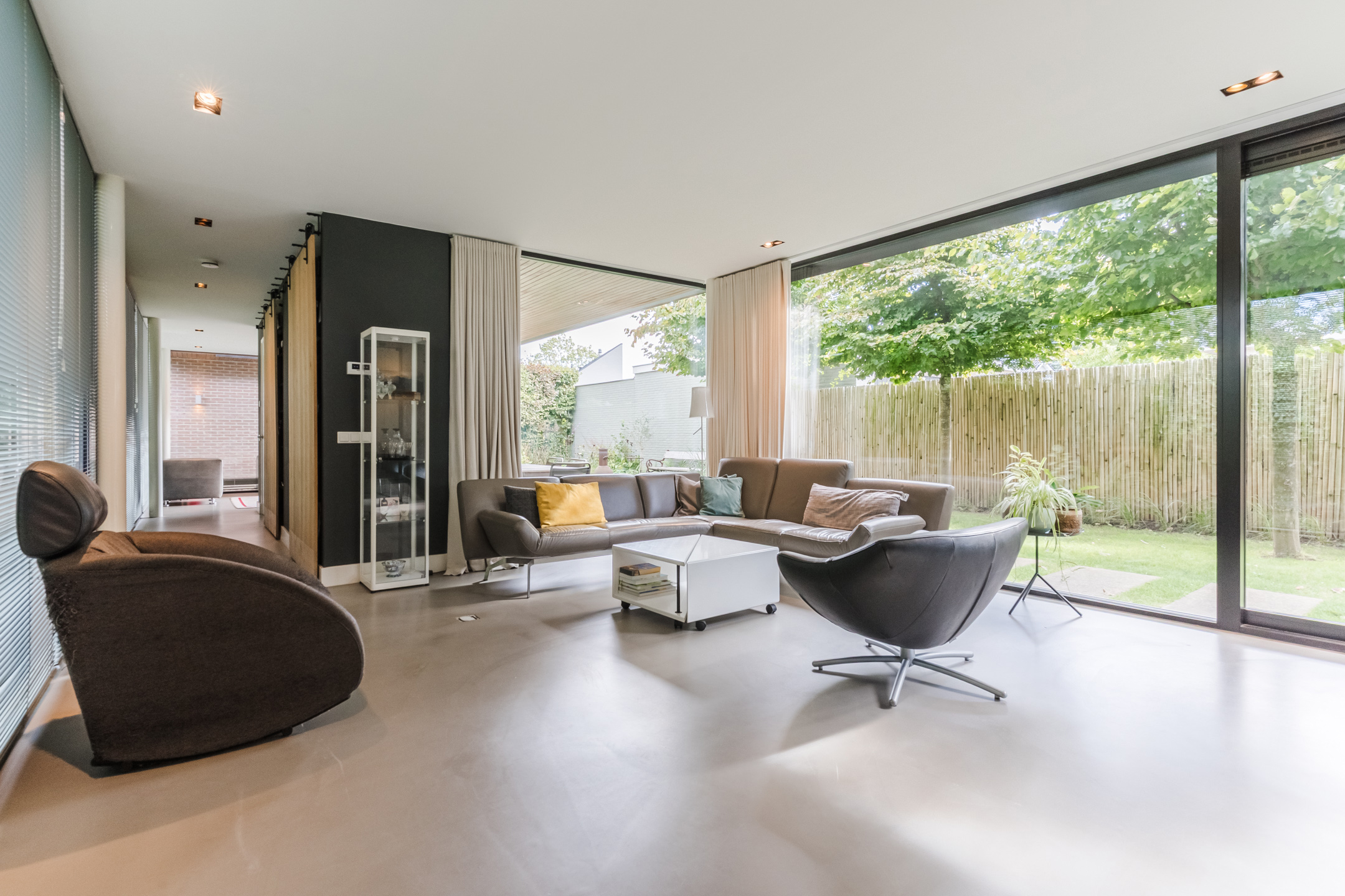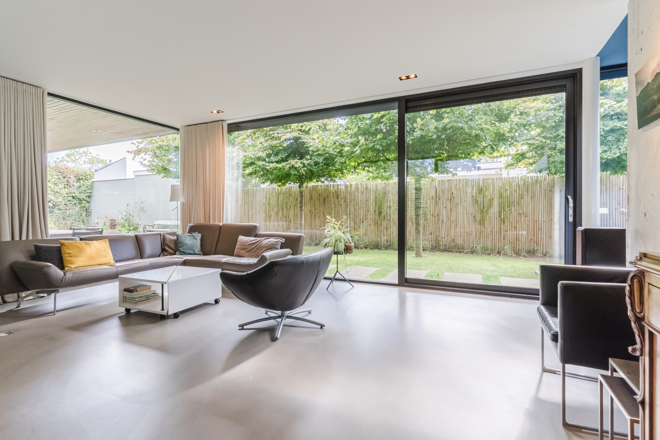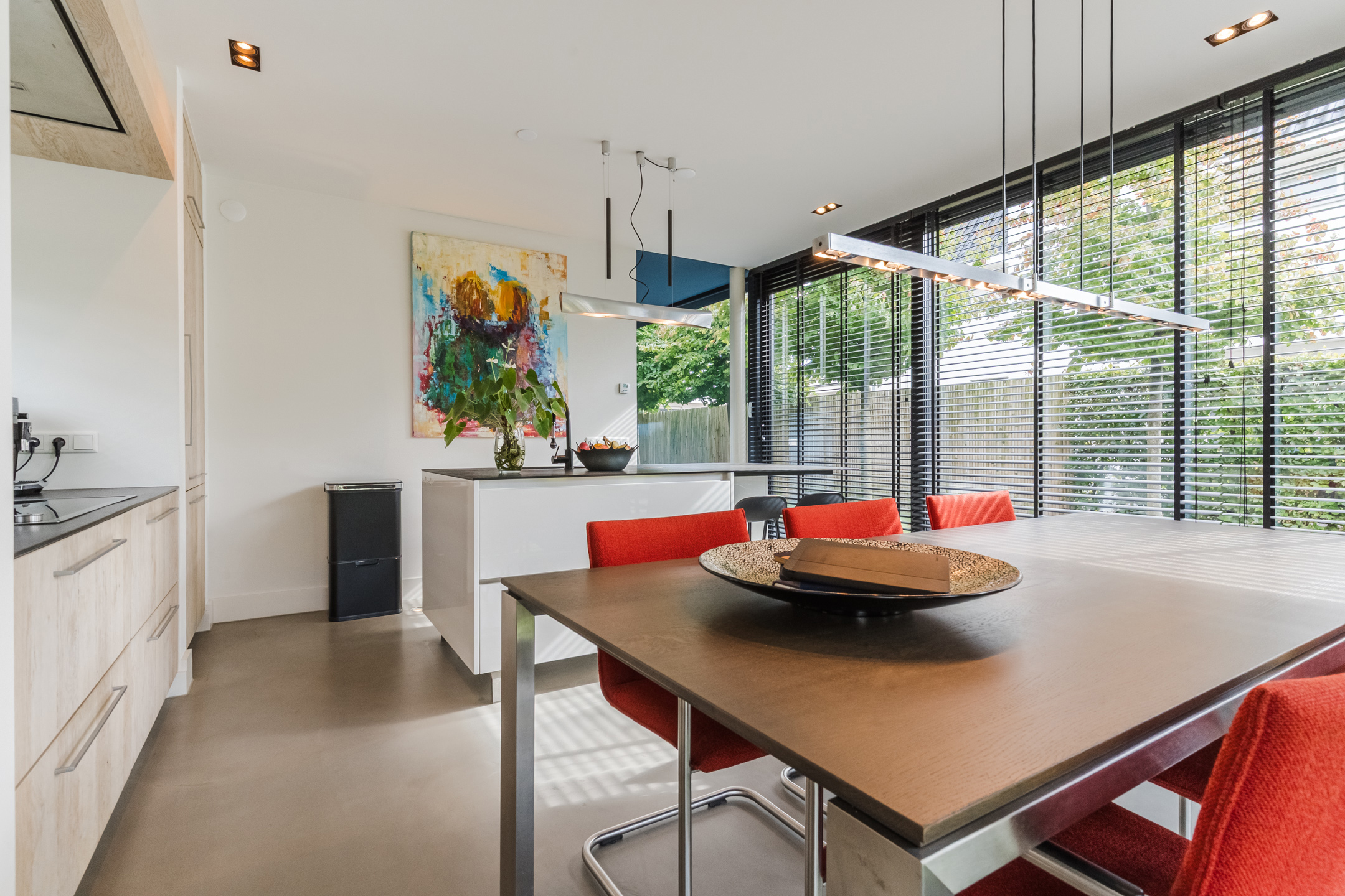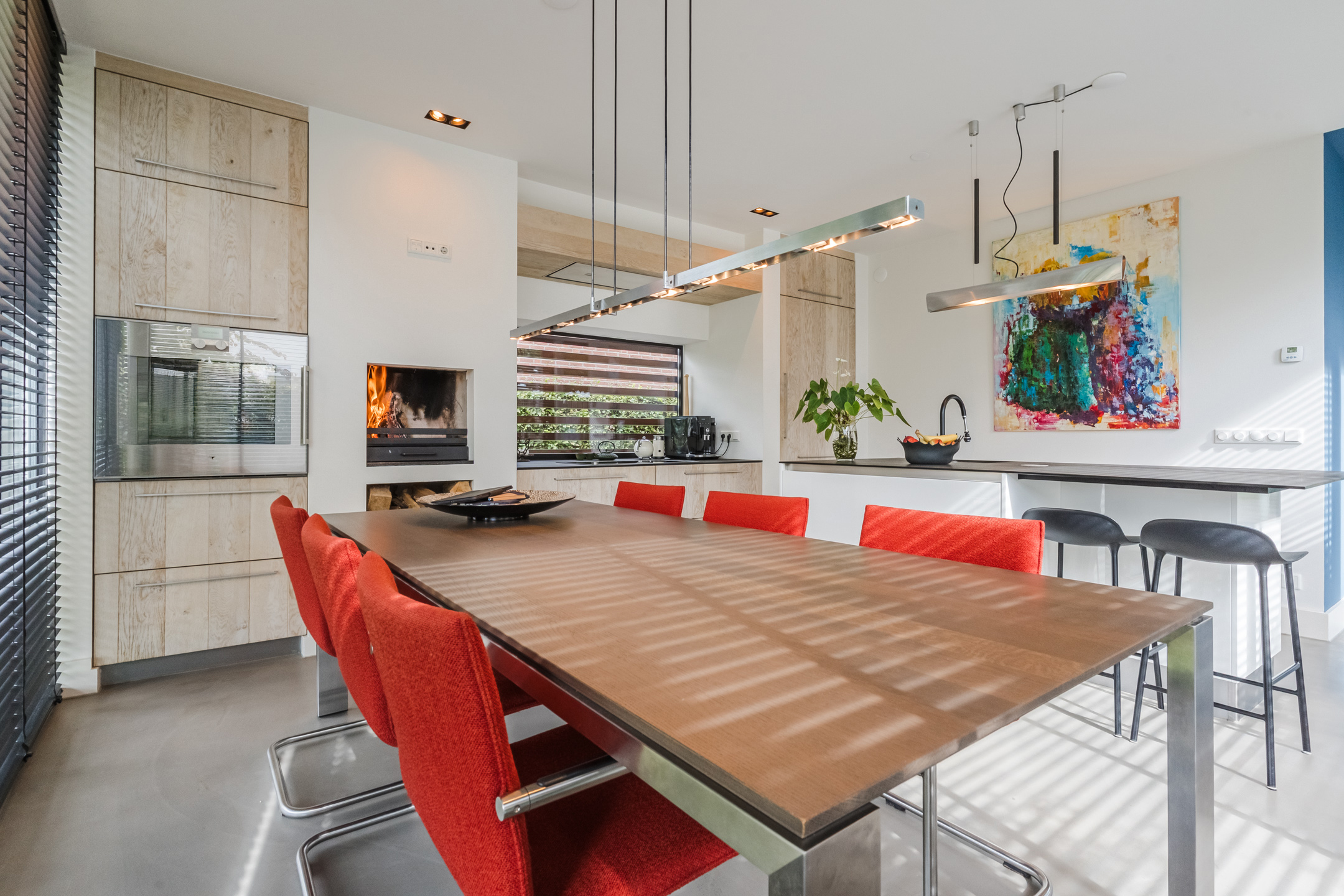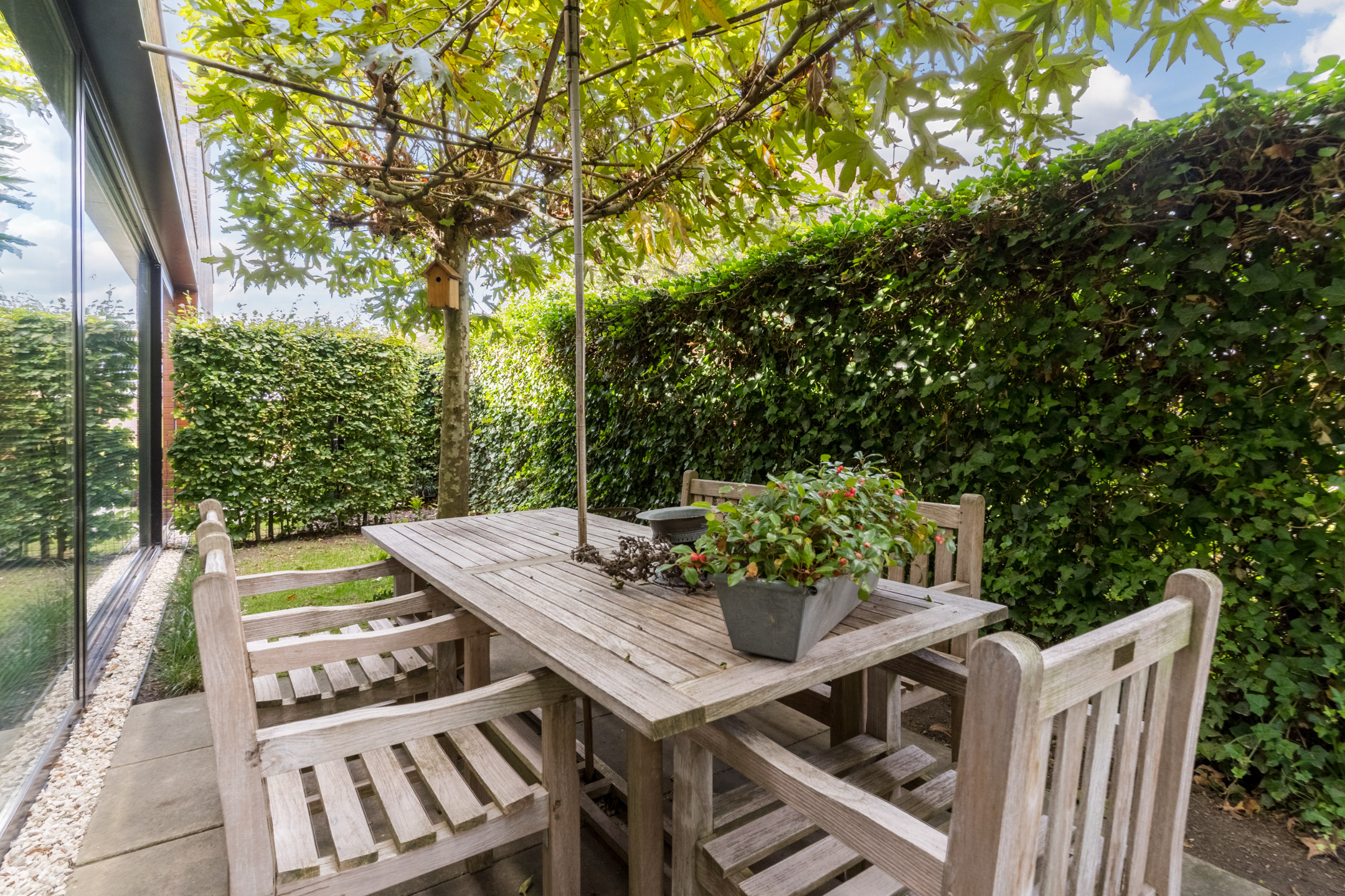 تتدفق المساحات الرئيسية بأجواء تشبه الدور العلوي: أسقف عالية، ونوافذ تمتد من الأرض حتى السقف، وانتقالات سلسة إلى التراسات الخارجية. في الطابق الأرضي، اكتشف أكثر من 100 م² مصممة لتعزيز التواصل والهدوء، بدءاً من مطبخ المعيشة المفتوح المجهز بغسالة صحون من Gaggenau وثلاجة عريضة، وصولاً إلى الصالات المضيئة وغرفة متعددة الاستخدامات تصلح للاستوديو أو المكتب. تحافظ كل مساحة على تواصل بصري مع الحديقة الواقعة جنوب شرق المنزل والتراس المغطى، حيث ينمو شجر بمهارة عبر فتحة مميزة في السقف.