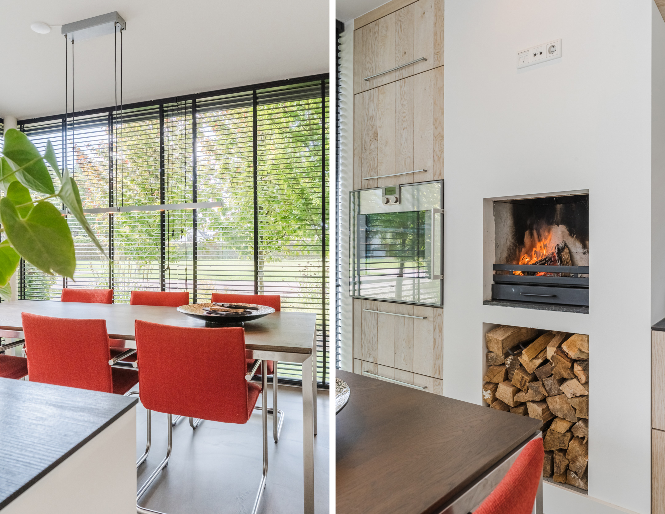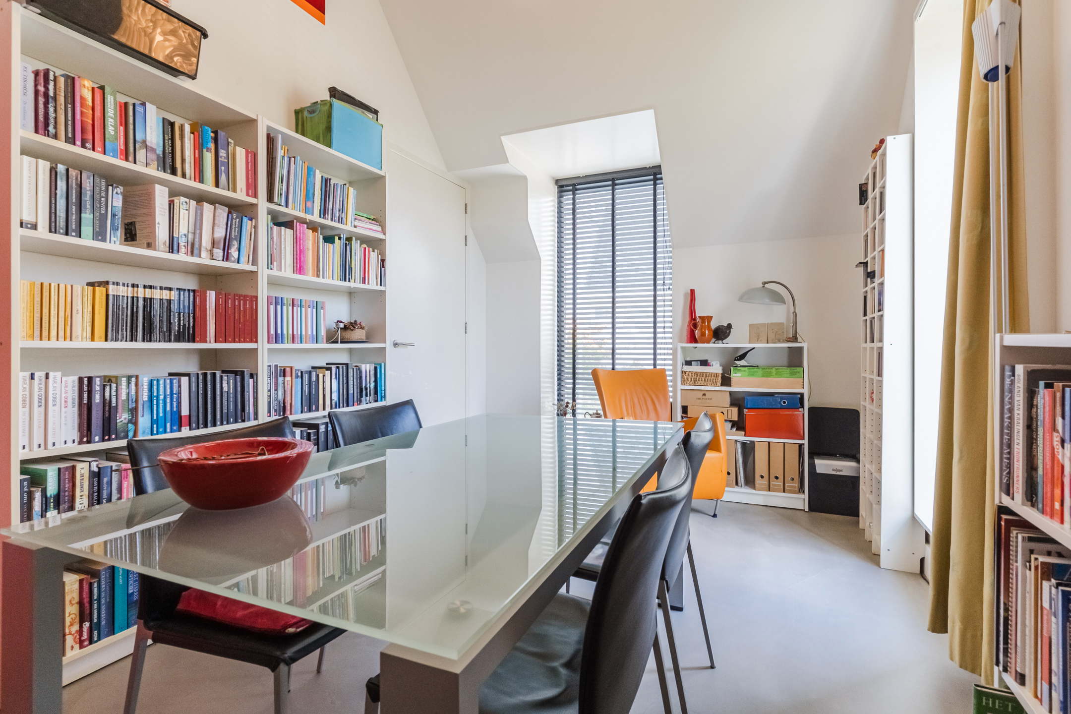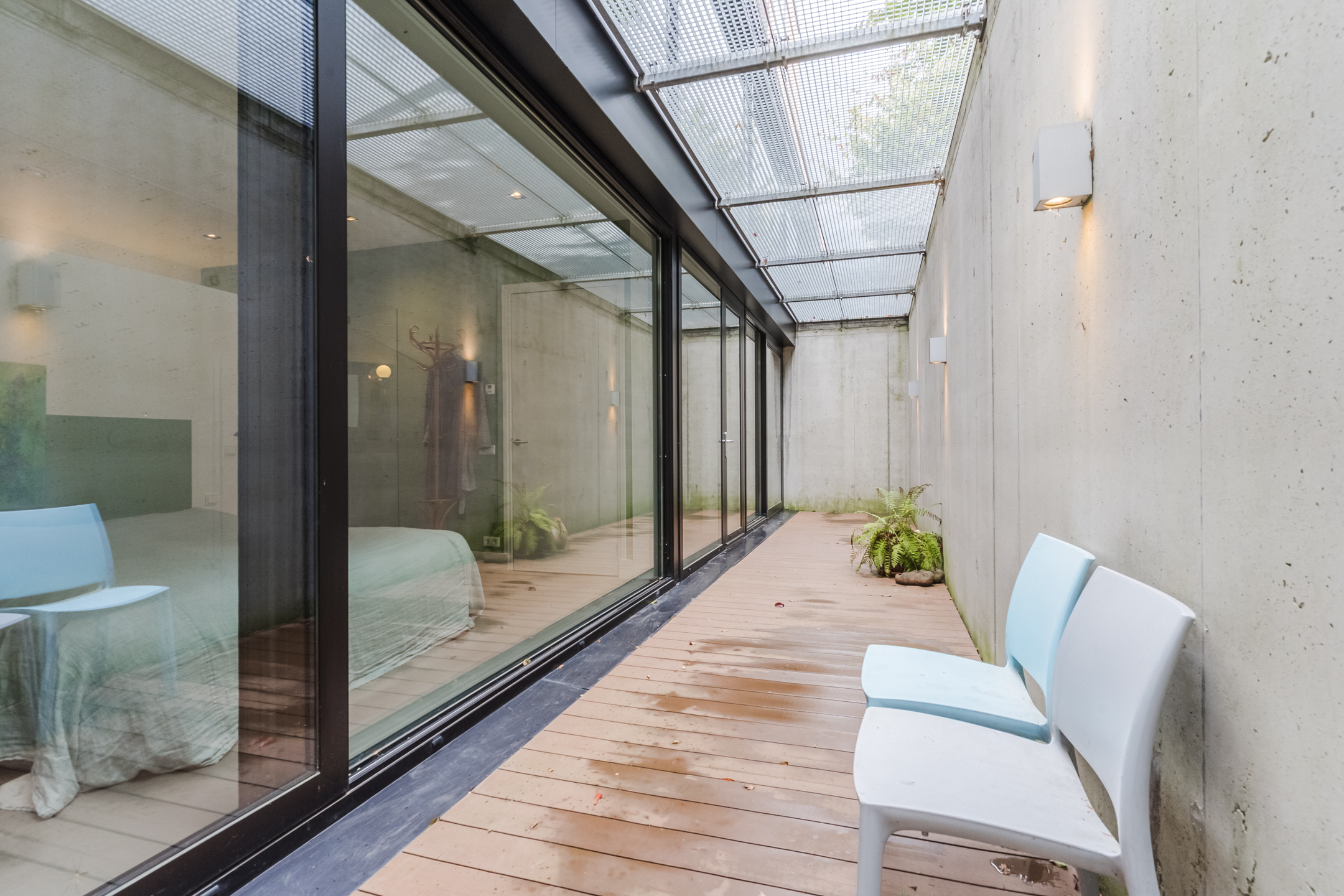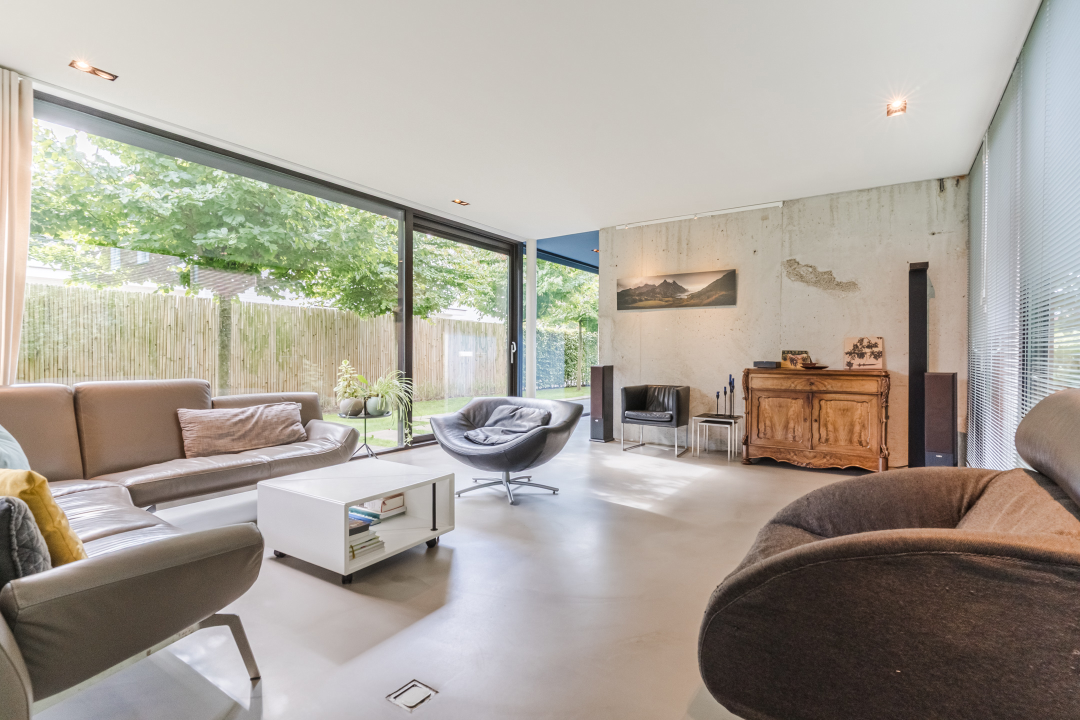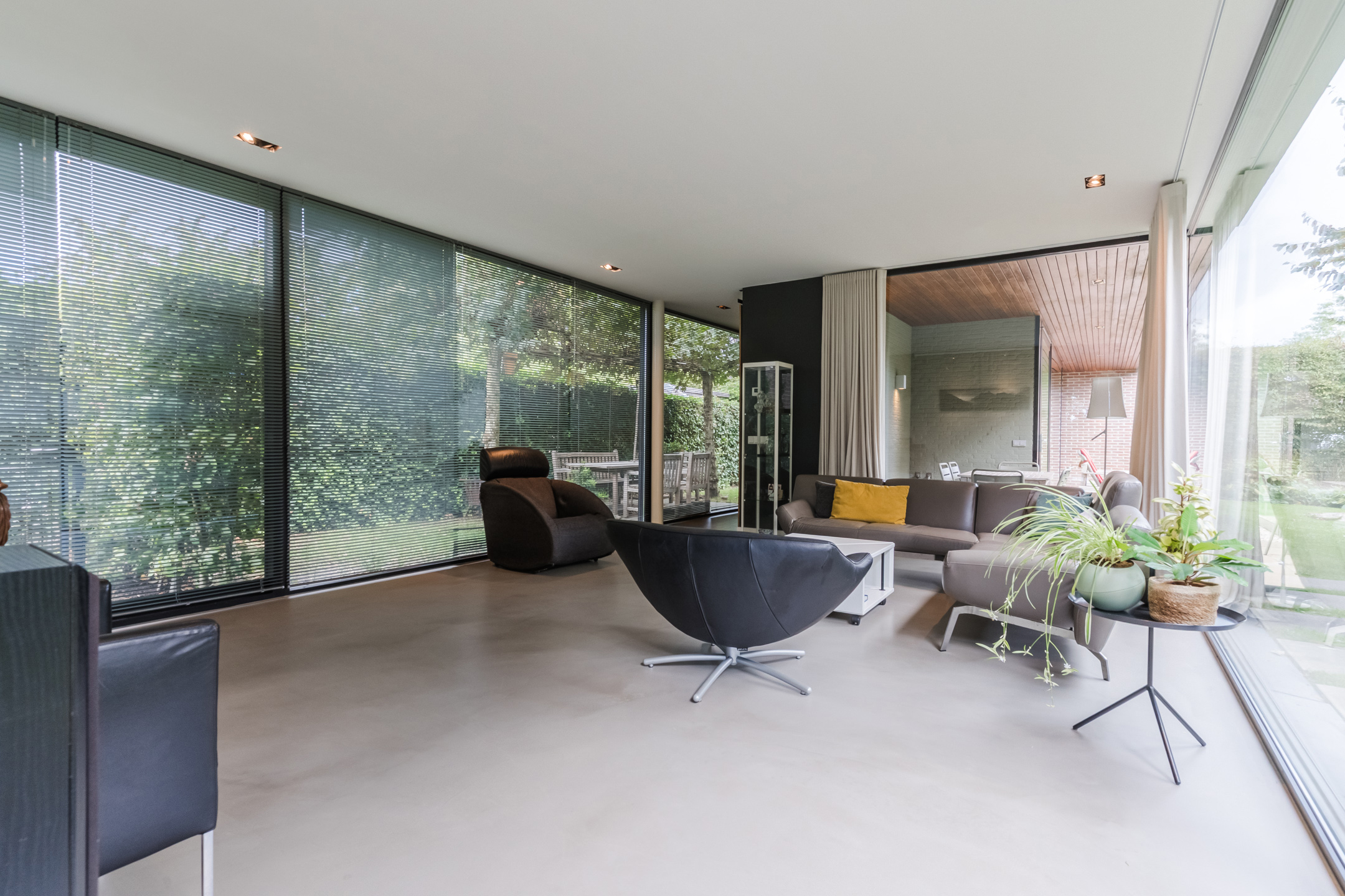 تتدفق المساحات الرئيسية بأجواء تشبه الدور العلوي: أسقف عالية، ونوافذ تمتد من الأرض حتى السقف، وانتقالات سلسة إلى التراسات الخارجية. في الطابق الأرضي، اكتشف أكثر من 100 م² مصممة لتعزيز التواصل والهدوء، بدءاً من مطبخ المعيشة المفتوح المجهز بغسالة صحون من Gaggenau وثلاجة عريضة، وصولاً إلى الصالات المضيئة وغرفة متعددة الاستخدامات تصلح للاستوديو أو المكتب. تحافظ كل مساحة على تواصل بصري مع الحديقة الواقعة جنوب شرق المنزل والتراس المغطى، حيث ينمو شجر بمهارة عبر فتحة مميزة في السقف.