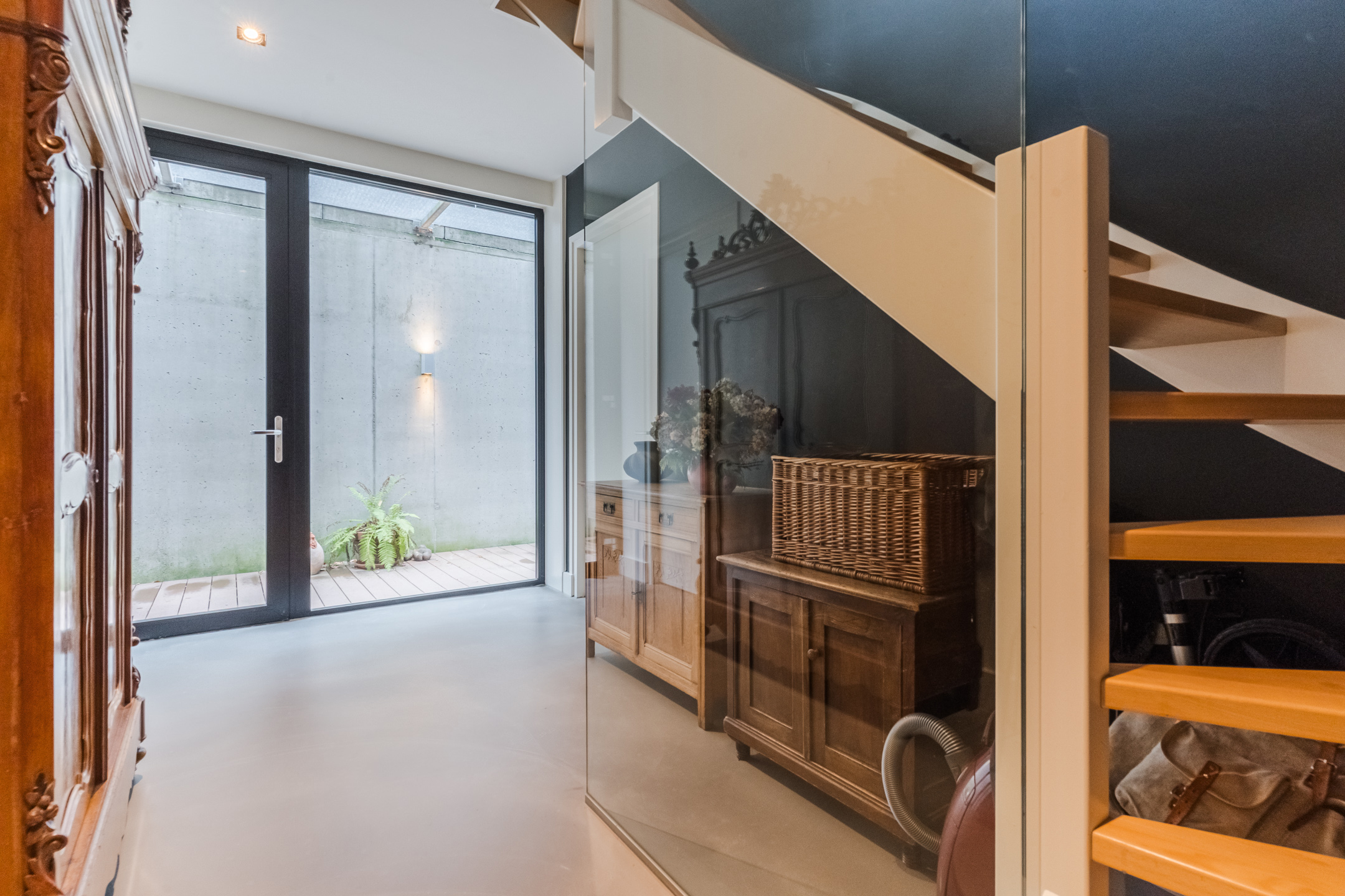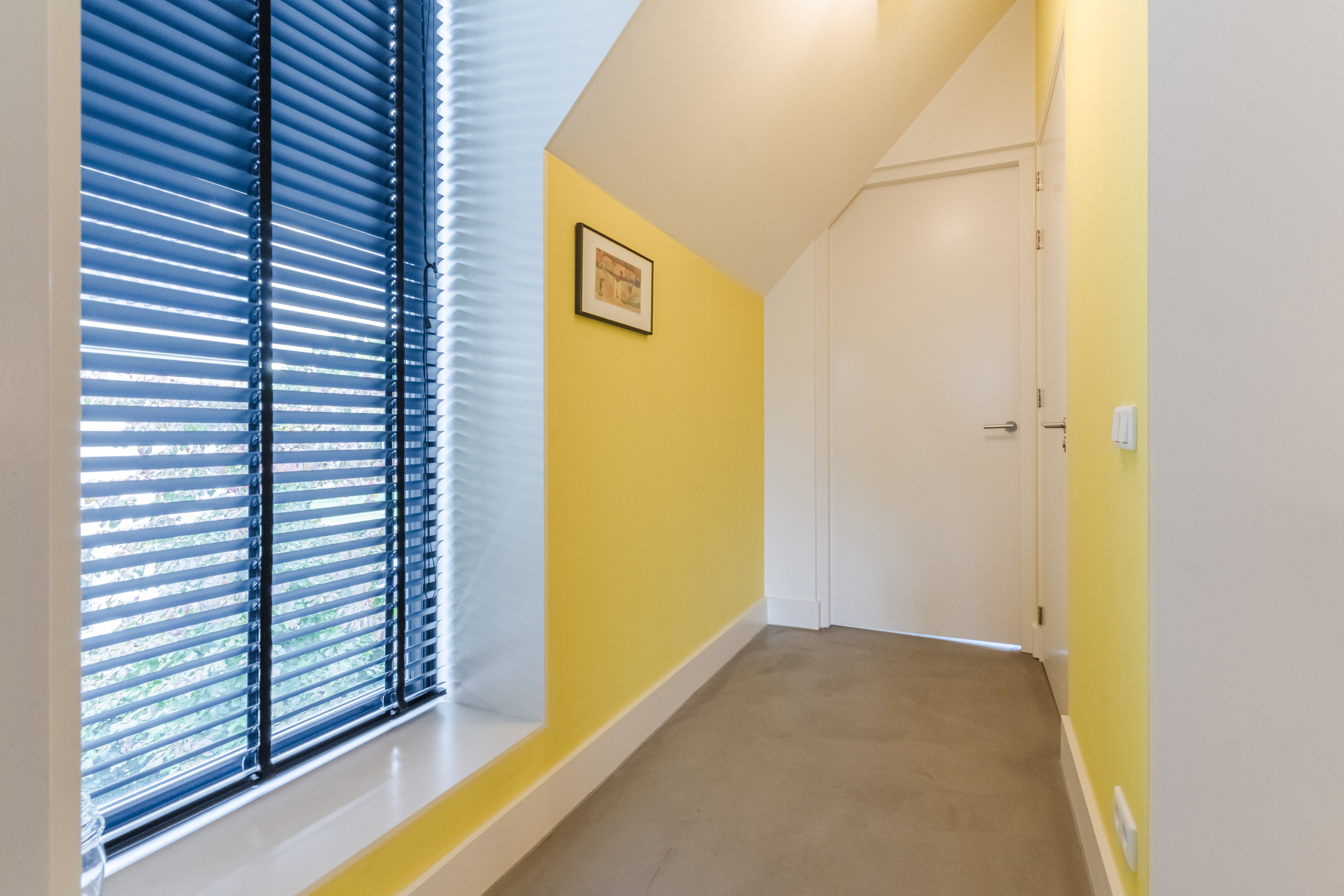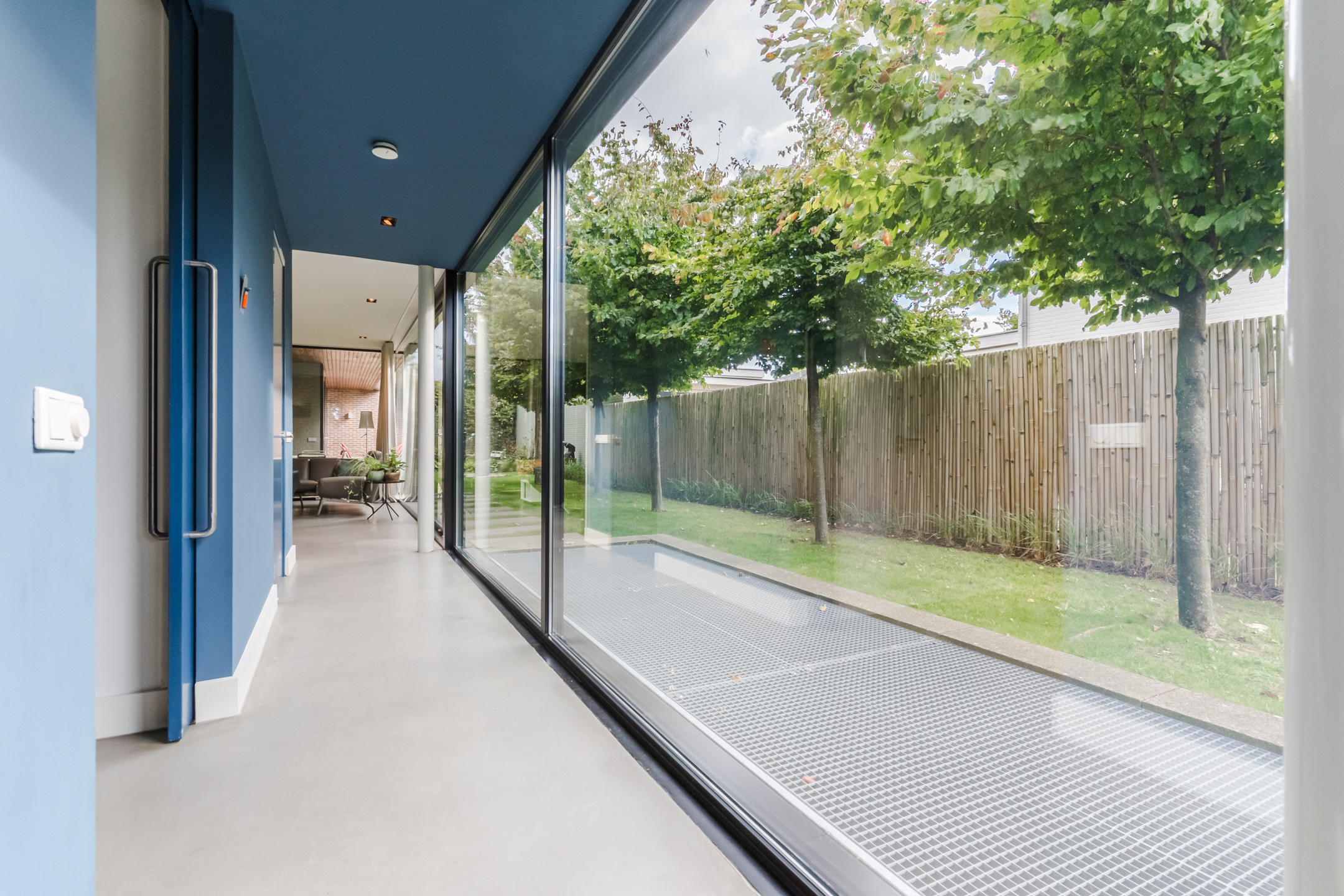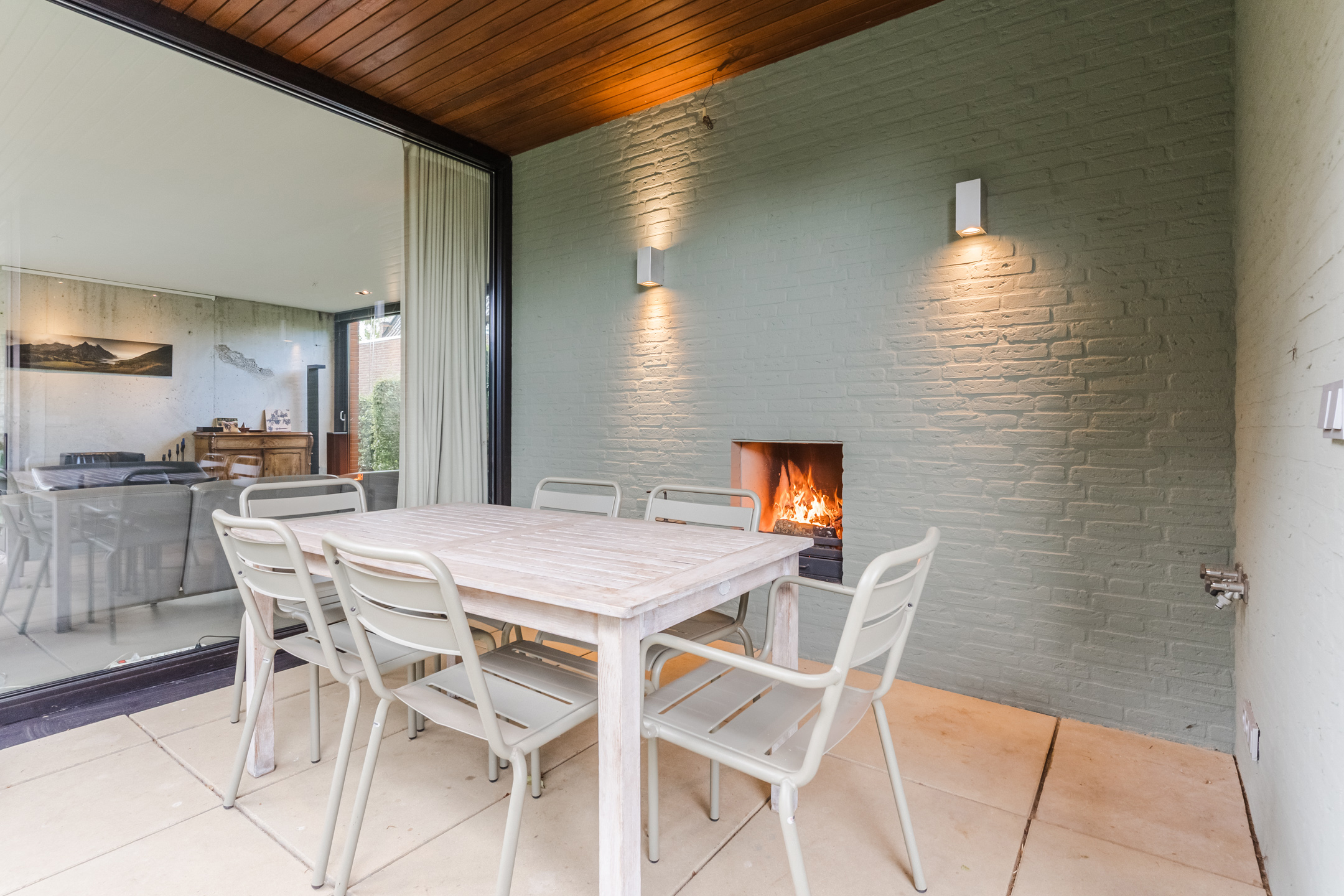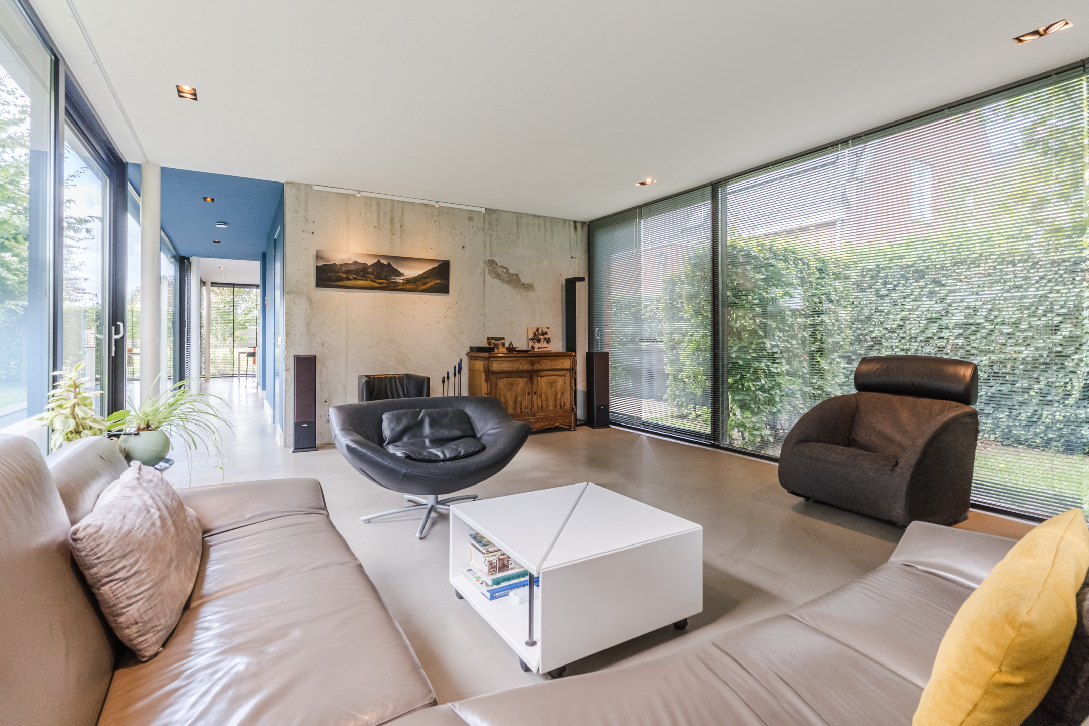 تتدفق المساحات الرئيسية بأجواء تشبه الدور العلوي: أسقف عالية، ونوافذ تمتد من الأرض حتى السقف، وانتقالات سلسة إلى التراسات الخارجية. في الطابق الأرضي، اكتشف أكثر من 100 م² مصممة لتعزيز التواصل والهدوء، بدءاً من مطبخ المعيشة المفتوح المجهز بغسالة صحون من Gaggenau وثلاجة عريضة، وصولاً إلى الصالات المضيئة وغرفة متعددة الاستخدامات تصلح للاستوديو أو المكتب. تحافظ كل مساحة على تواصل بصري مع الحديقة الواقعة جنوب شرق المنزل والتراس المغطى، حيث ينمو شجر بمهارة عبر فتحة مميزة في السقف.