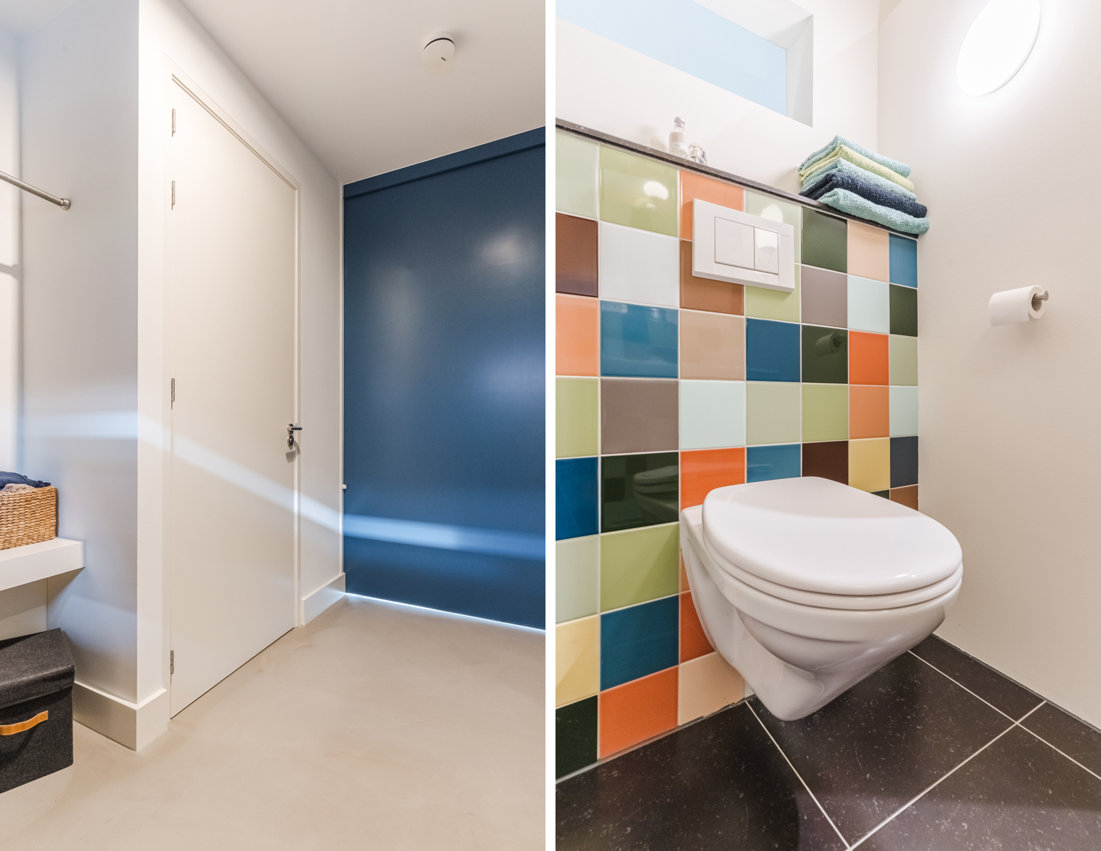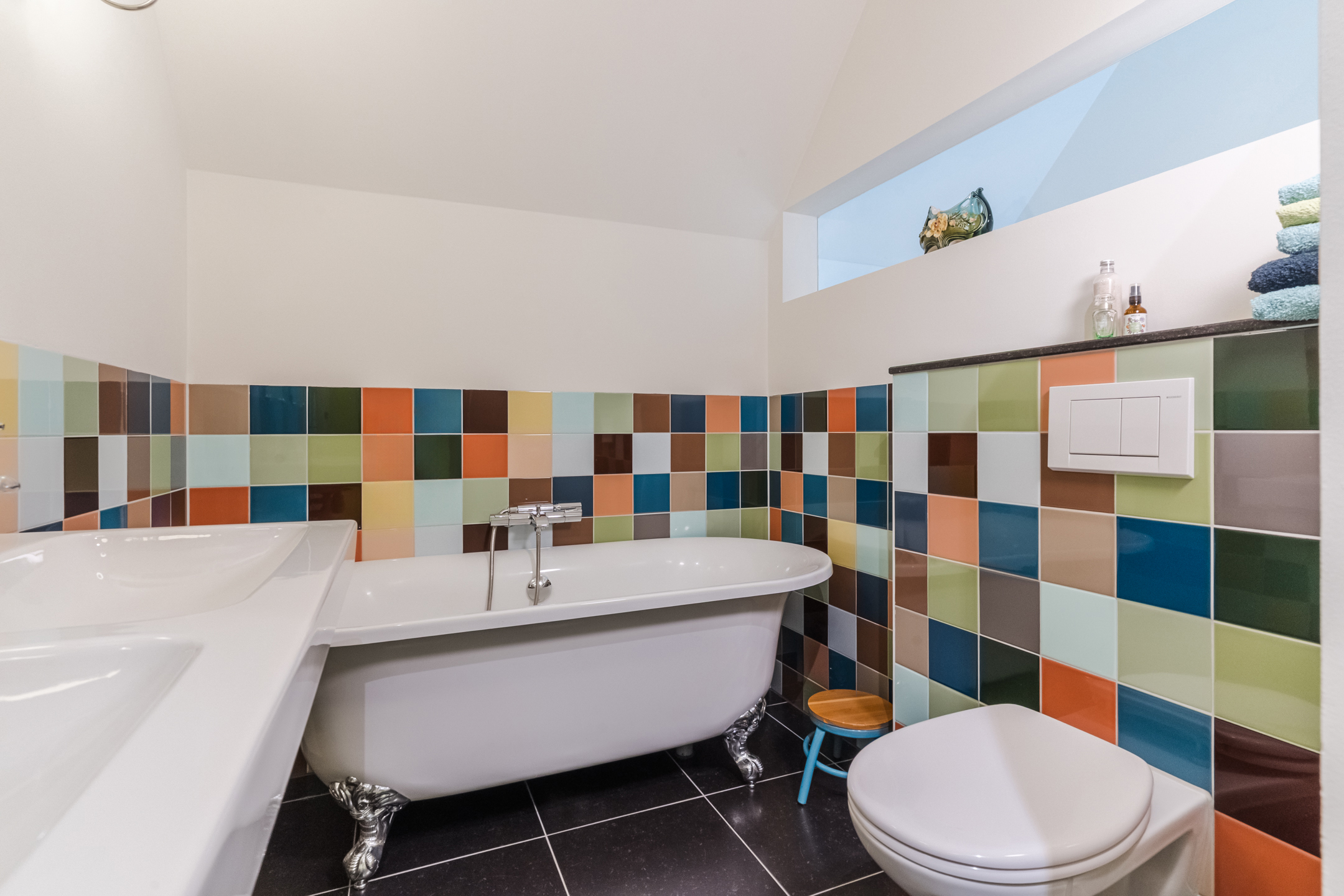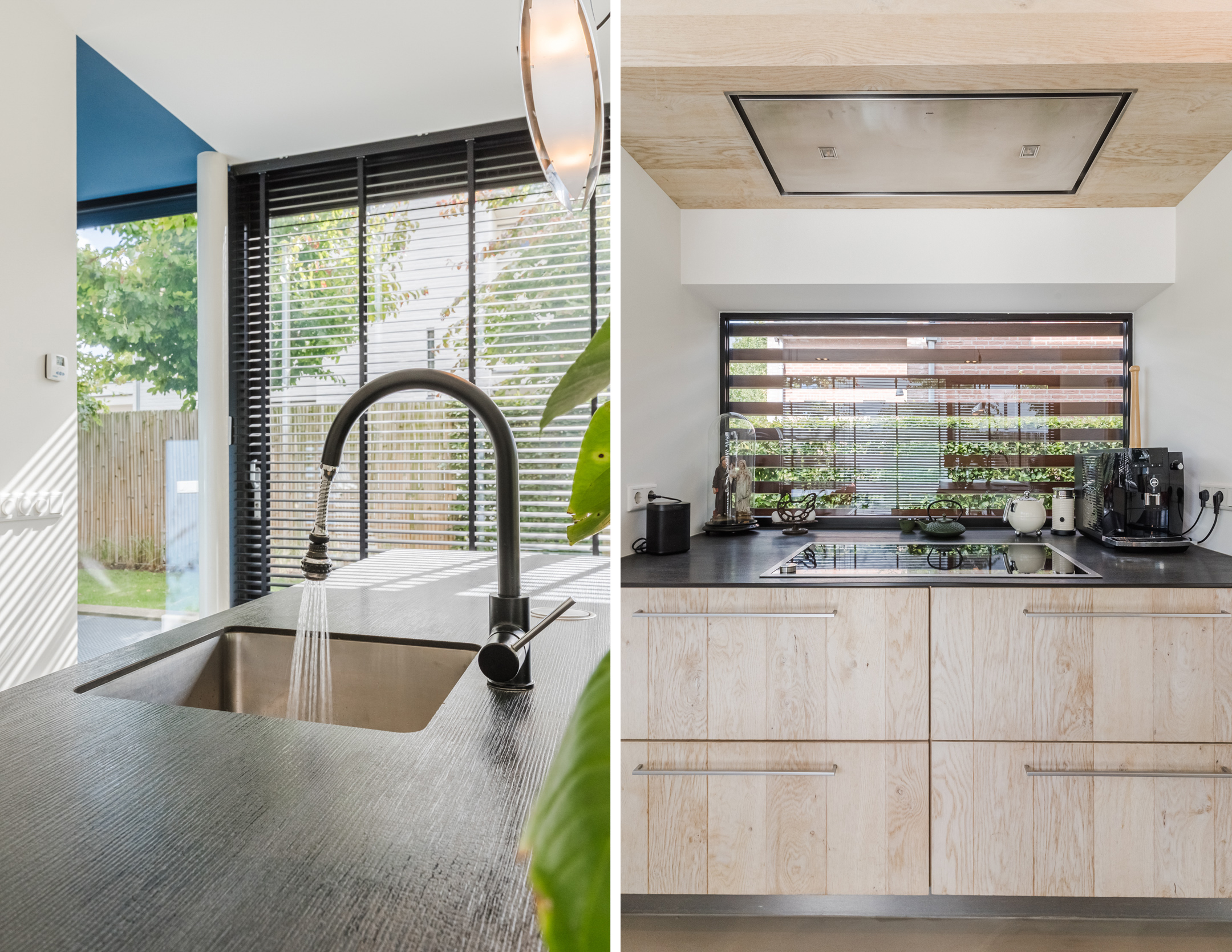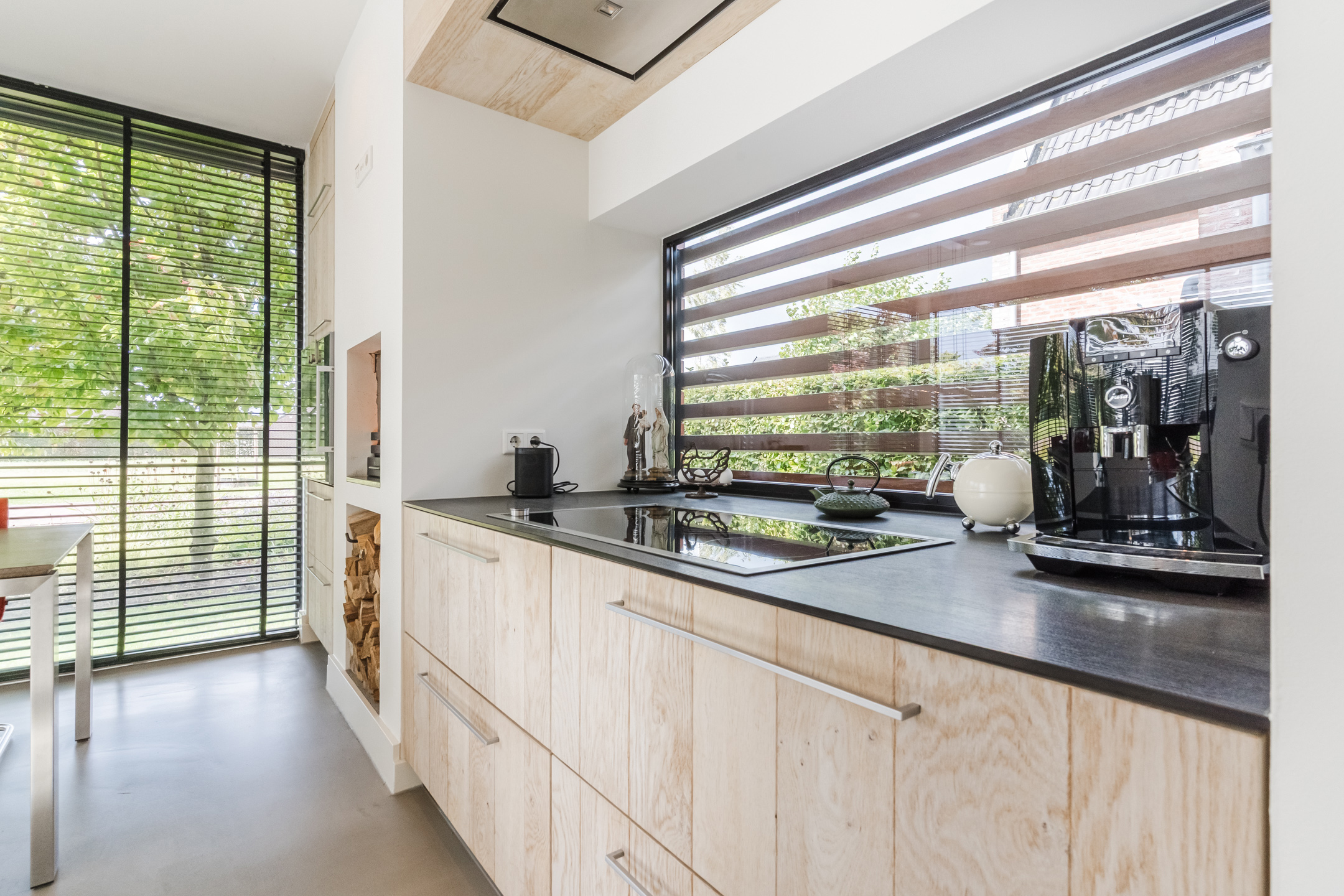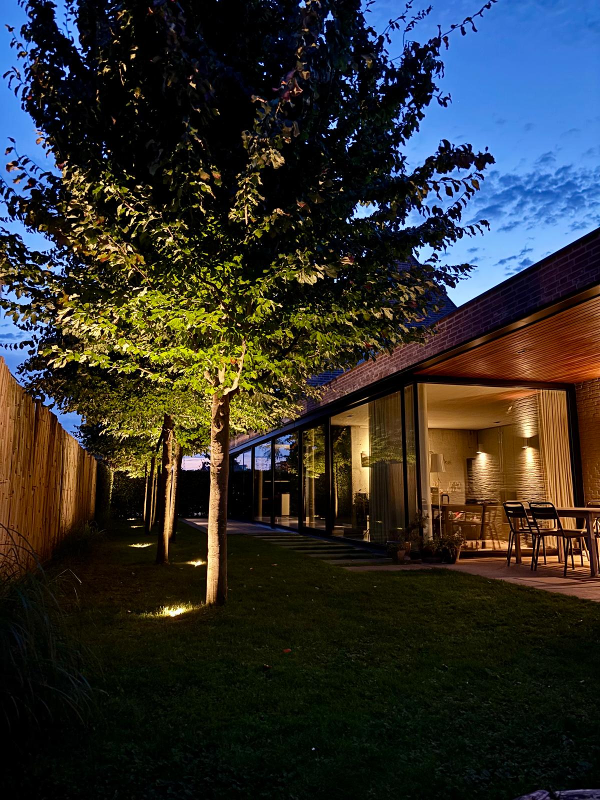 تتدفق المساحات الرئيسية بأجواء تشبه الدور العلوي: أسقف عالية، ونوافذ تمتد من الأرض حتى السقف، وانتقالات سلسة إلى التراسات الخارجية. في الطابق الأرضي، اكتشف أكثر من 100 م² مصممة لتعزيز التواصل والهدوء، بدءاً من مطبخ المعيشة المفتوح المجهز بغسالة صحون من Gaggenau وثلاجة عريضة، وصولاً إلى الصالات المضيئة وغرفة متعددة الاستخدامات تصلح للاستوديو أو المكتب. تحافظ كل مساحة على تواصل بصري مع الحديقة الواقعة جنوب شرق المنزل والتراس المغطى، حيث ينمو شجر بمهارة عبر فتحة مميزة في السقف.