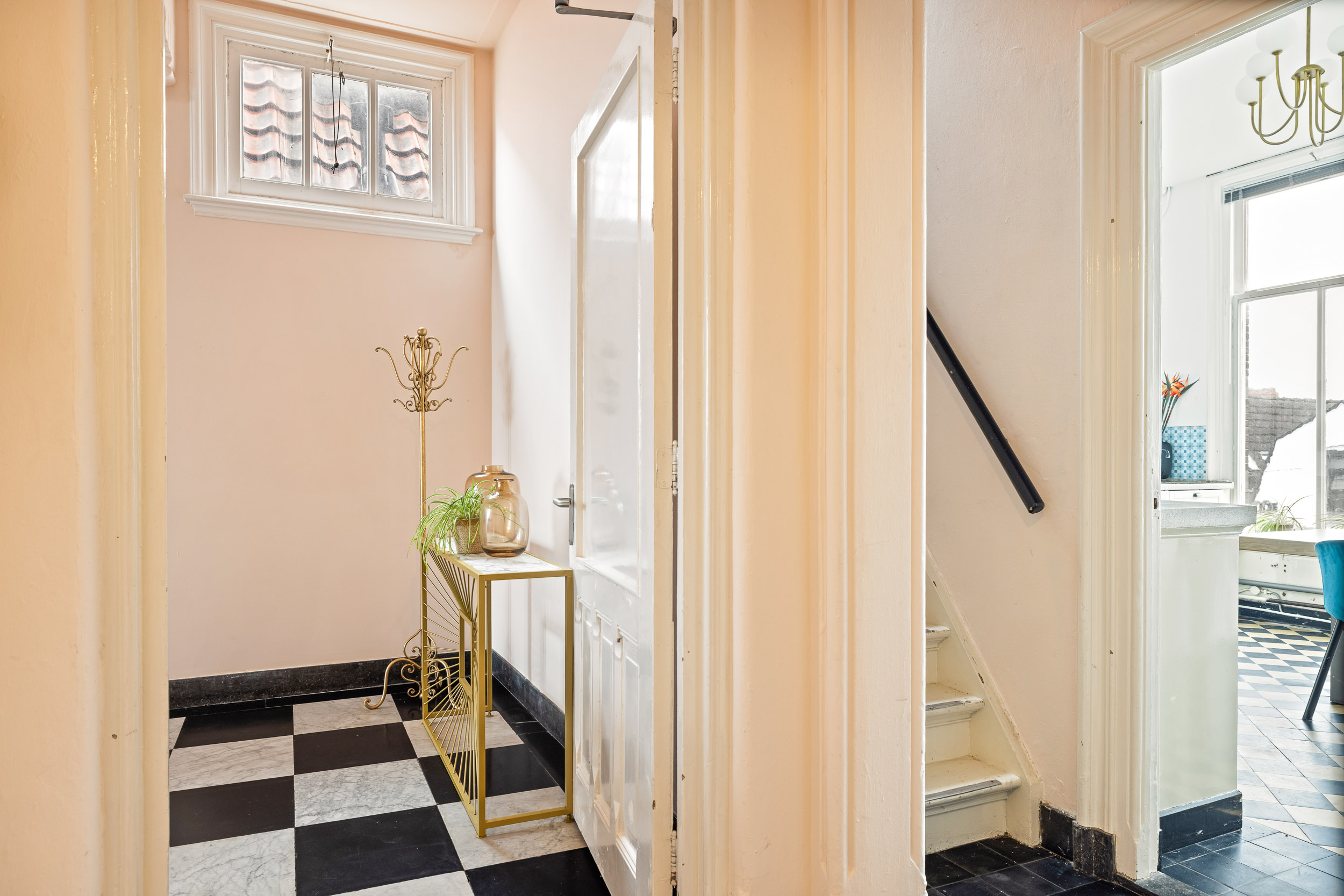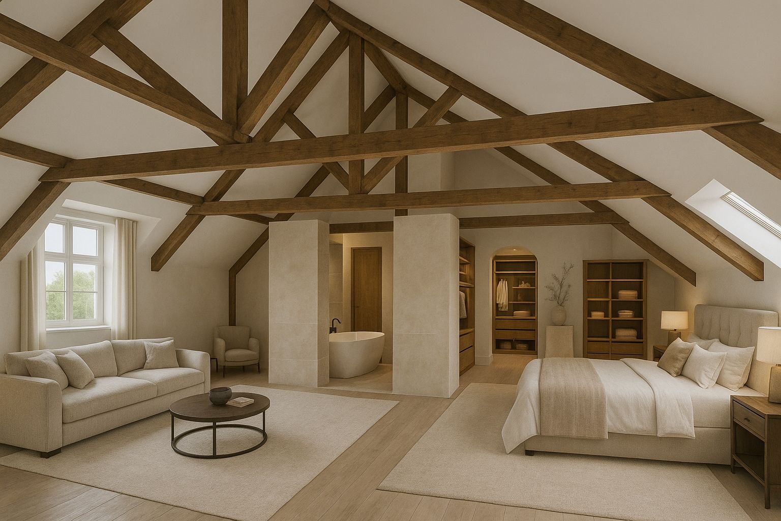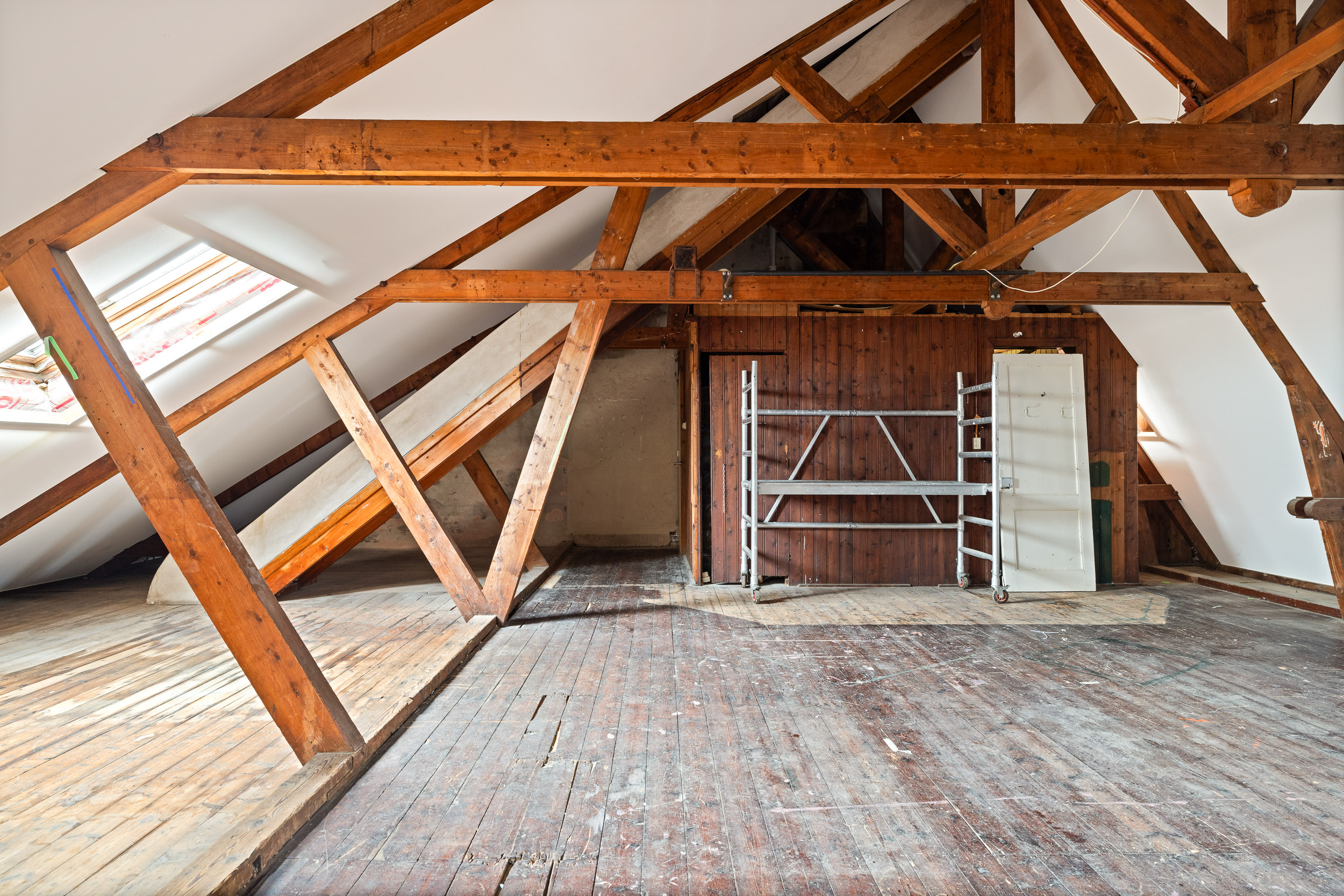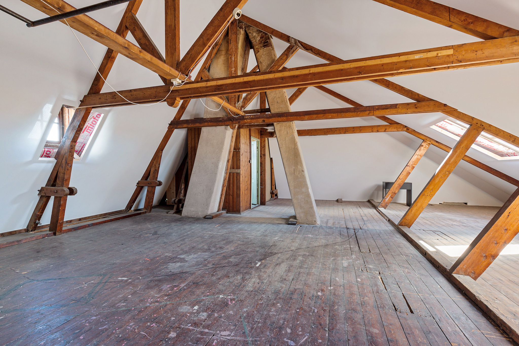 تصعد سلم أثري إلى الطابق الأول، حيث تضم القاعات المتتالية أبواباً منزلقة بتجهيزات نحاسية تاريخية، وأرضيات باركيه ومدفأة أصلية من الرخام الأسود. تمتد غرفة المعيشة إلى تراس سطح رحب بمساحة 45 م²، بينما تعكس مطبخ إضافي وغرفتي نوم المحافظة المستمرة على الإرث والاستقرار الهيكلي. يضم الطابق الثاني علية مفتوحة بمساحة 85 م² بإطارات خشبية قوية، توفر سقفاً عالياً وإمكانية تحويلها لمشغل أو شقة مستقبلاً.