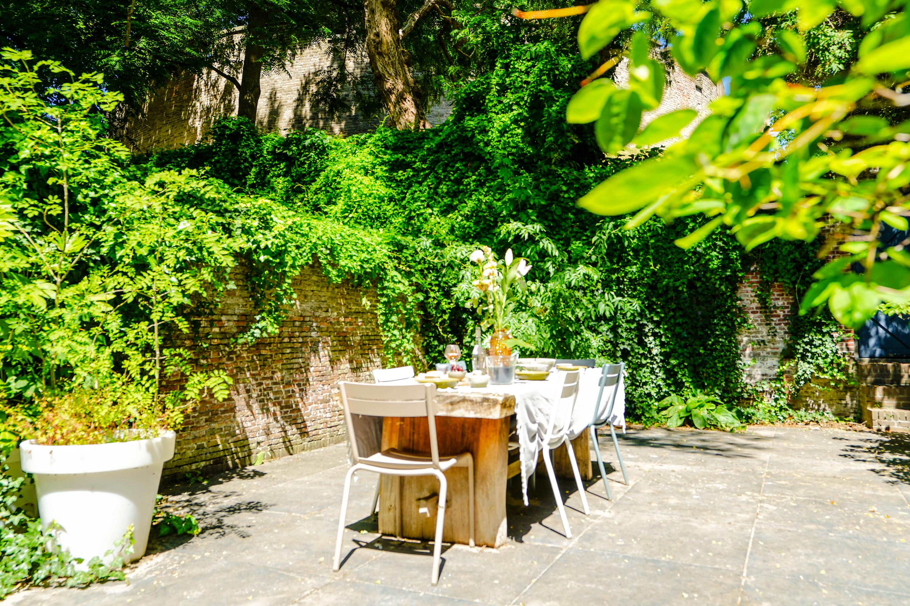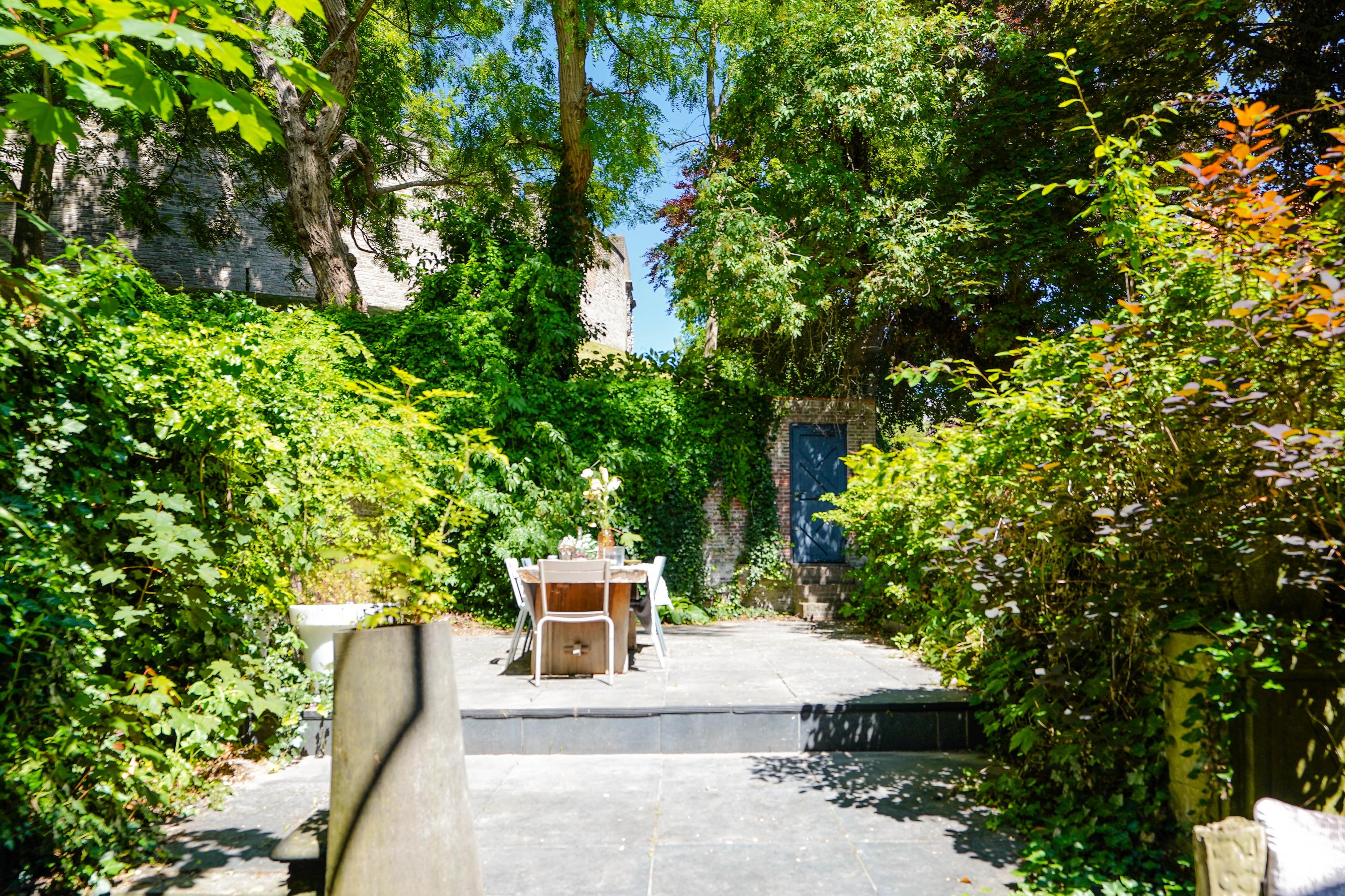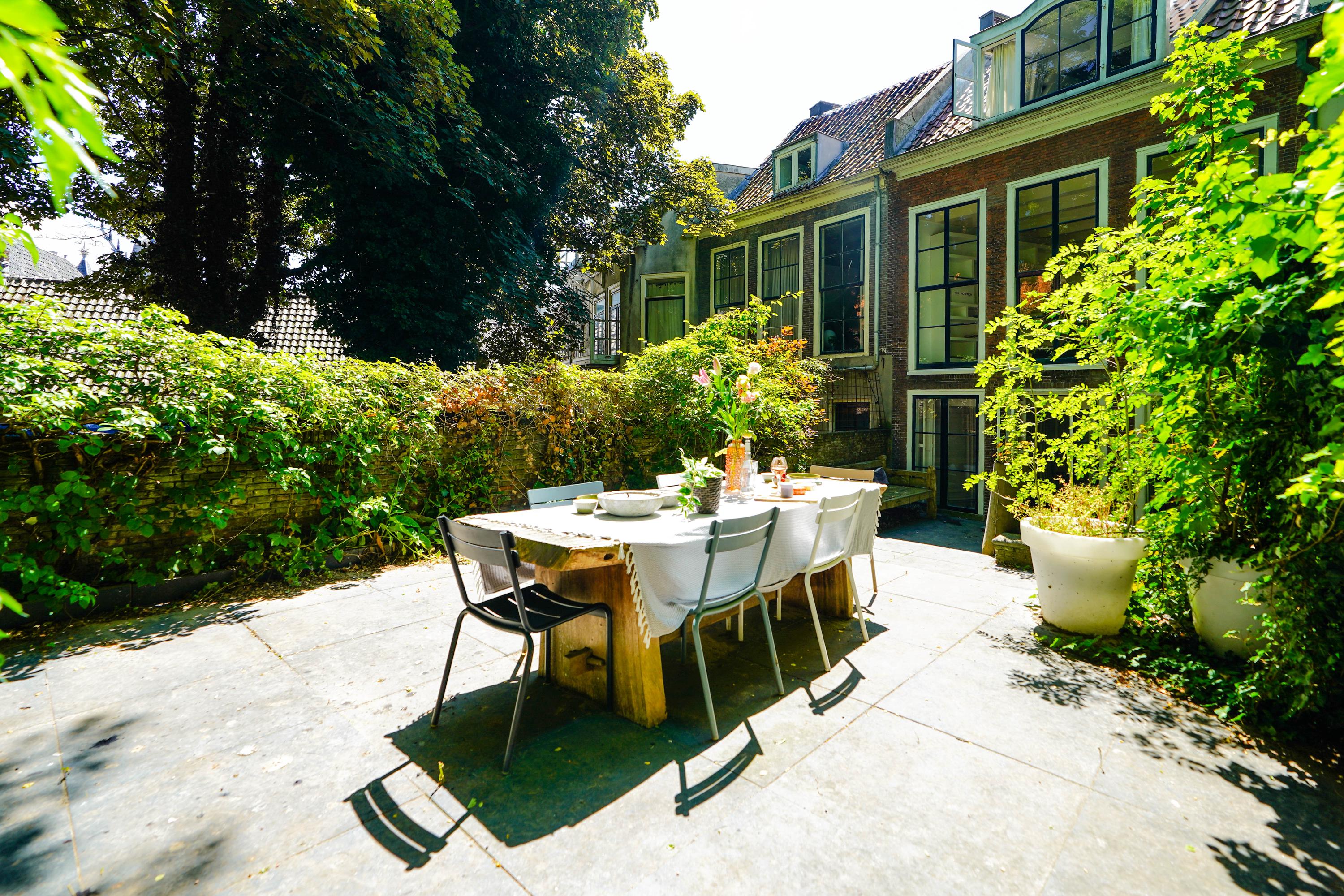 يرتبط المبنى الخلفي بسلاسة مع الحديقة التي تشكل بذاتها واحة داخل قلب لايدن المحمي من العصور الوسطى. صممت الحديقة للجمع بين الخصوصية والاجتماعية، وتضم غرفة حديقة في الطابق الأرضي مع مطبخ إضافي، وغرفة معيشة ثانية بارتفاع شاهق وإطلالات على القلعة، وبيت ضيافة مستقل. توفر العناصر التقنية مثل التهوية الميكانيكية، ومدخنة المدفأة، وعزل السقف، والتدفئة الأرضية الجزئية، والاتصال بالألياف البصرية، أقصى درجات الراحة العصرية، فيما يرسخ التسجيل كمعلم وطني وموقع محمي في النسيج التاريخي للمدينة شعوراً بالهيبة التاريخية.