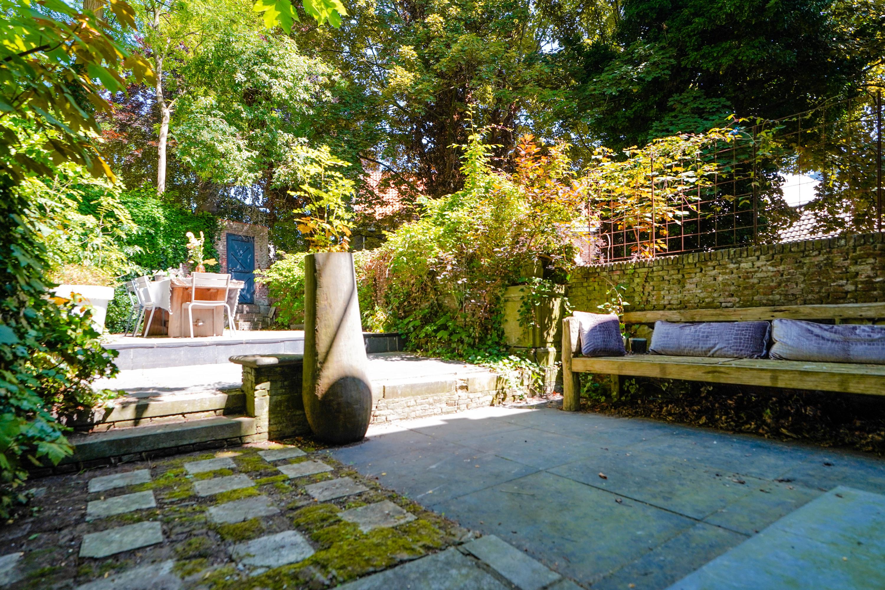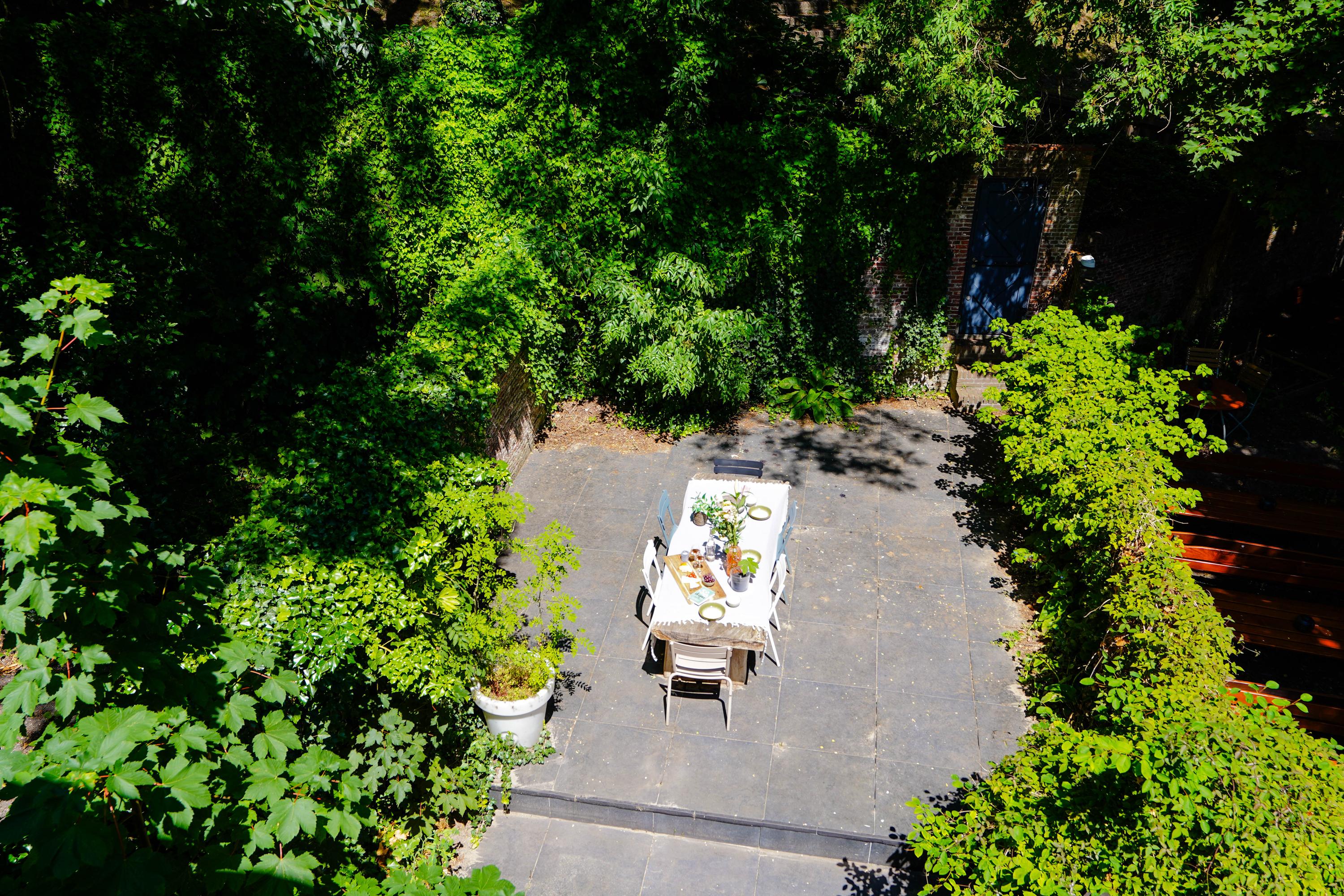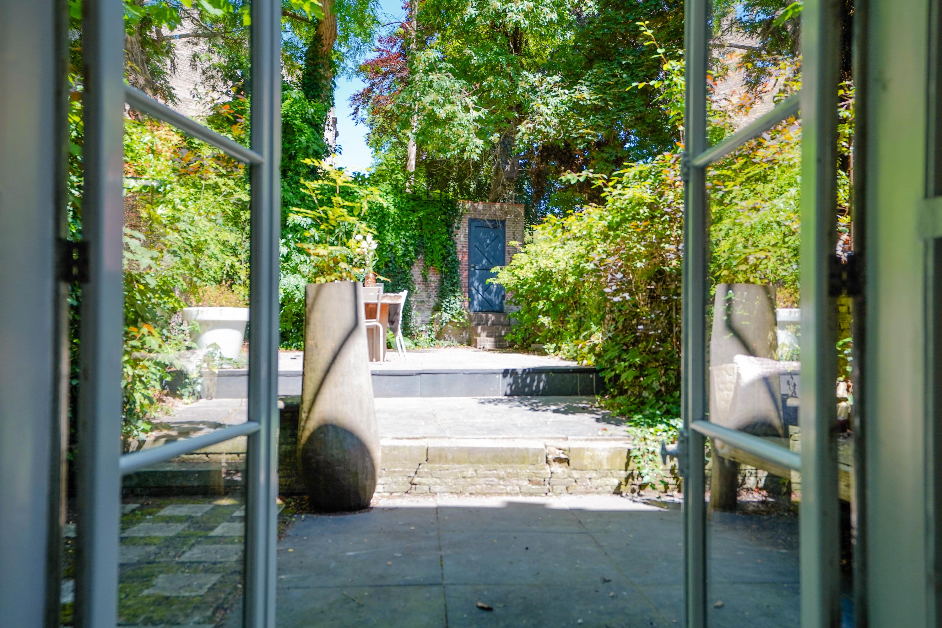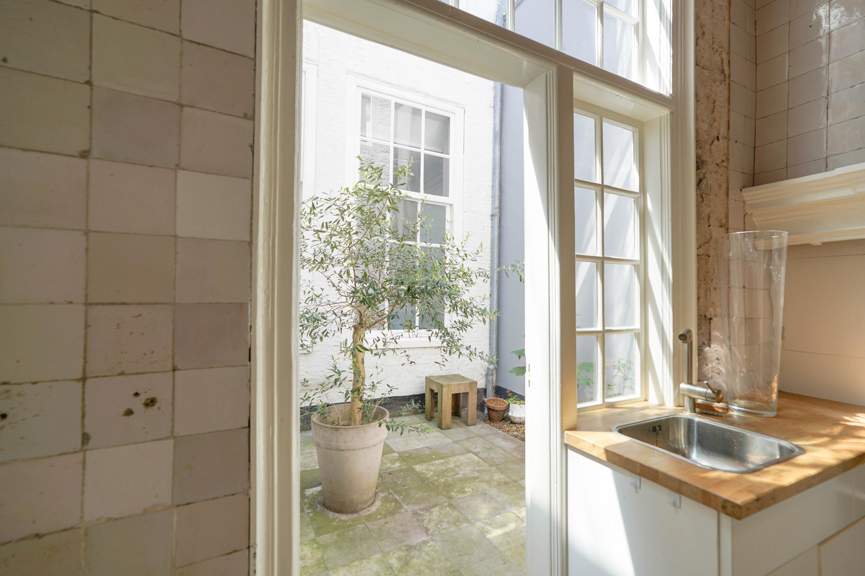 يرتبط المبنى الخلفي بسلاسة مع الحديقة التي تشكل بذاتها واحة داخل قلب لايدن المحمي من العصور الوسطى. صممت الحديقة للجمع بين الخصوصية والاجتماعية، وتضم غرفة حديقة في الطابق الأرضي مع مطبخ إضافي، وغرفة معيشة ثانية بارتفاع شاهق وإطلالات على القلعة، وبيت ضيافة مستقل. توفر العناصر التقنية مثل التهوية الميكانيكية، ومدخنة المدفأة، وعزل السقف، والتدفئة الأرضية الجزئية، والاتصال بالألياف البصرية، أقصى درجات الراحة العصرية، فيما يرسخ التسجيل كمعلم وطني وموقع محمي في النسيج التاريخي للمدينة شعوراً بالهيبة التاريخية.