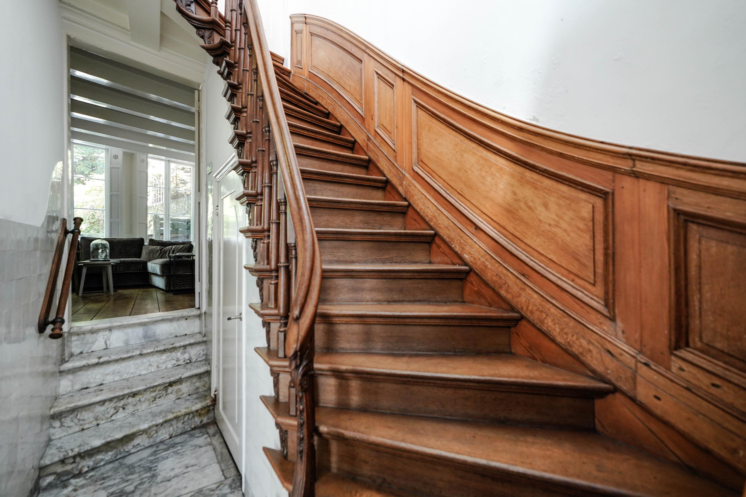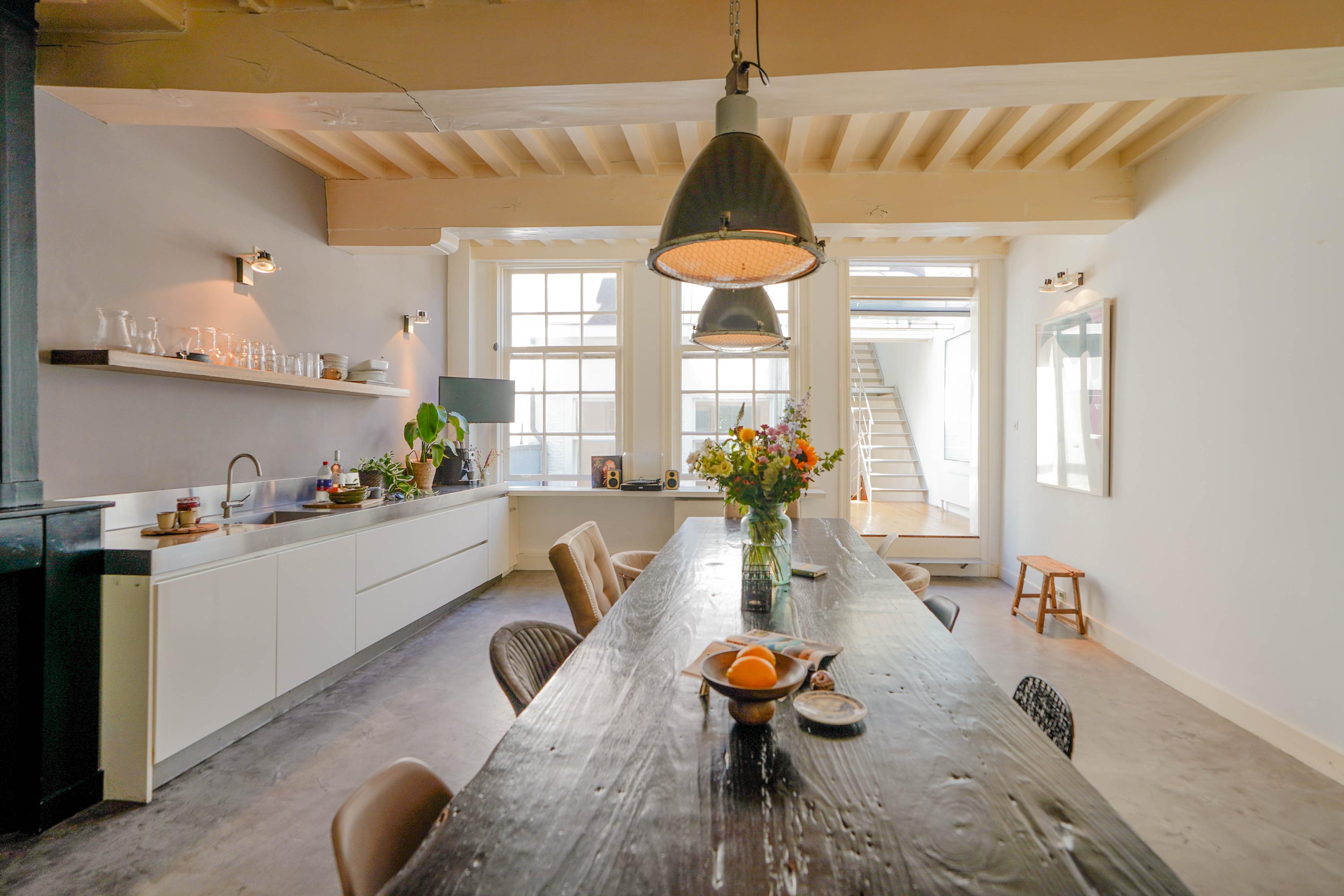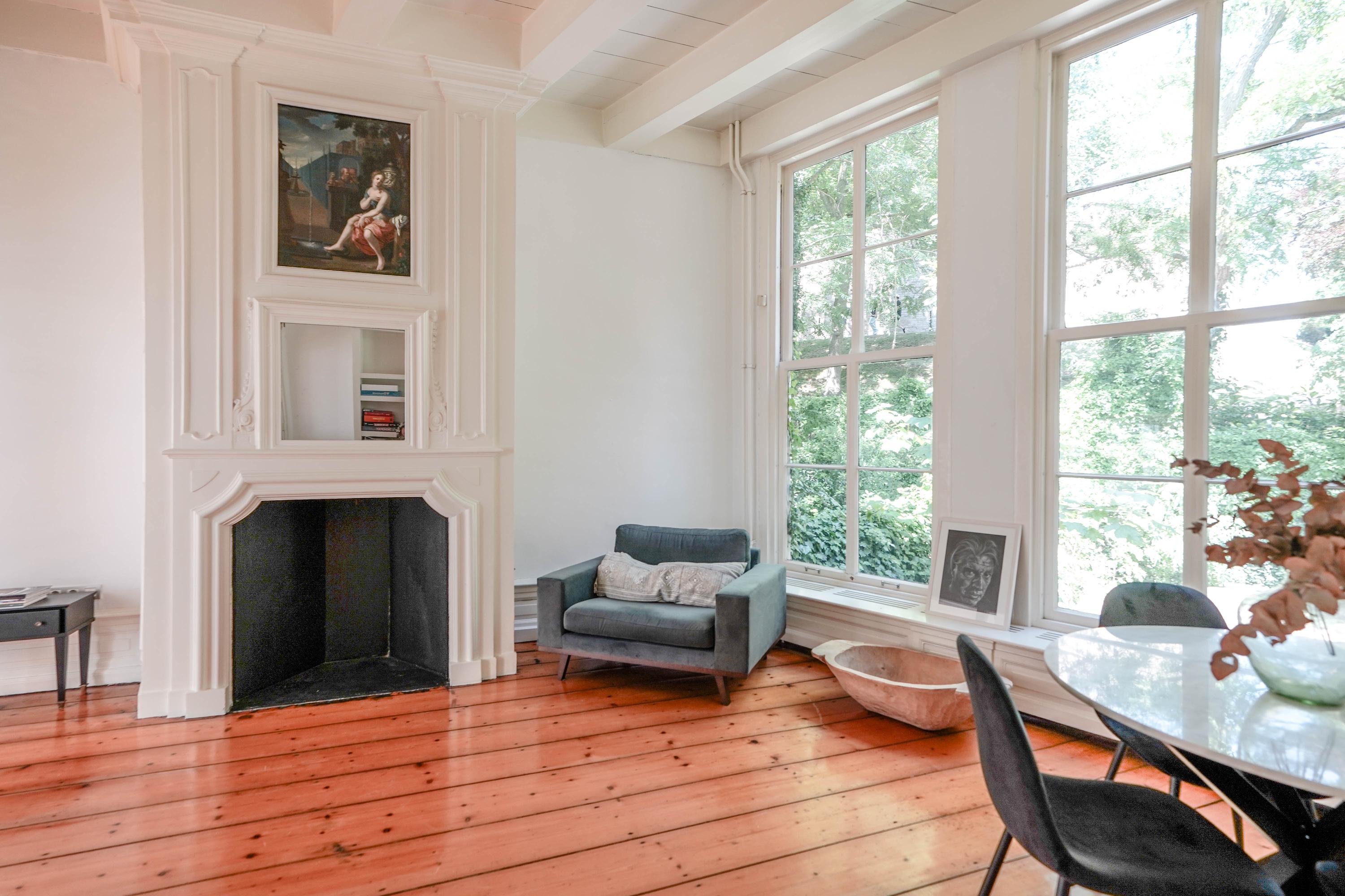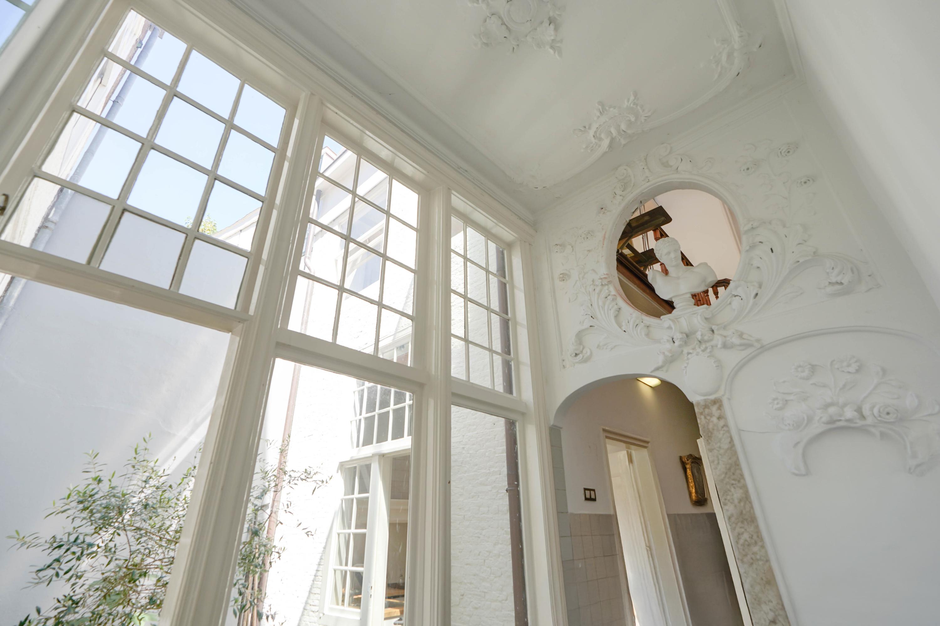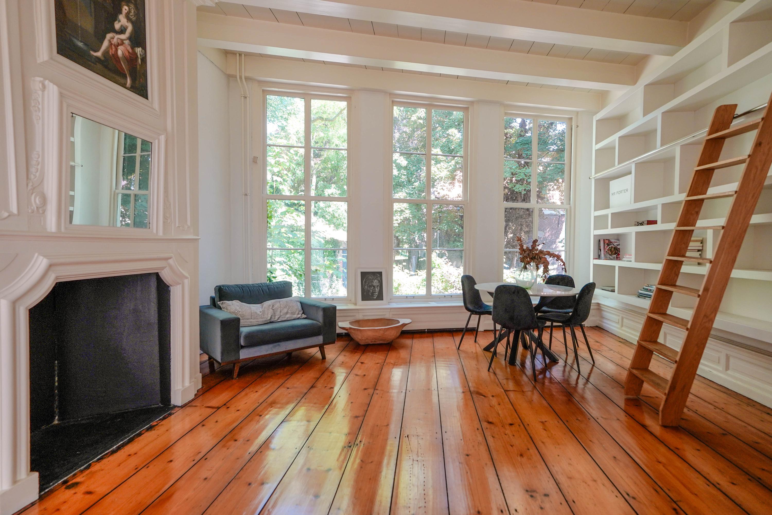 يعرض هذا المنزل التاريخي في لايدن تآلفاً نادراً بين عمارة القرن السابع عشر ووسائل الراحة المعاصرة، ويقع بمحاذاة مياه نهر الراين عند سفح تلة القلعة. خلف واجهته المتواضعة يكشف العقار عن مساحة معيشة تبلغ 437 م² موزعة بين المنزل الرئيسي الأصلي والمبنى الخلفي المستعاد بعناية. تتميز الغرف الفسيحة بارتفاعاتها الشاهقة، بعضها بسقف مرتفع لثمانية أمتار، بعوارض البلوط المكشوفة، ومدافئ الحجر الطبيعي، والزخارف الجصية الفاخرة المحفوظة من حقبة ازدهار المبنى.