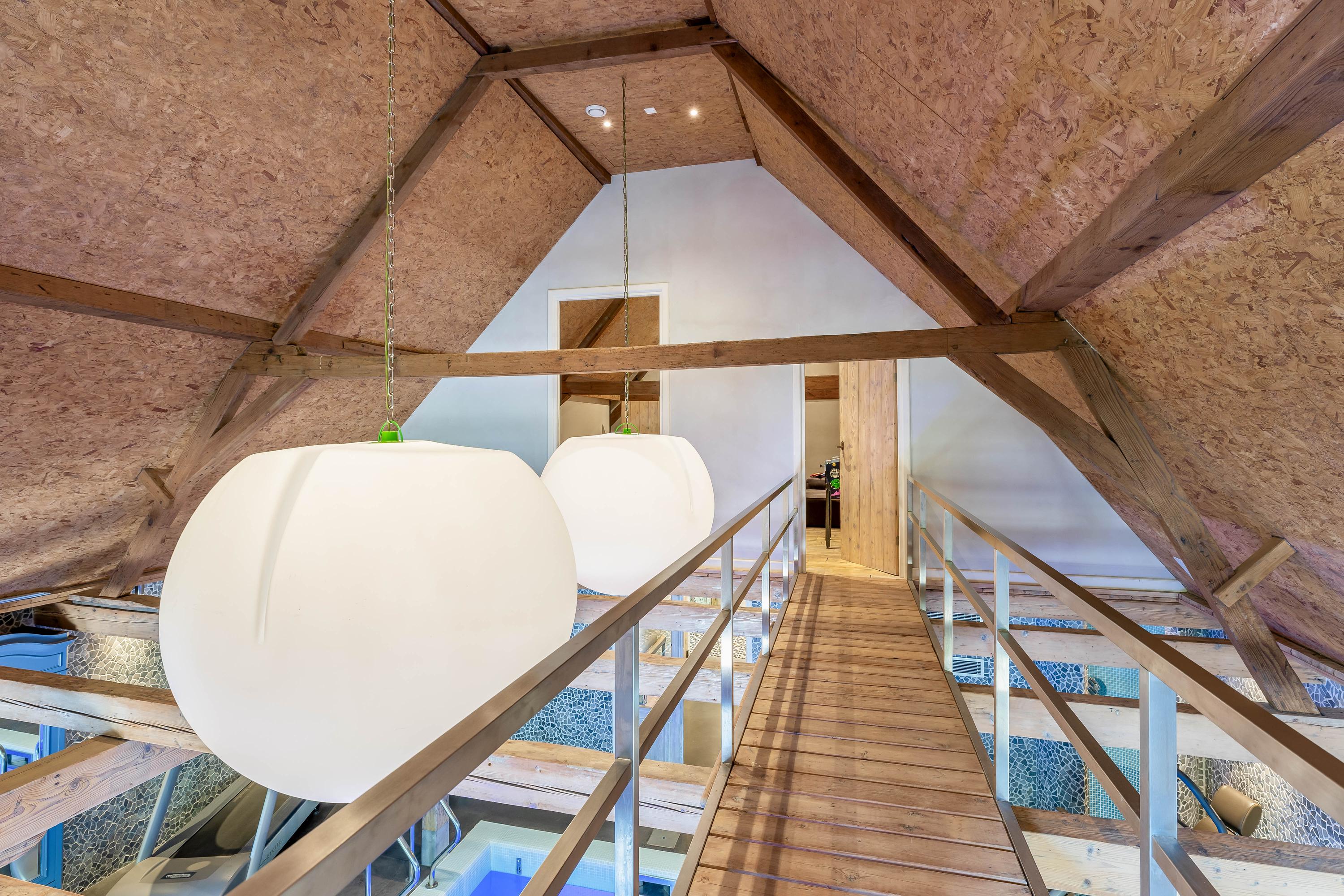 تشمل الجناح الرئيسي الجديد حماماً داخلياً، بينما توفر غرفة الترفيه الخاصة مساحة للبيلياردو أو إقامة الضيوف. في الاسطبل السابق، تنفتح منطقة العافية الفسيحة مع مسبح وجاكوزي ومنطقة للياقة البدنية، تغمرها الإضاءة المتدفقة عبر نوافذ الاسطبل الأصلية. يتعزز الشعور بالسكينة بفضل أرض مساحتها 1,250 م²، مع مساحة إضافية مستأجرة تبلغ 4,430 م²، تتوزع فيها بساتين الكرز والجوز والتفاح والكمثرى، وكراج تزيد مساحته عن 80 م²، وثلاثة اسطبلات خيول، وبيت زجاجي للنباتات.