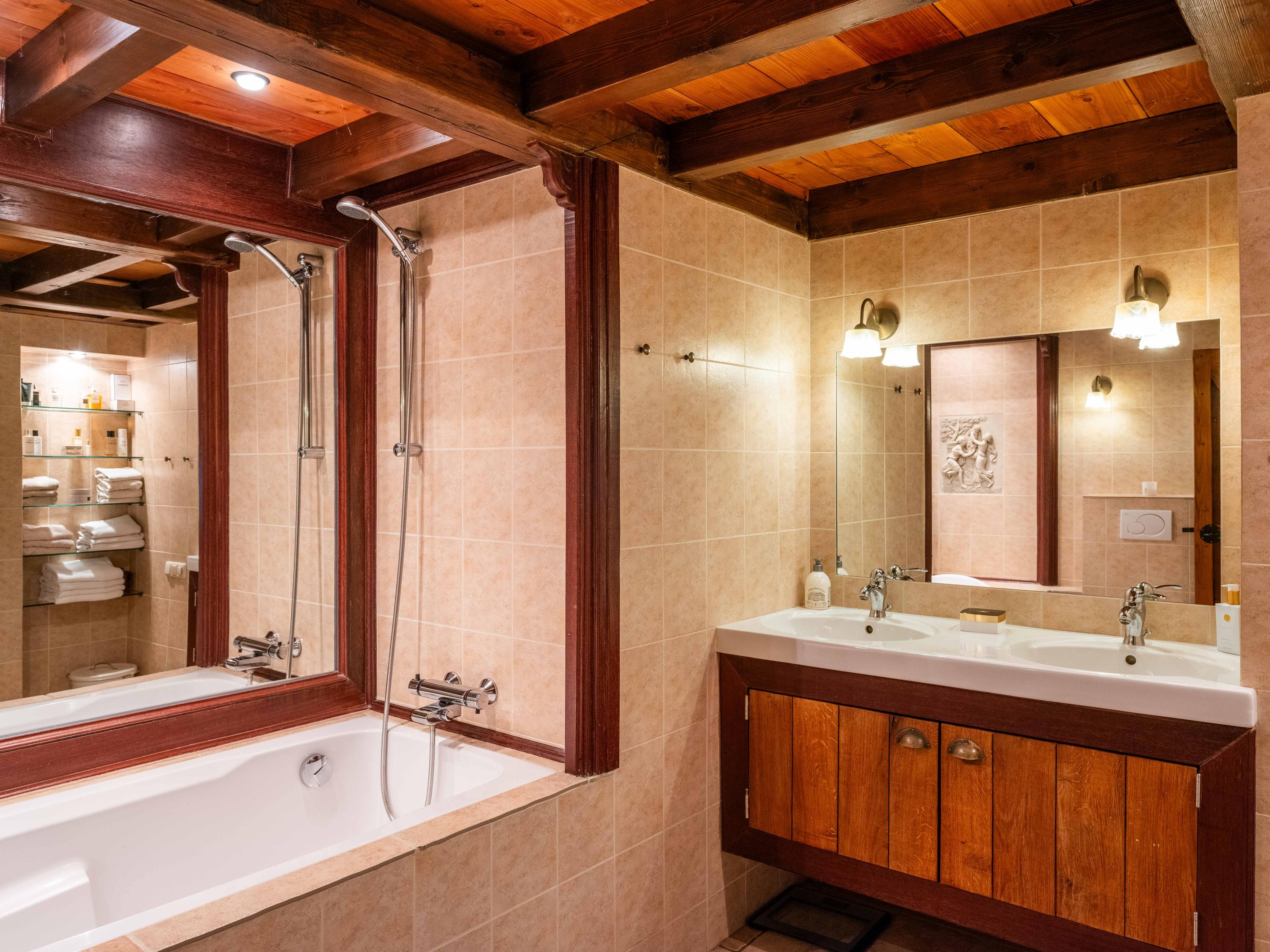 تشمل الطابق الأرضي حماماً فاخراً، غرفة ملابس عملية، قبو مستقلاً، ومساحة عمل وضيافة متكاملة بعناية في الميزانين. يتمتع غرفة النوم الرئيسية بإطلالات بانورامية على الحدائق والمروج، مع موقع مثالي للهدوء والضوء الطبيعي.