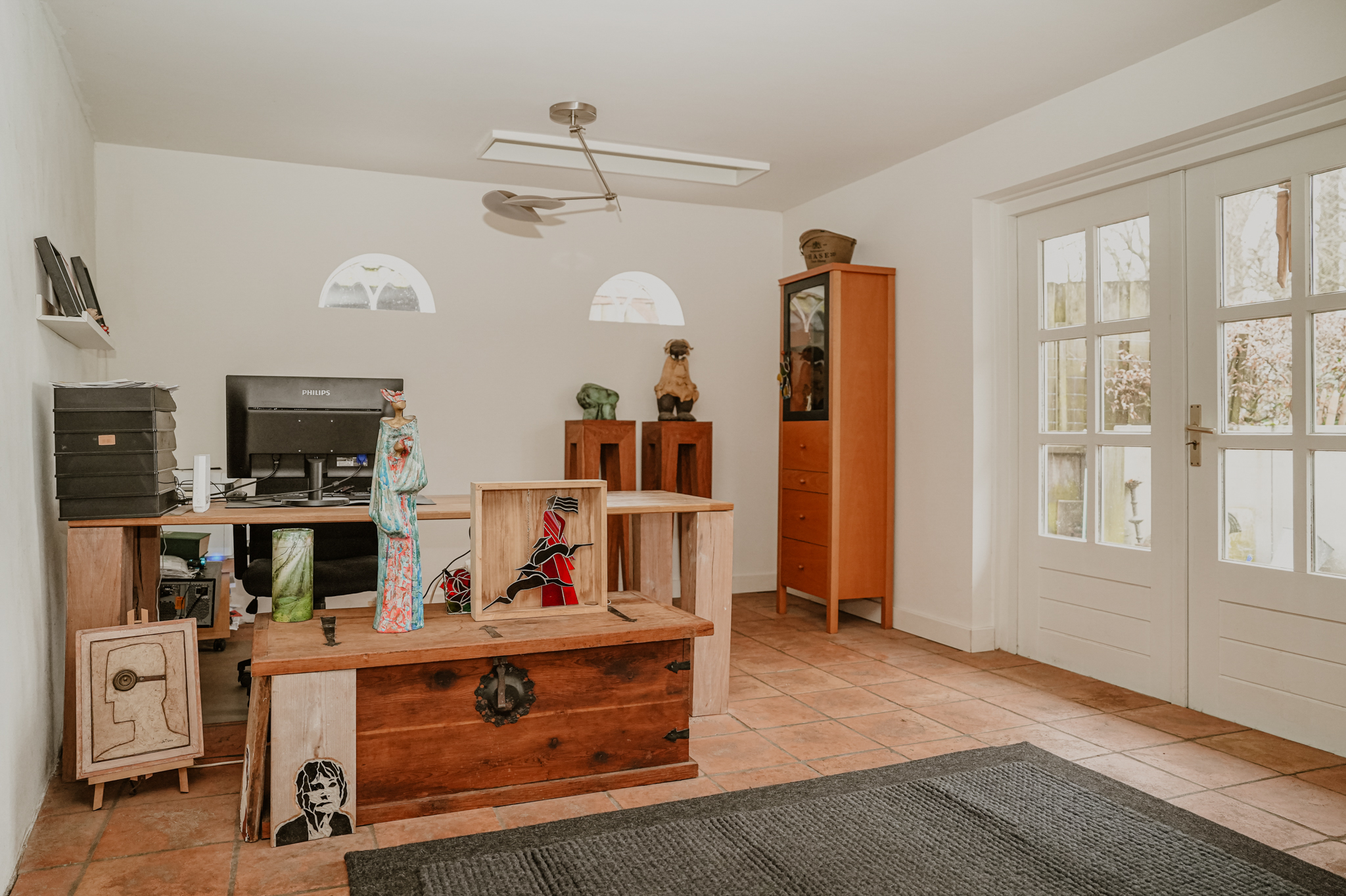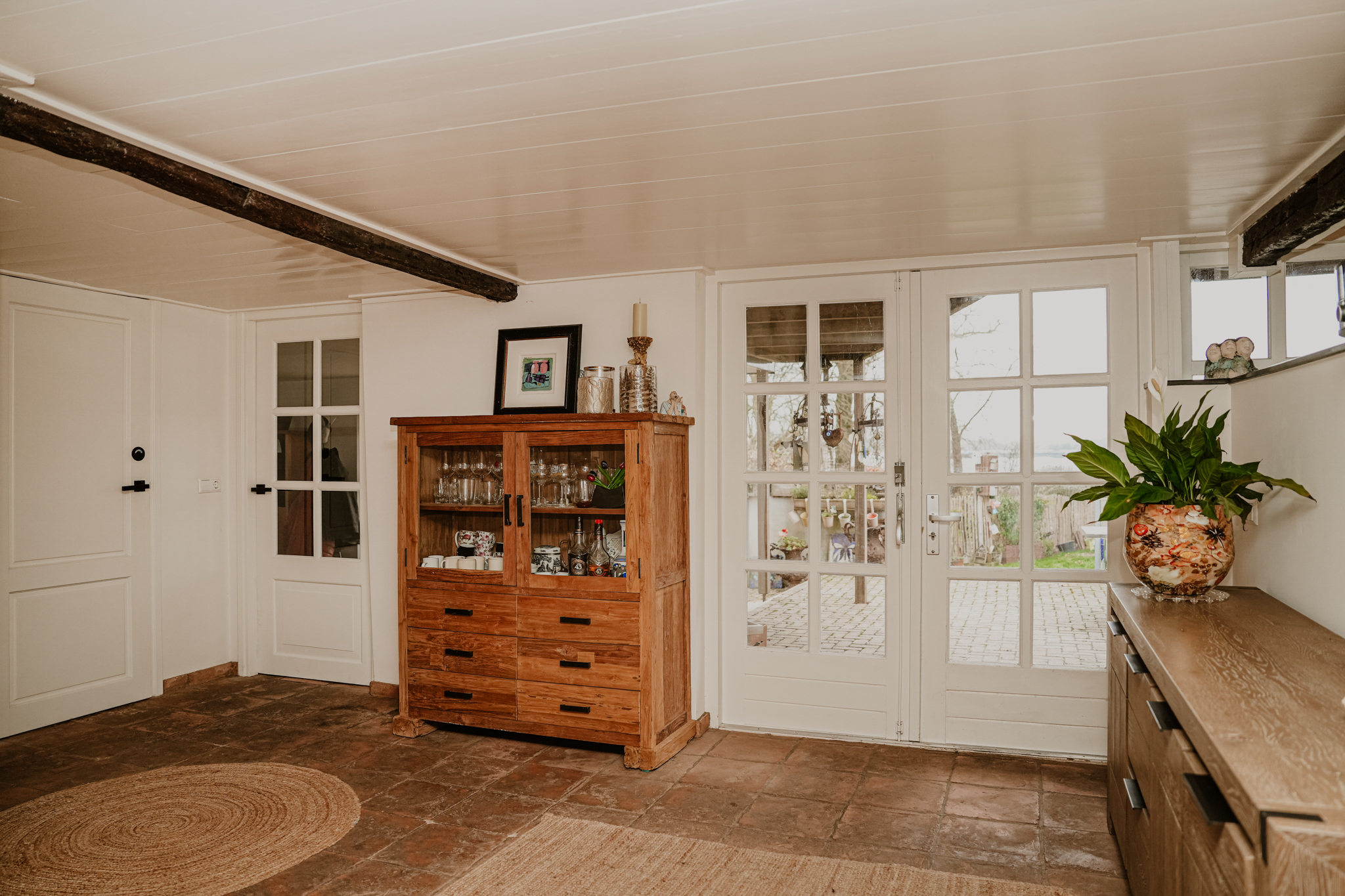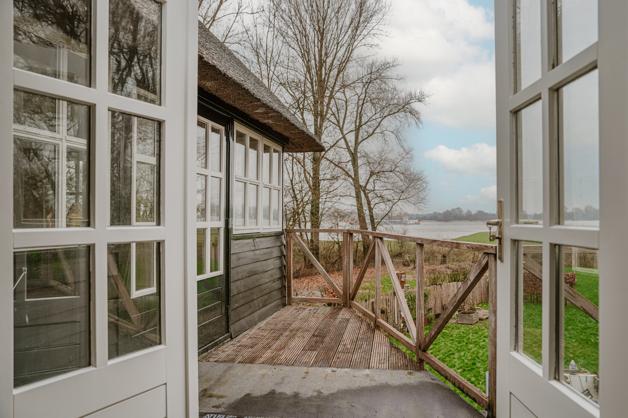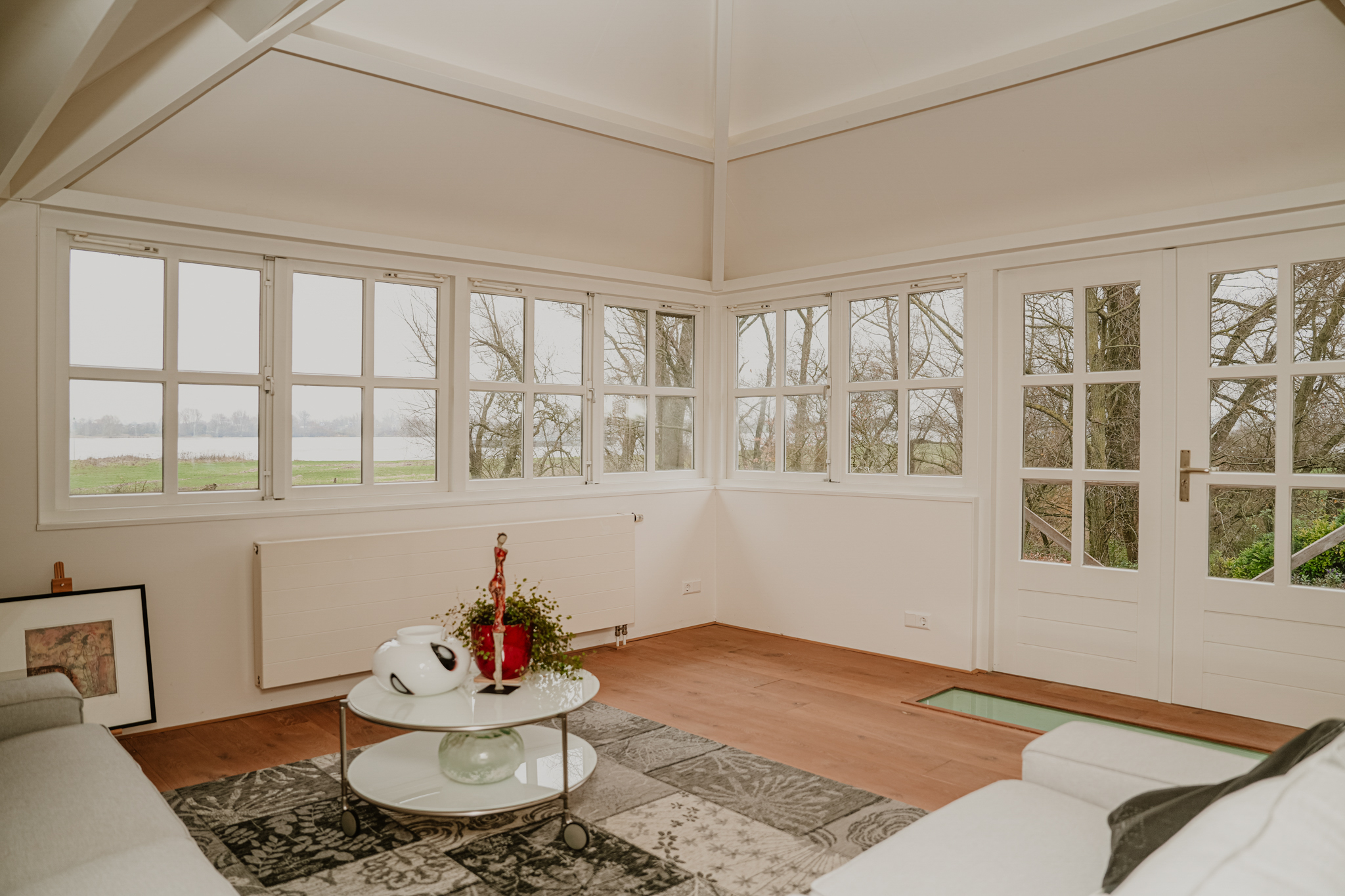 في الطابق الأرضي ينفتح المنزل على غرفة نوم وحمام فاخر جديد وغرفة خدمات عملية وغرفة حديقة تُفتح على شرفتها الخاصة عبر أبواب فرنسية كلاسيكية. تكمل أرضيات البلاط الأحمر الأثري والتدفئة الأرضية بين الأصالة والراحة. أما الطابق العلوي، فتضفي أرضيات البلوط والعوارض الخشبية المكشوفة طابعًا هادئًا لصالة مواجهة للنهر، بينما تقود الأبواب الفرنسية إلى سطح السقف حيث تطل على مناظر تكرّس خصوصية هذا المكان الفريد. يوفّر الامتداد الذي أضيف في 2003 مساحة معيشة ثانية واسعة أو مرسمًا، محاطًا بنوافذ تؤطر مشاهد النهر والسماء.