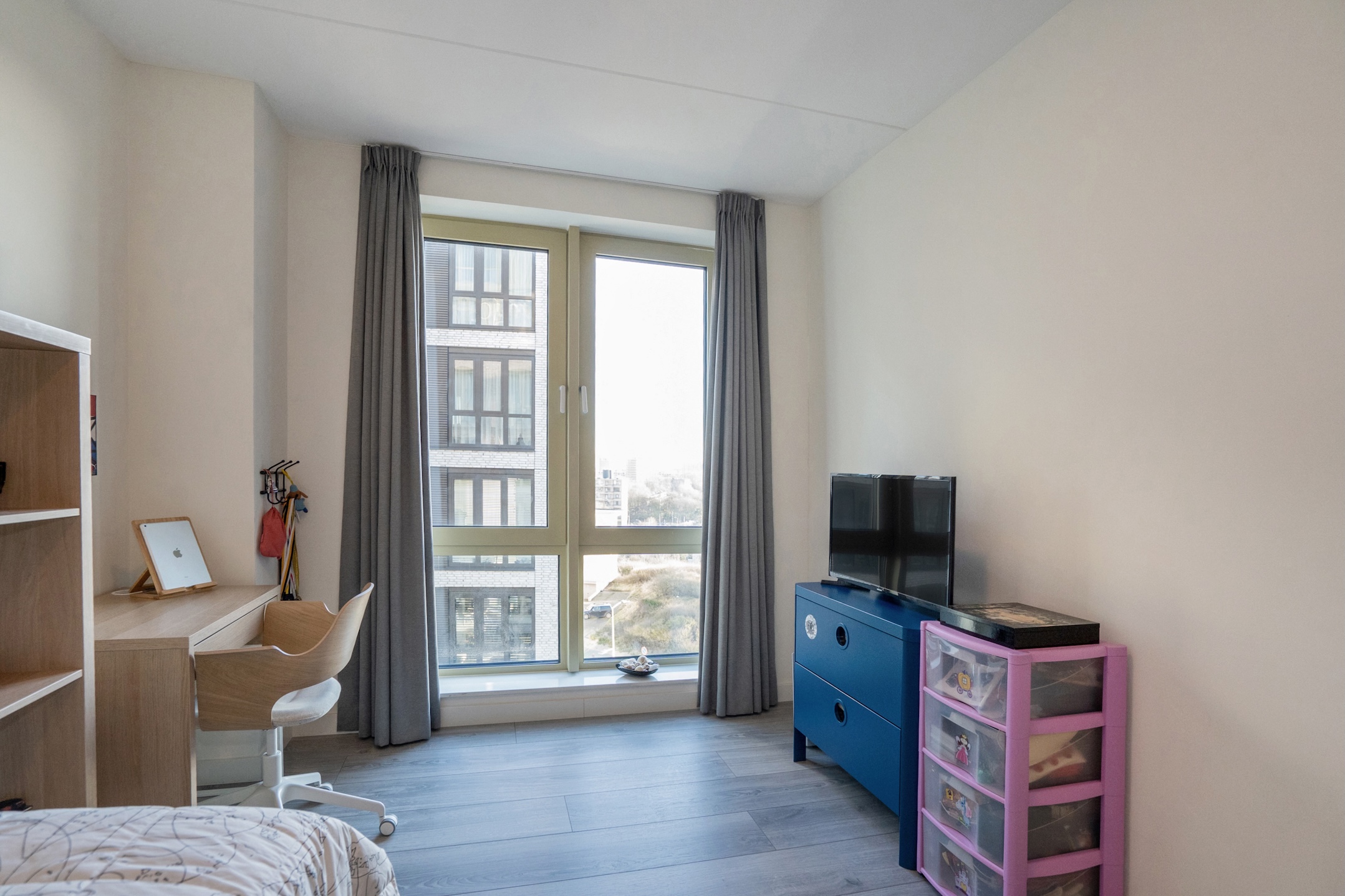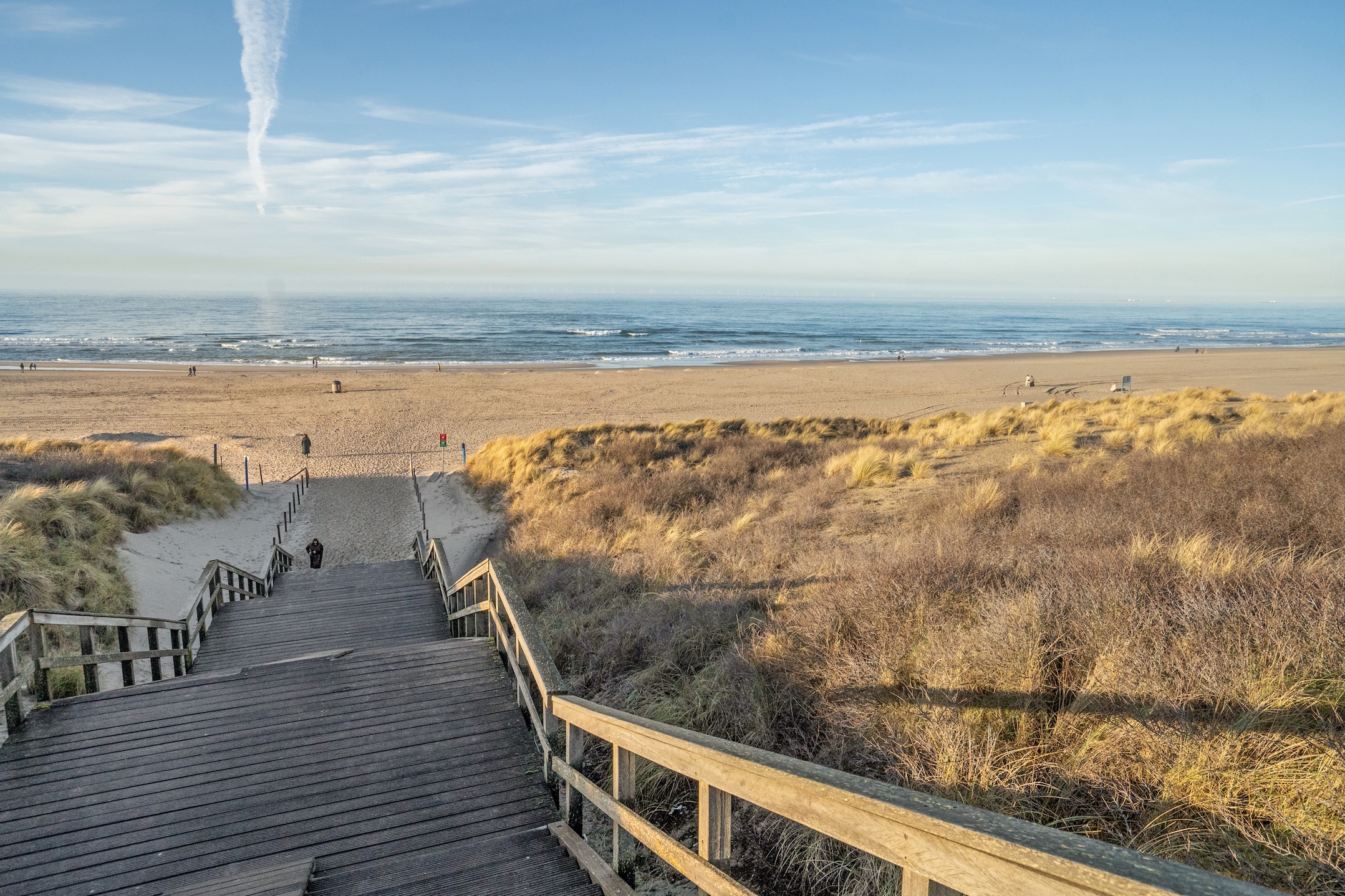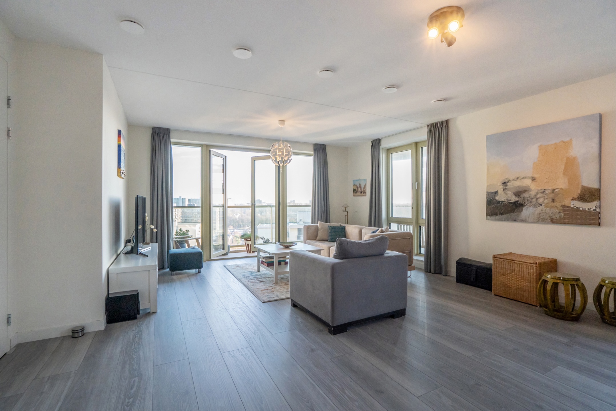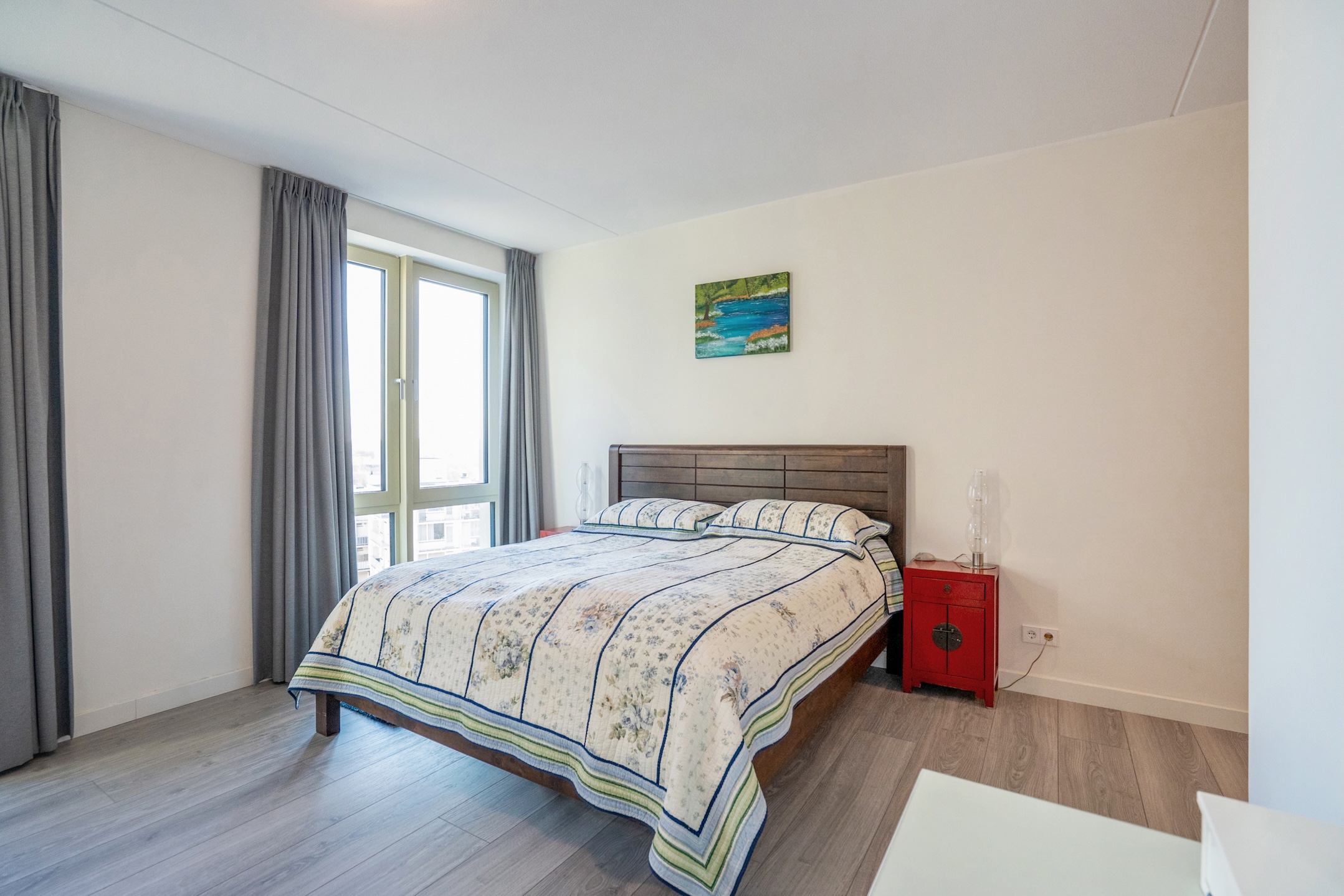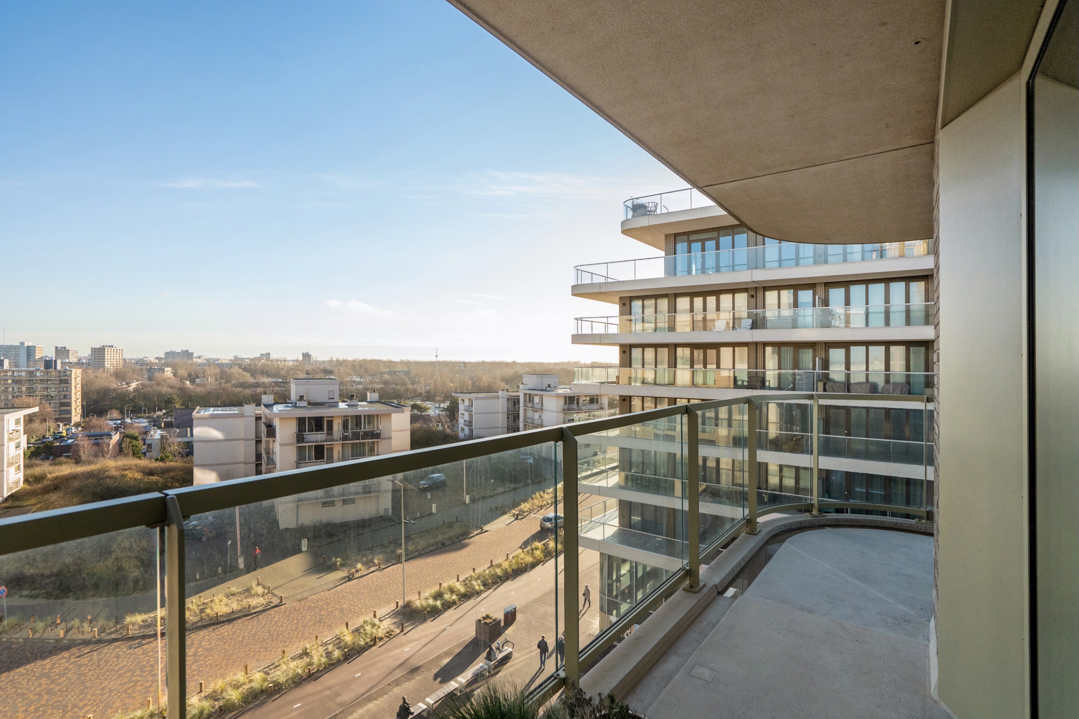 Behind the front door, you enter a spacious entrance hall with a wide closet wall for coats and shoes. There is also access to a separate deep toilet. Through a closed door, you enter the impressive living room with large floor-to-ceiling windows and the open kitchen, together creating a pleasant living space. A neat kitchen arranged along the width, equipped with all necessary built-in appliances such as a refrigerator, freezer, induction cooktop, combination microwave, and dishwasher. From the living room and kitchen, you always have a diagonal view of the sea.