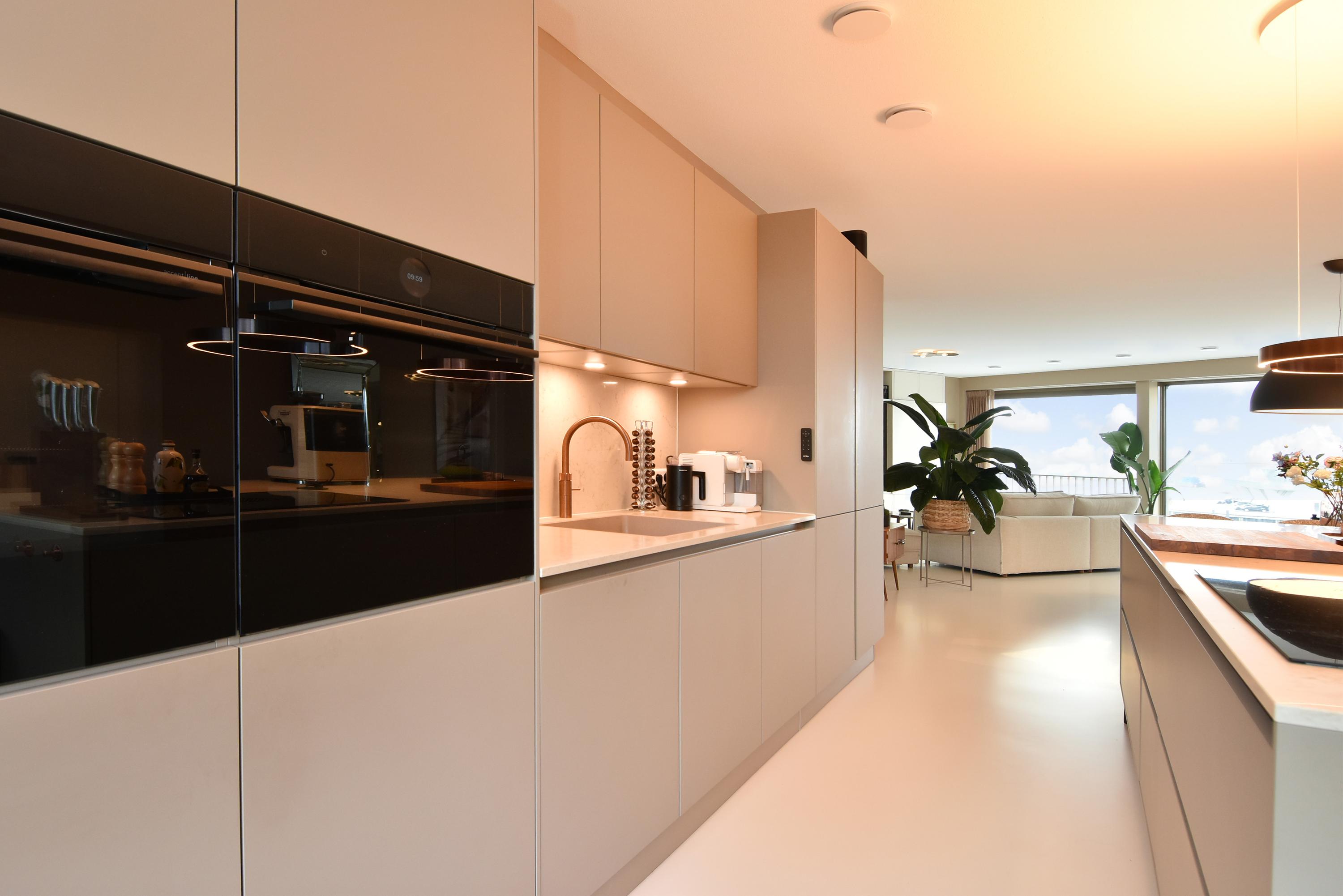 Apartment Den Haag with sea views offers a rare fusion of modern architecture and understated luxury. Situated in Scheveningen, this high-end apartment spans 135 m² and features expansive floor-to-ceiling windows that frame the panorama of the harbour and the North Sea. The living area flows seamlessly into a designer kitchen with a cooking island and integrated luxury appliances. Sliding doors invite the outdoors in, connecting the main living space to a private 29 m² balcony overlooking a landscaped courtyard, perfect for quiet afternoons or evening gatherings.