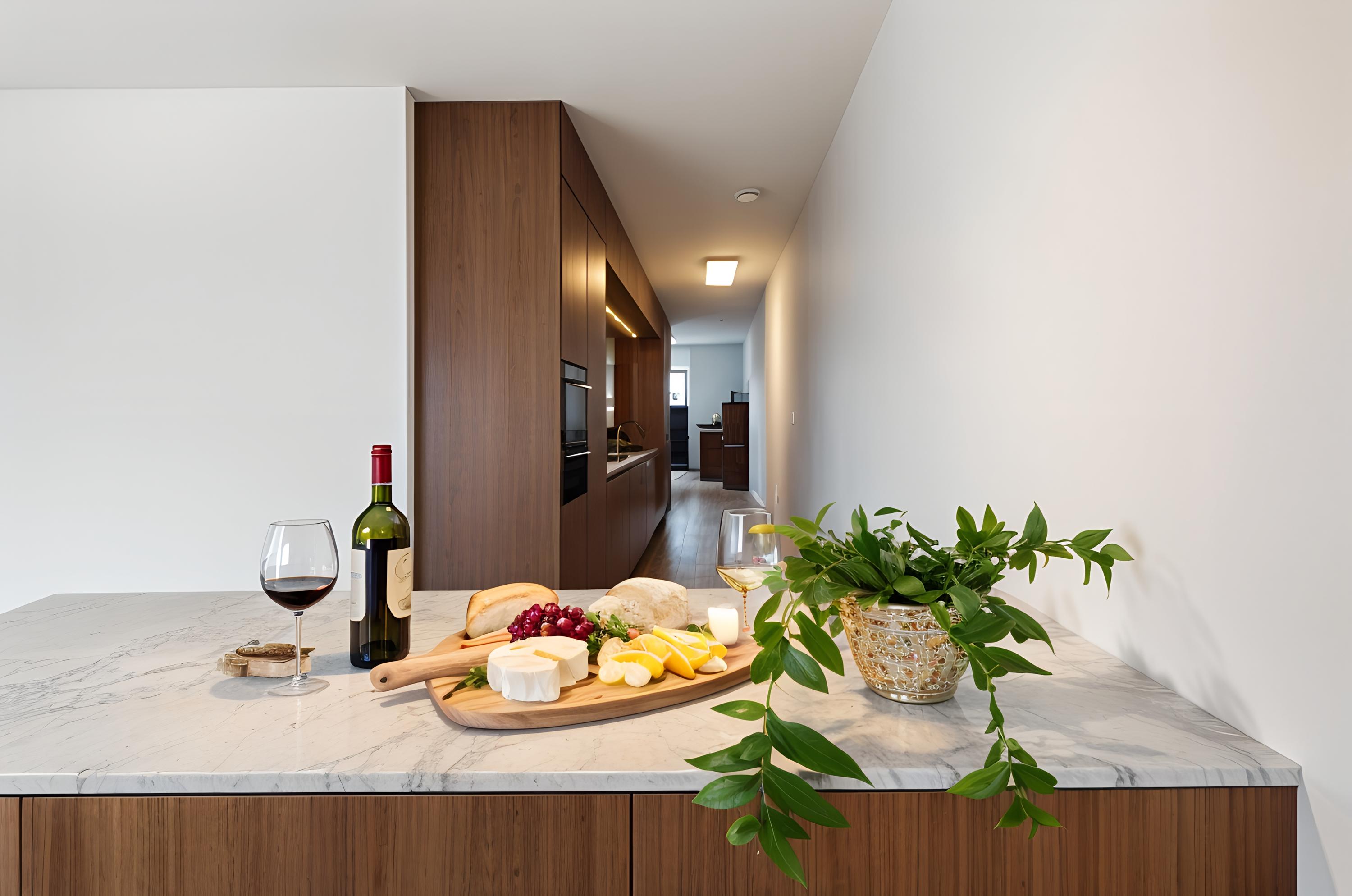 Between the living room and the dining area lies the striking 7.20-metre kitchen by NEXT-125, a design on par with high-end interior architecture. The tall units include a wine climate cabinet, warming drawer, combi oven and fridge-freezer. The wide induction hob with integrated extraction, silent dishwasher and Quooker tap complete the ensemble. The walnut cabinetry is paired with a luxurious composite worktop and splashback in a marble design with continuous veining, creating a look that is calm, luxurious and timeless.