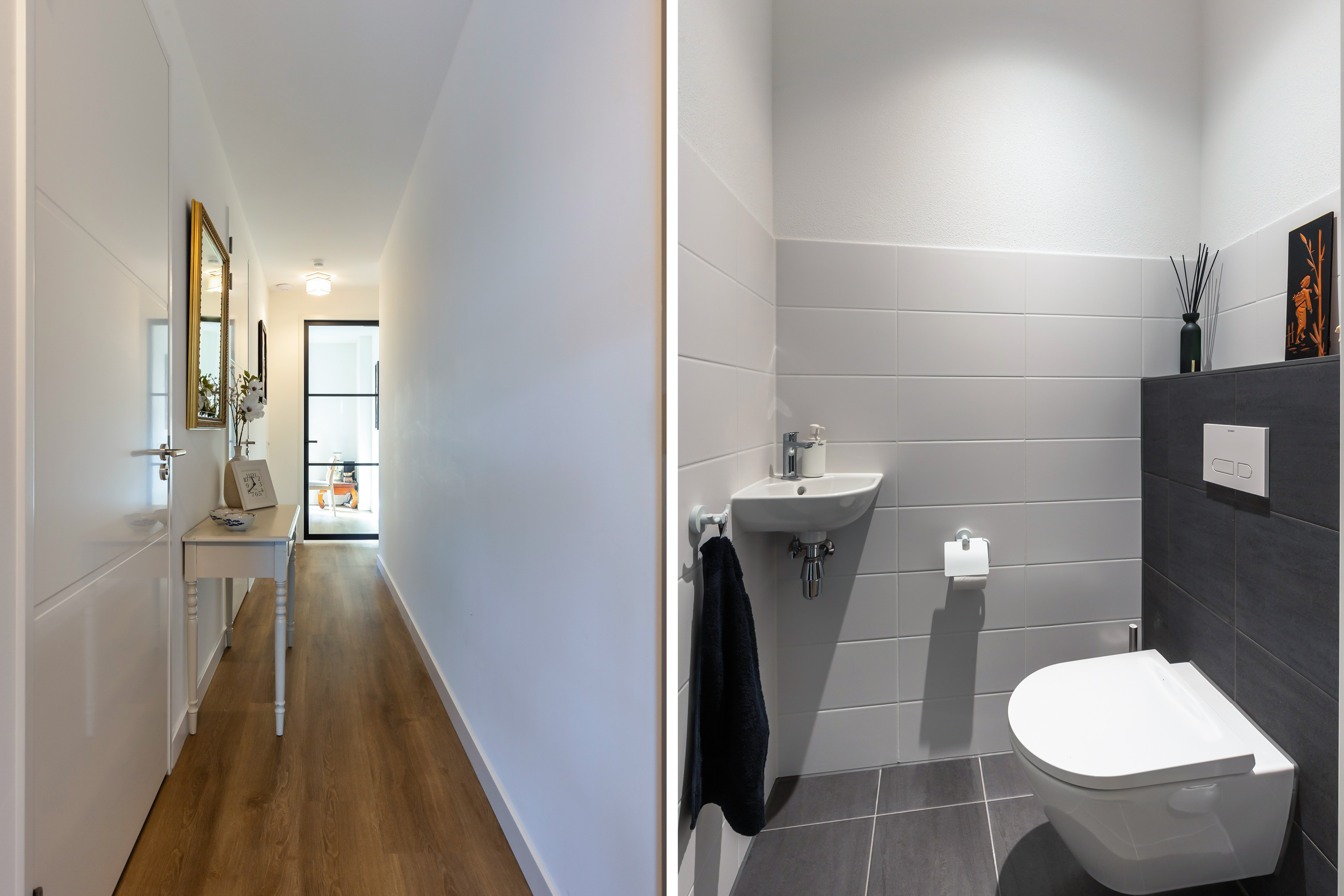 The living spaces are arranged around the central hallway, from which the storage room, WC, bathroom and principal bedroom with fitted wardrobes are accessed. The second bedroom, located at the front next to the living room, currently serves as a study and guest room. Two steel-framed glass doors provide an elegant connection between the living room, dining area and the hall, making the spaces feel light, open and inviting.