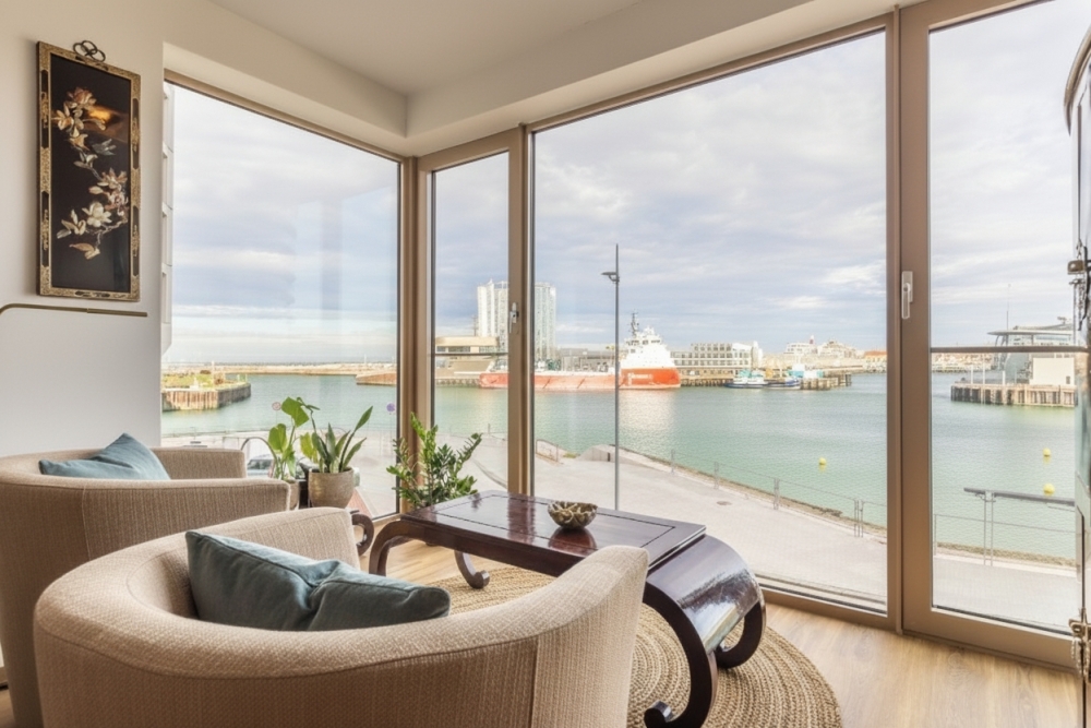 The living room, with its bay window and French balconies, is oriented towards the harbour and the sea. Thanks to the corner position and large glazed surfaces, you enjoy panoramic views that shift with the light throughout the day. The room offers excellent possibilities for a generous lounge arrangement, such as a large corner sofa paired with inviting armchairs facing the bay window. The view itself becomes a living artwork, continuously enhancing the atmosphere.