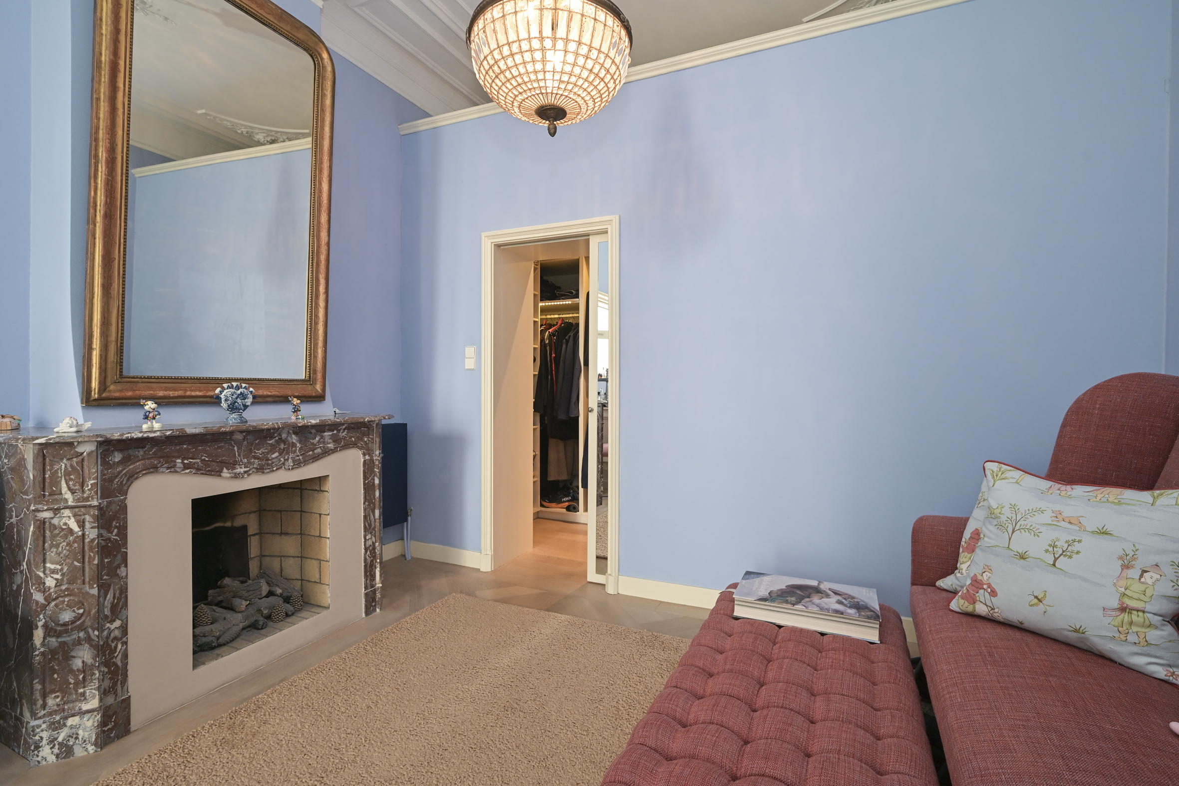 The beautiful staircase leads to the first floor, landing, modern toilet with washbasin, spacious rear bedroom with beautiful oak flooring, fireplace with gas fire, high ceilings, walk-in wardrobe, and an adjoining full bathroom with bathtub, separate walk-in shower, and double sinks with vanity units. At the front is the full-width classic study with high ceilings, fireplace with gas fire, oak floors, built-in bookcases, and an unobstructed view.
