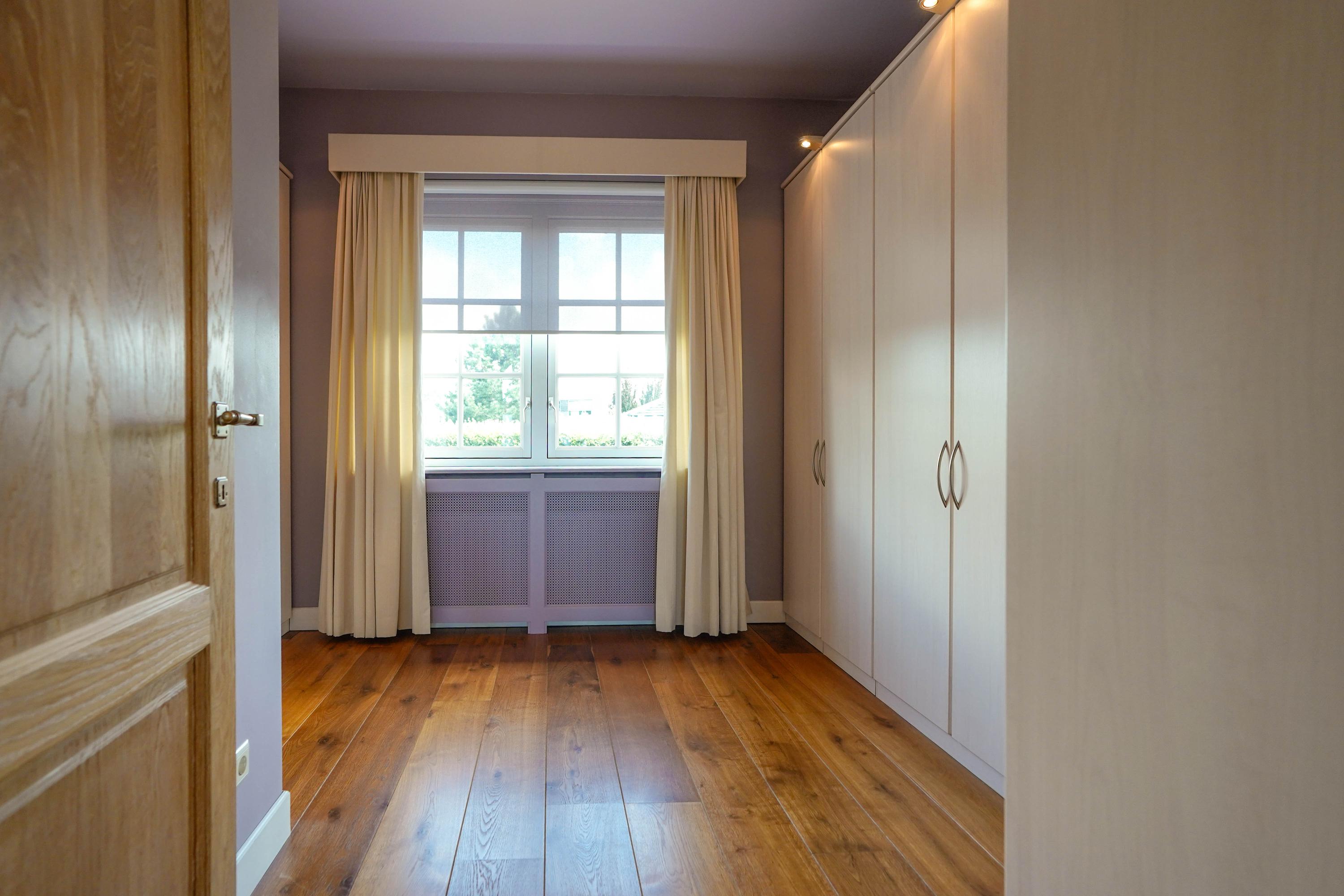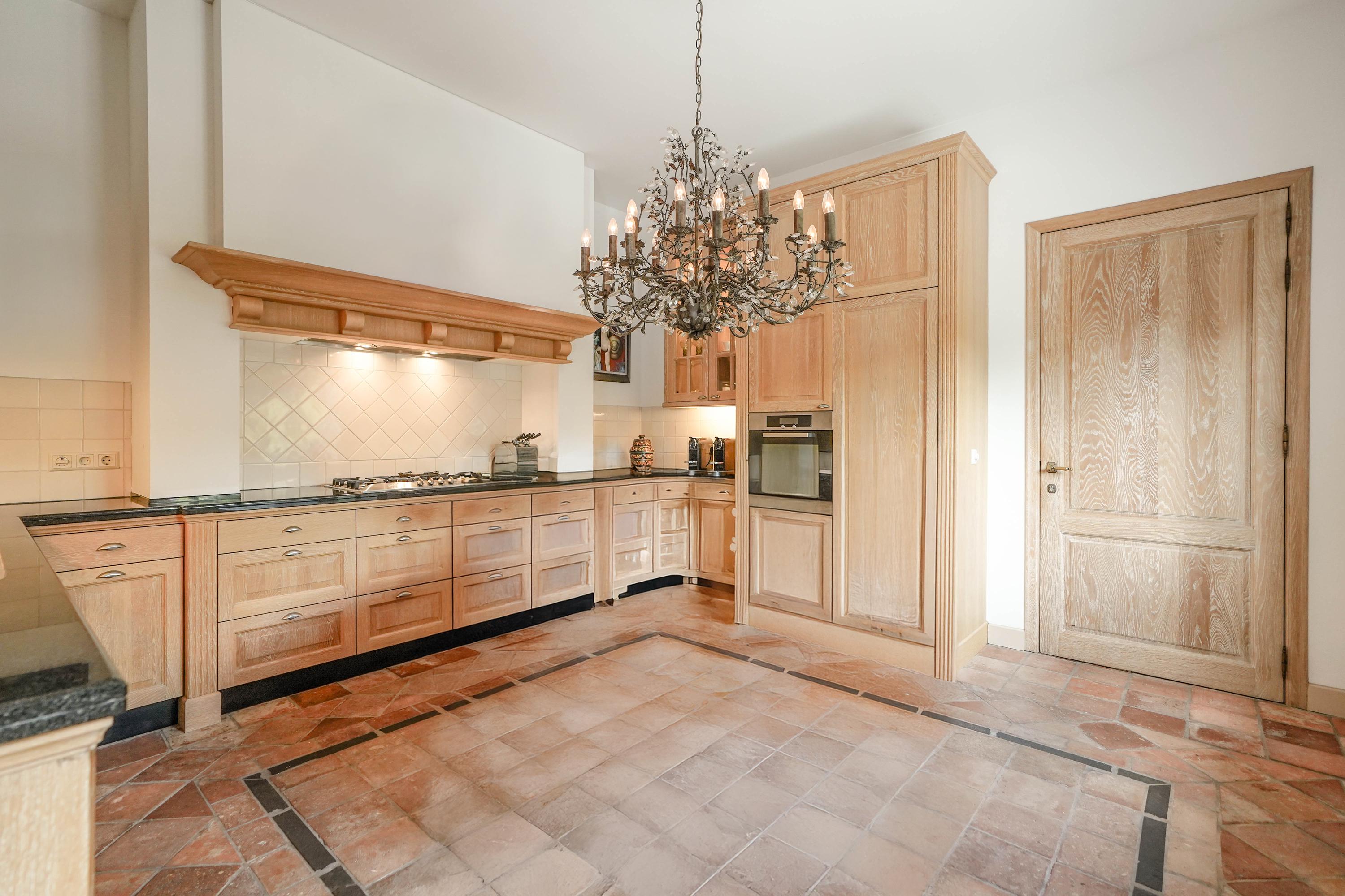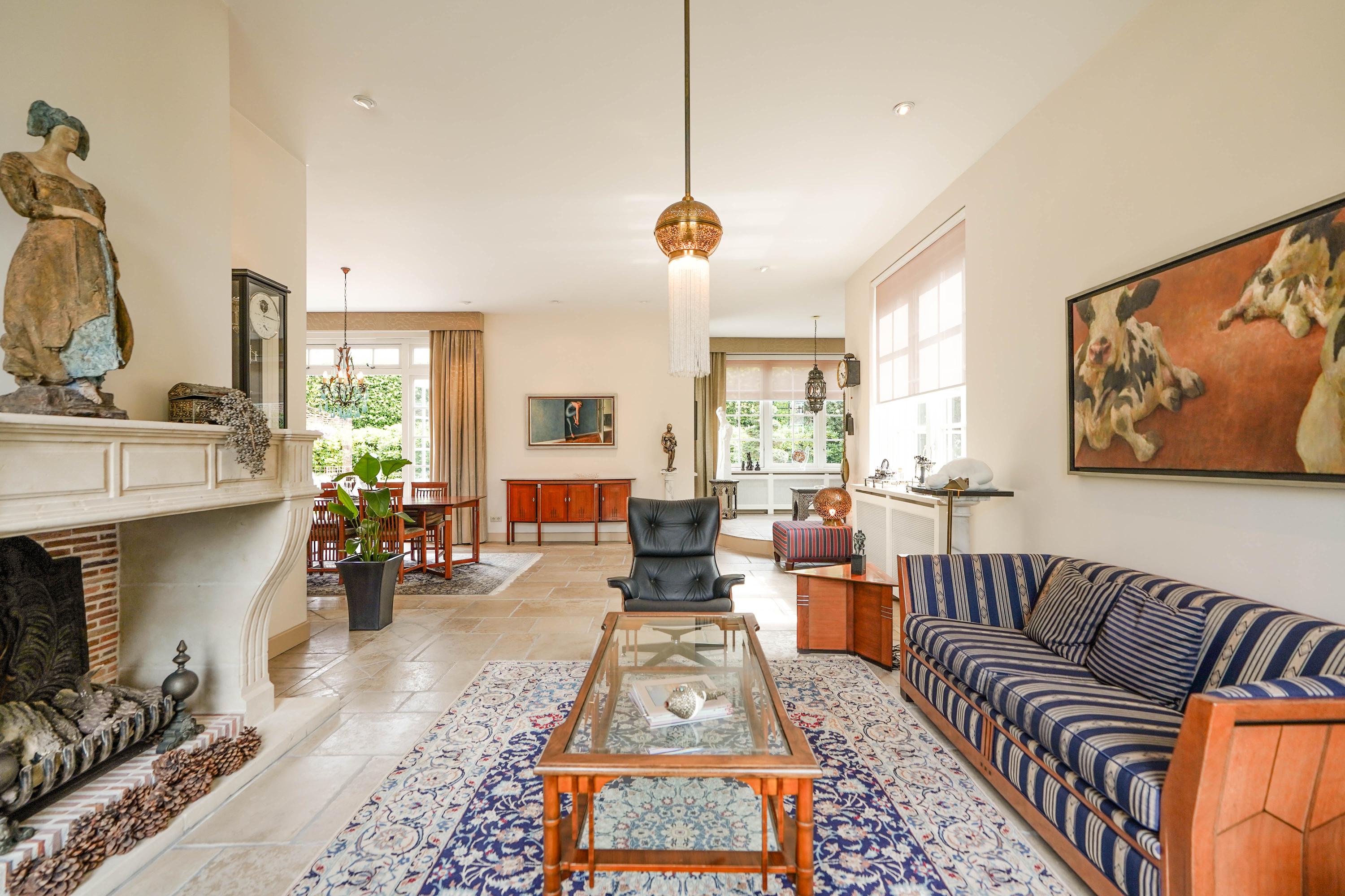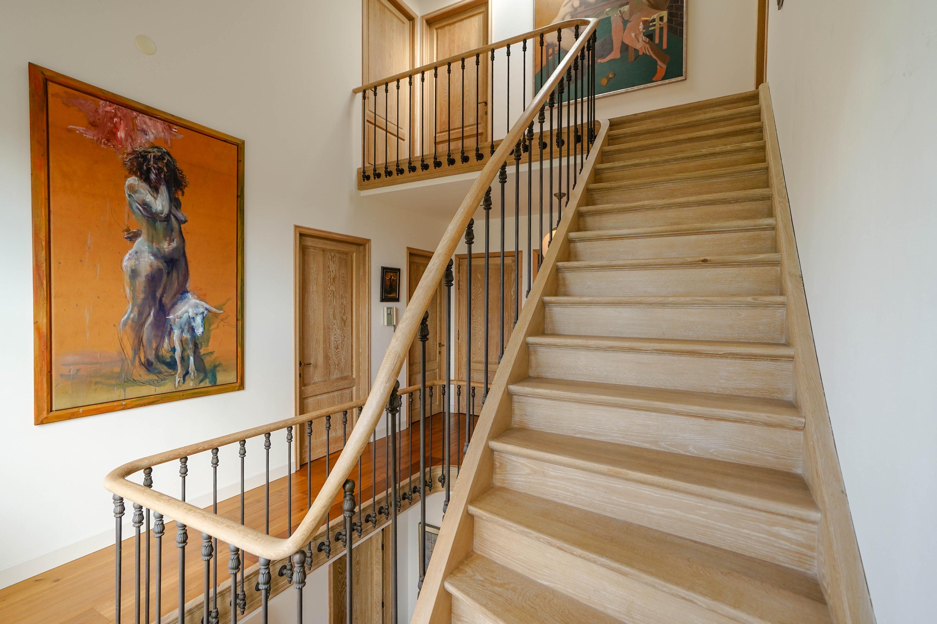 Architectural details make this villa truly distinctive: four arched windows, a curved glass central bay, hand-formed brickwork, and a robust oak front door with custom wrought iron hardware. The interior is filled with carefully selected materials, highlighted by a sculpted oak staircase from Luc Steels, solid wooden flooring, and an open flow between living spaces. Light is drawn from skylights and broad glazed facades, creating an uplifting atmosphere throughout the home.