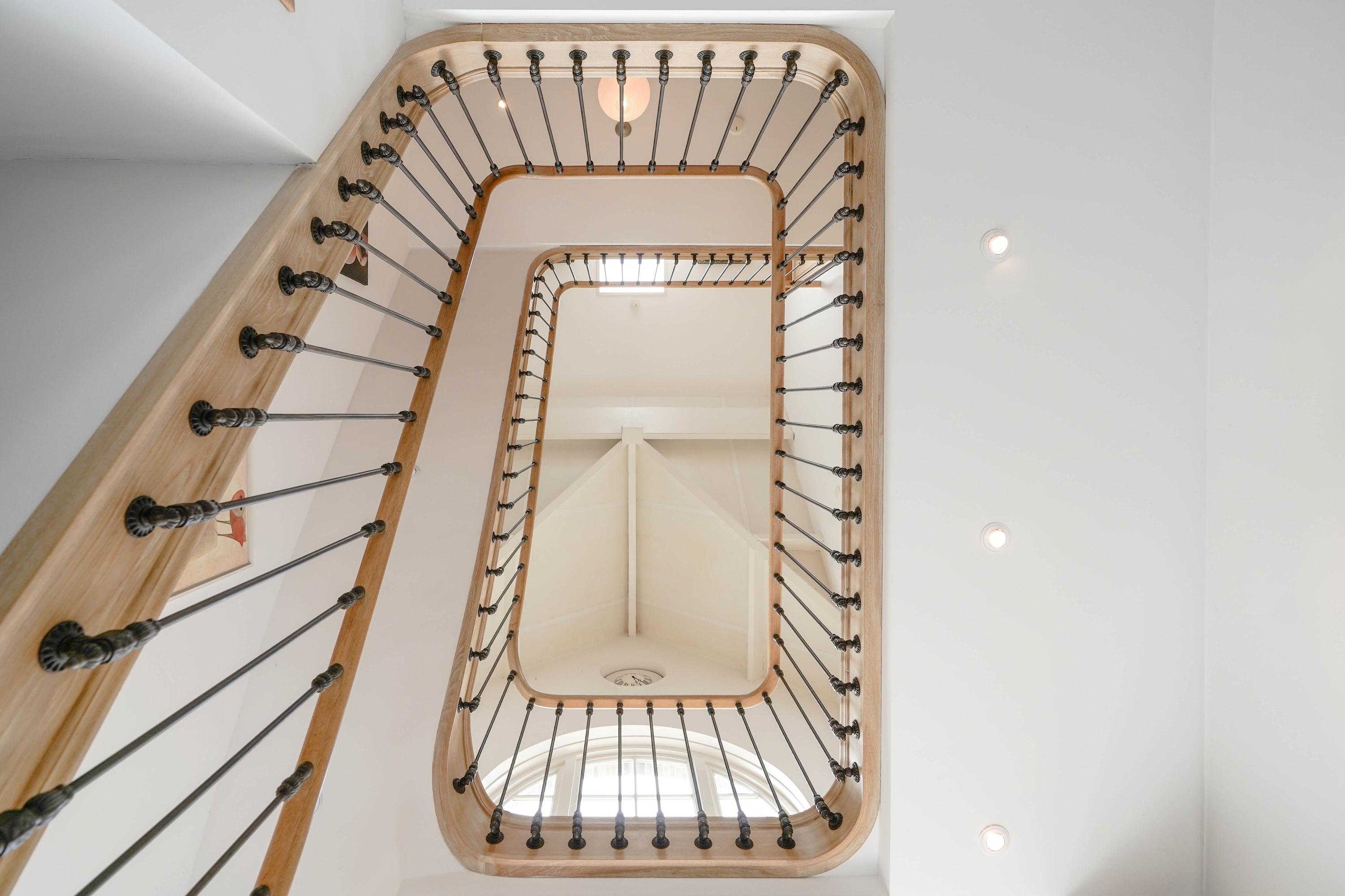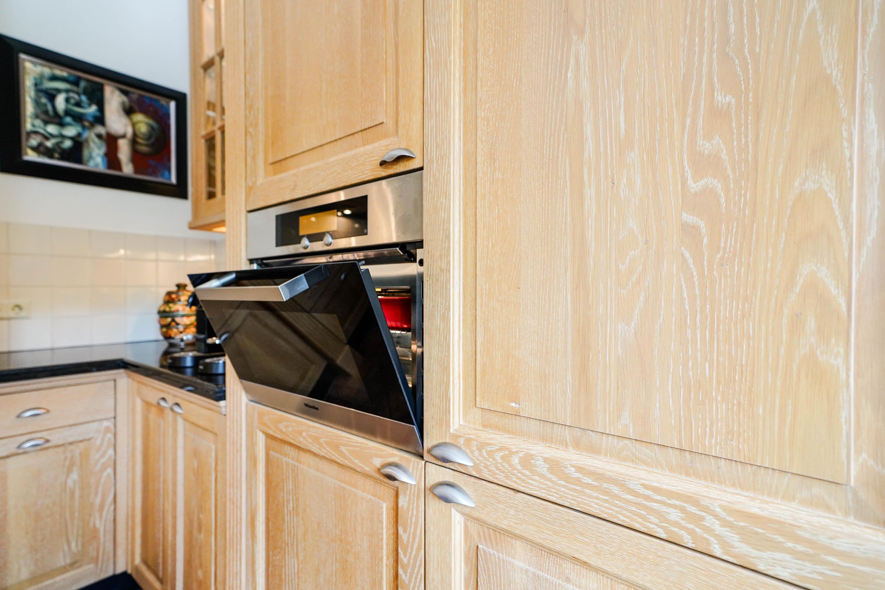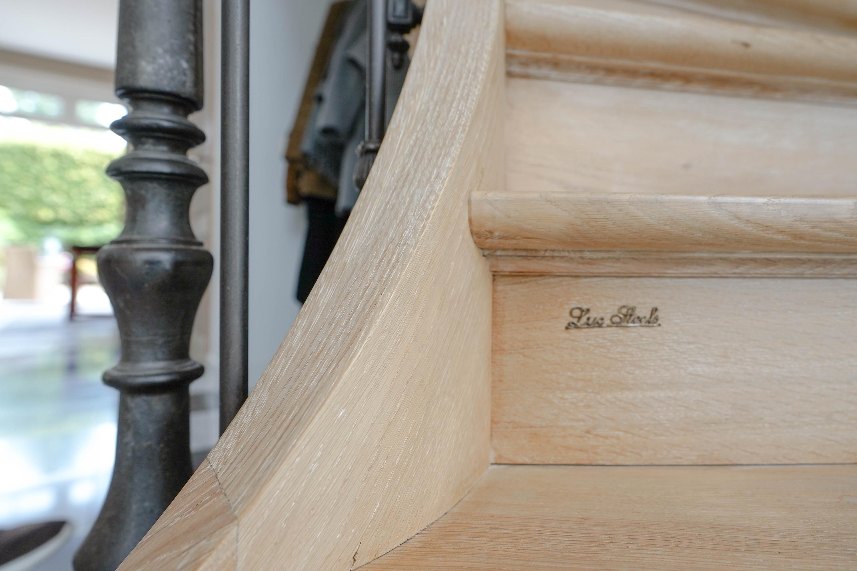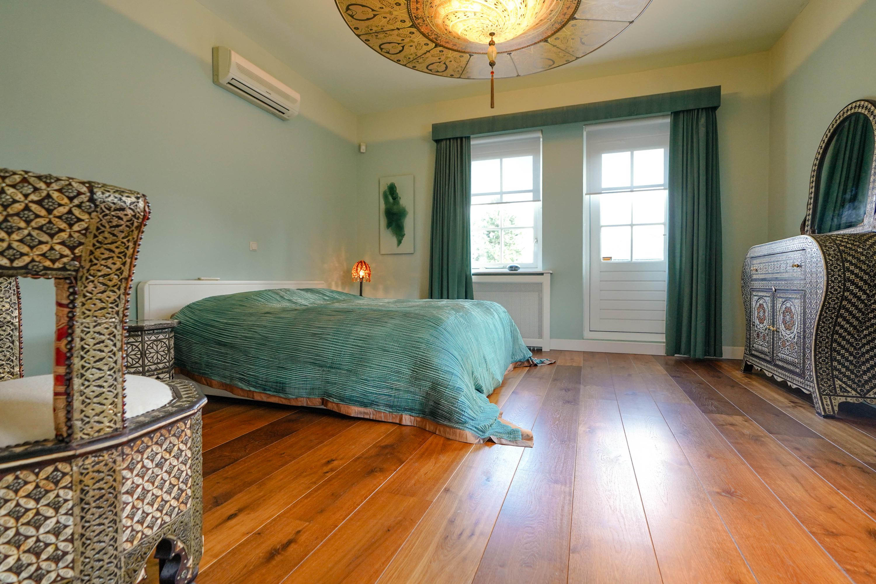 Architectural details make this villa truly distinctive: four arched windows, a curved glass central bay, hand-formed brickwork, and a robust oak front door with custom wrought iron hardware. The interior is filled with carefully selected materials, highlighted by a sculpted oak staircase from Luc Steels, solid wooden flooring, and an open flow between living spaces. Light is drawn from skylights and broad glazed facades, creating an uplifting atmosphere throughout the home.
