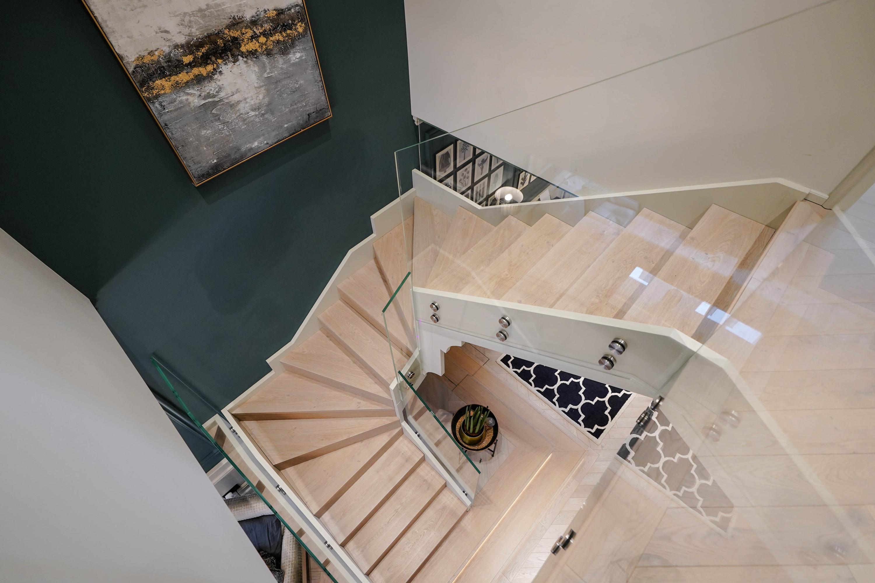 The entrance hall provides access to the generous main living floor. At the front is the living room, featuring a spectacular staircase leading to the first floor, and a spacious bathroom. This is a stylish space with a beautiful finish, high ceilings and an elegant, luxurious feel.