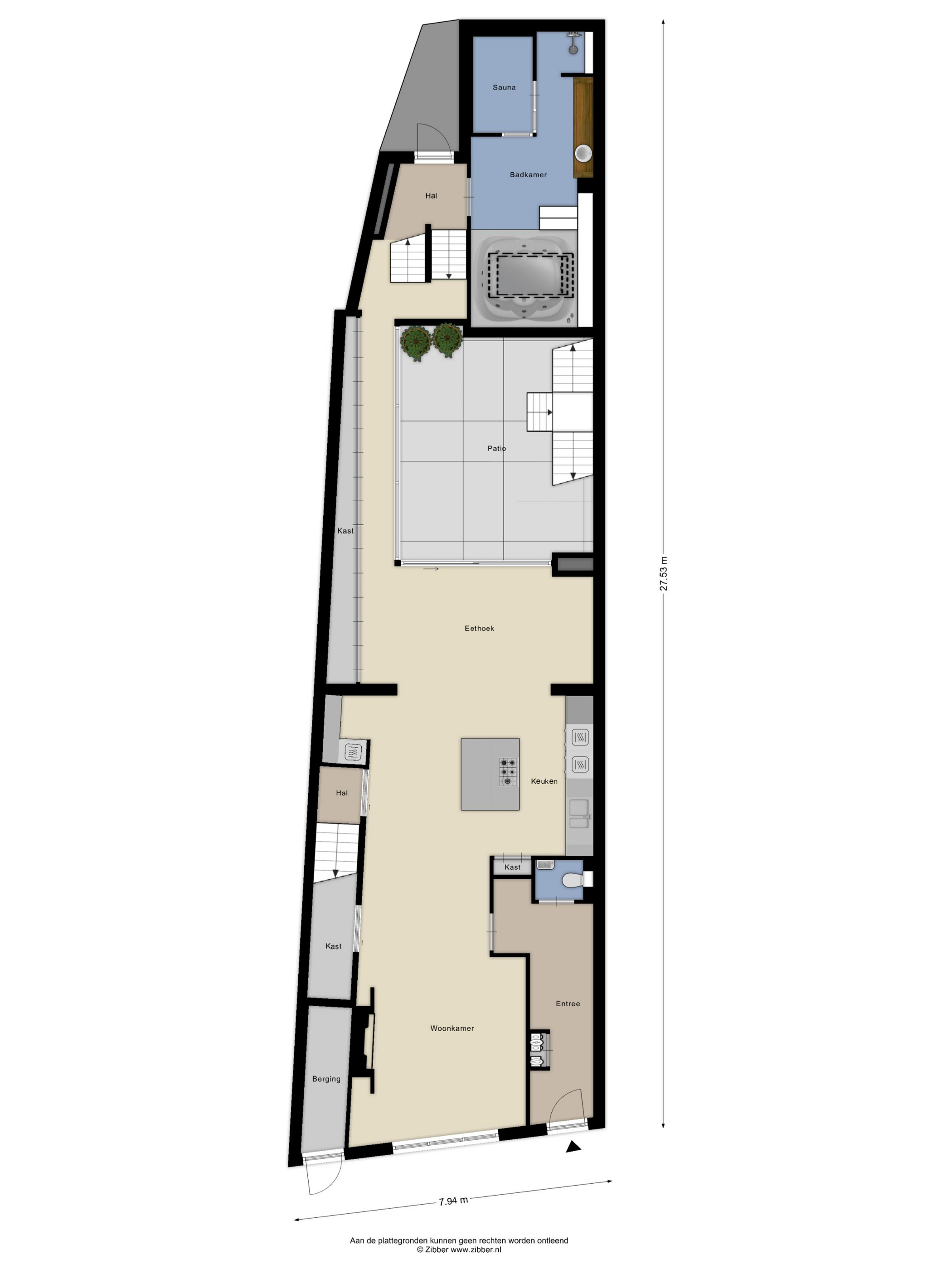 Of course, everyone is familiar with the front of St. Jacob's Church. But your visitors will still be surprised by the view from this side. The architect's approach to this project was a surprising one. By installing a huge transparent wall, the inside becomes the outside, and vice versa. The wall can be slid open in two directions from the corner. During the day, it's a wonderfully bright spot for a cozy dining table, and in the evening, you can dine with this remarkable view. The long wall of cabinets makes your home both practical and tasteful. This home also offers more outdoor space than is typical in the city center. In addition to a large courtyard garden, there are two roof terraces. So, you can choose your own spot for sun, shade, reading a book, enjoying a glass of wine together, or enjoying a delicious dinner al fresco.