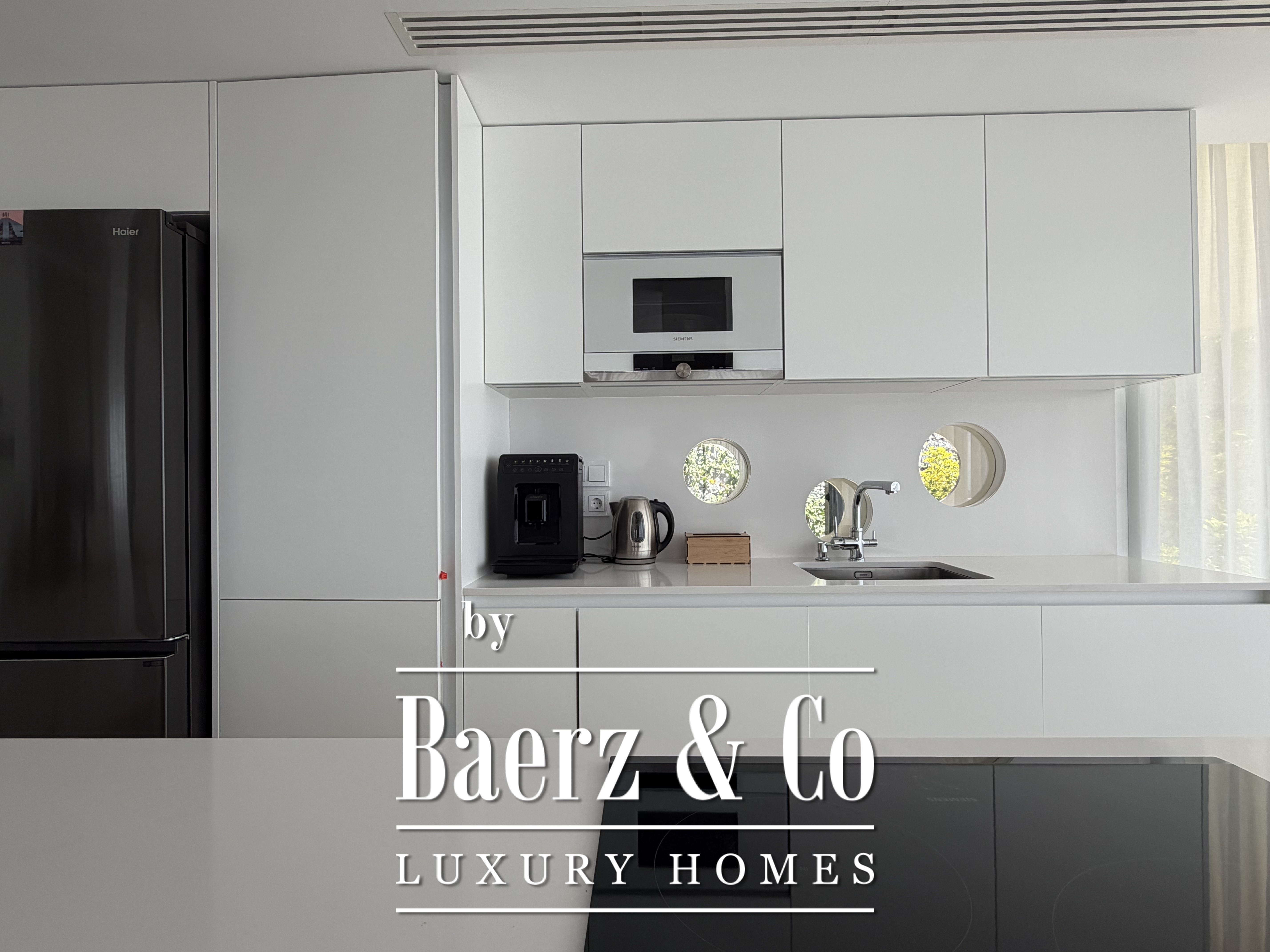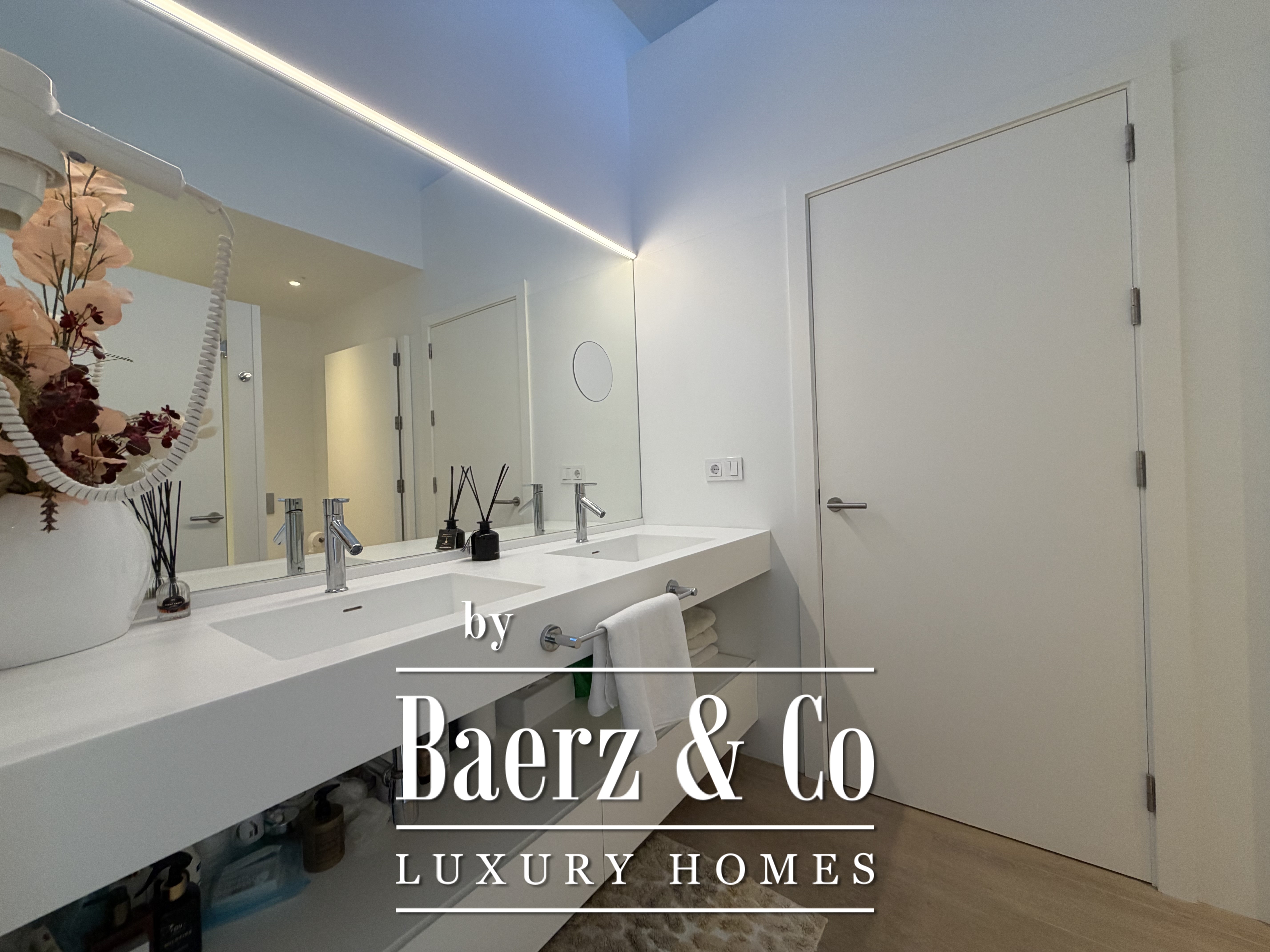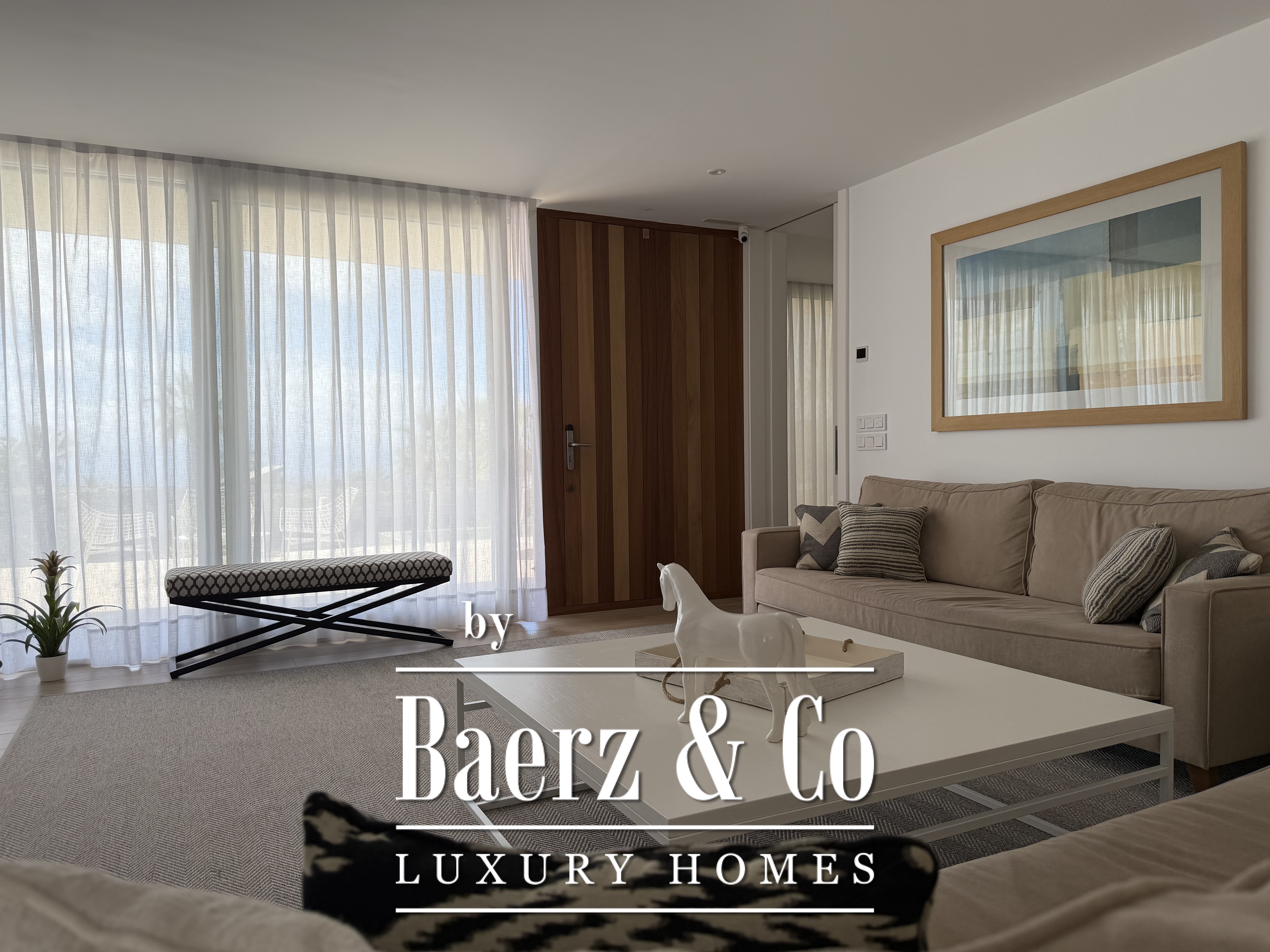 Natural light fills the interiors through expansive windows, framing the horizon and creating seamless access to the terrace and landscaped garden. Three bedrooms offer dressing rooms, while two bathrooms feature modern showers, underscoring the emphasis on refined functionality. The bright living room invites relaxation, whether enjoying a quiet moment or sharing the space with guests.
