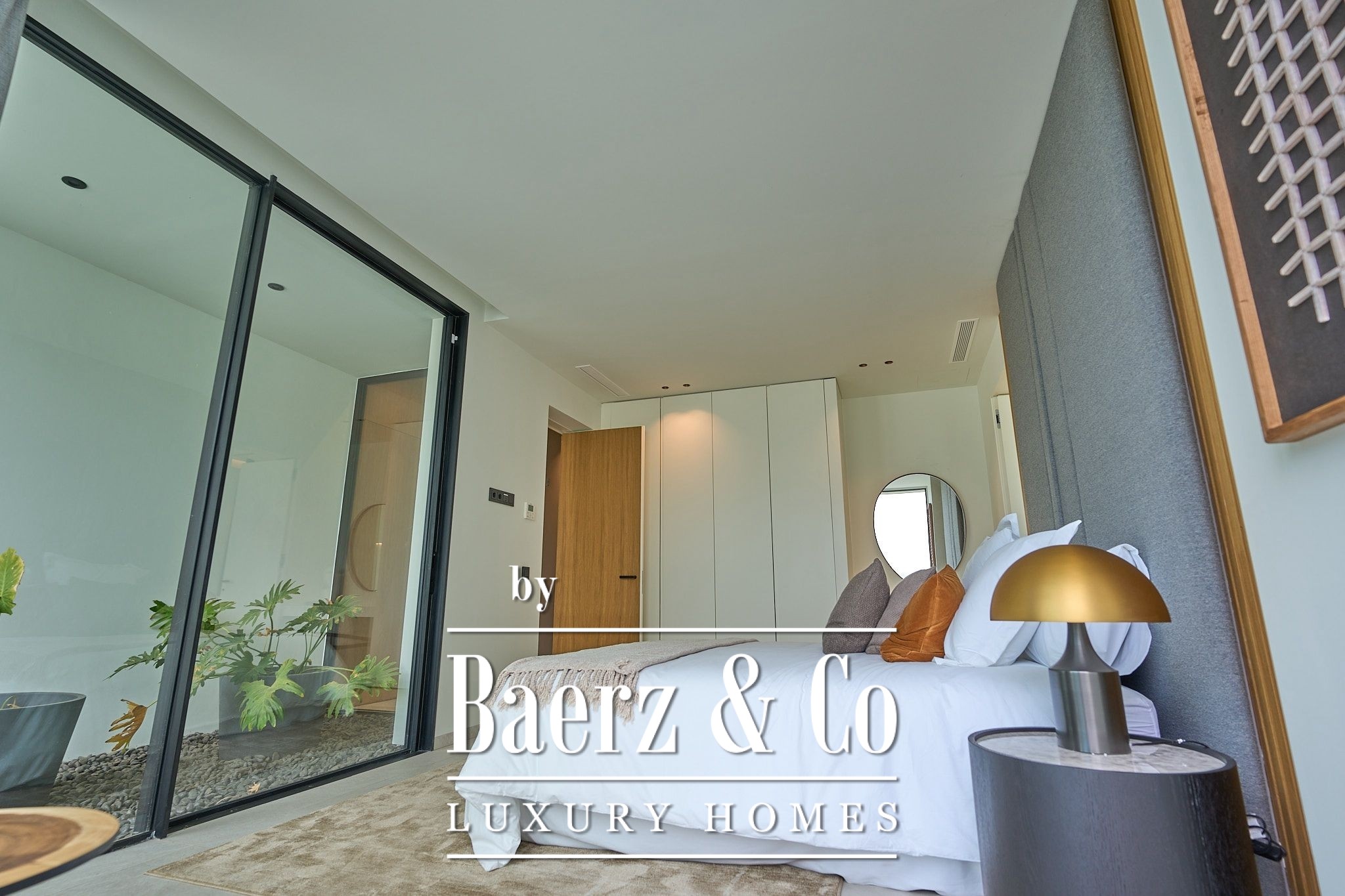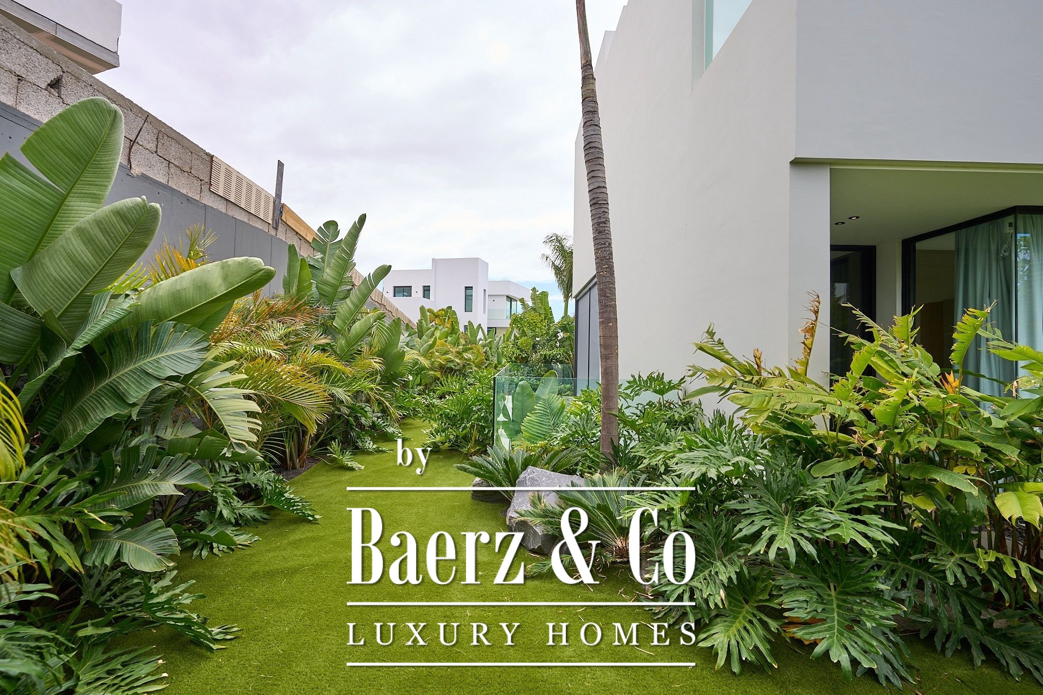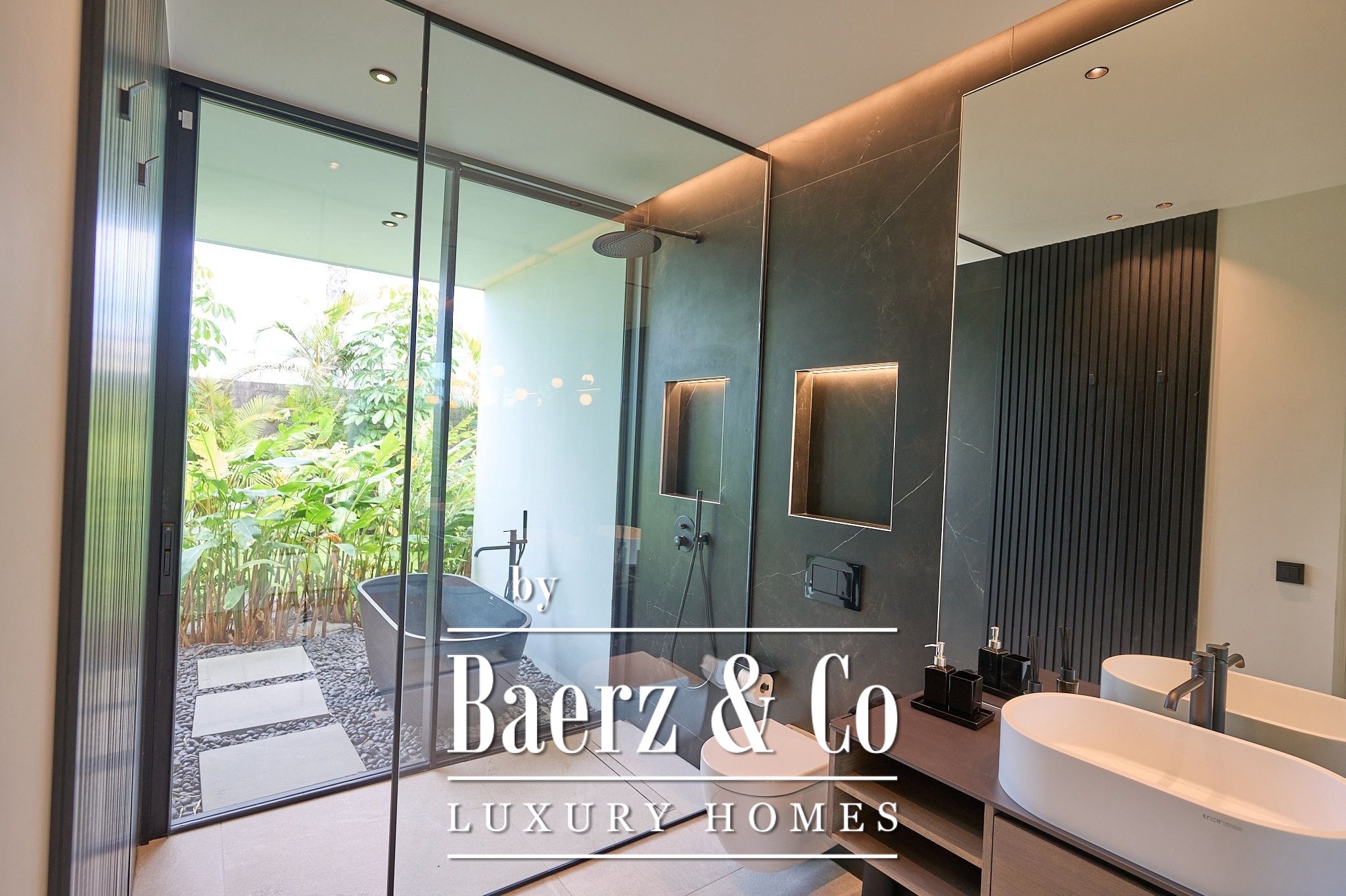 The villa features four en-suite bedrooms, each with built-in wardrobes and private access to lush tropical gardens that elevate the sense of space and tranquility. Upstairs, the spacious living and dining area flows naturally into a modern, fully equipped kitchen complemented by a climate-controlled wine cellar, while expansive windows amplify natural light and connect seamlessly to the exterior.