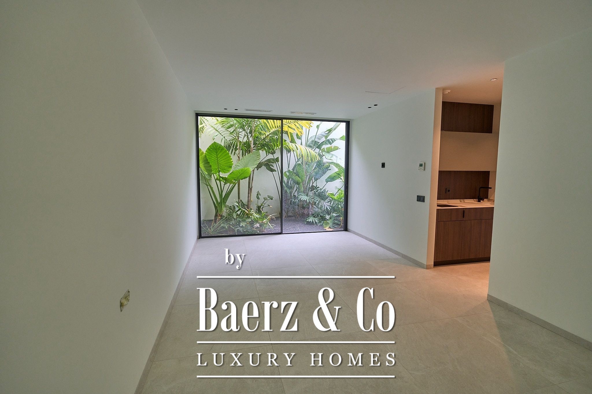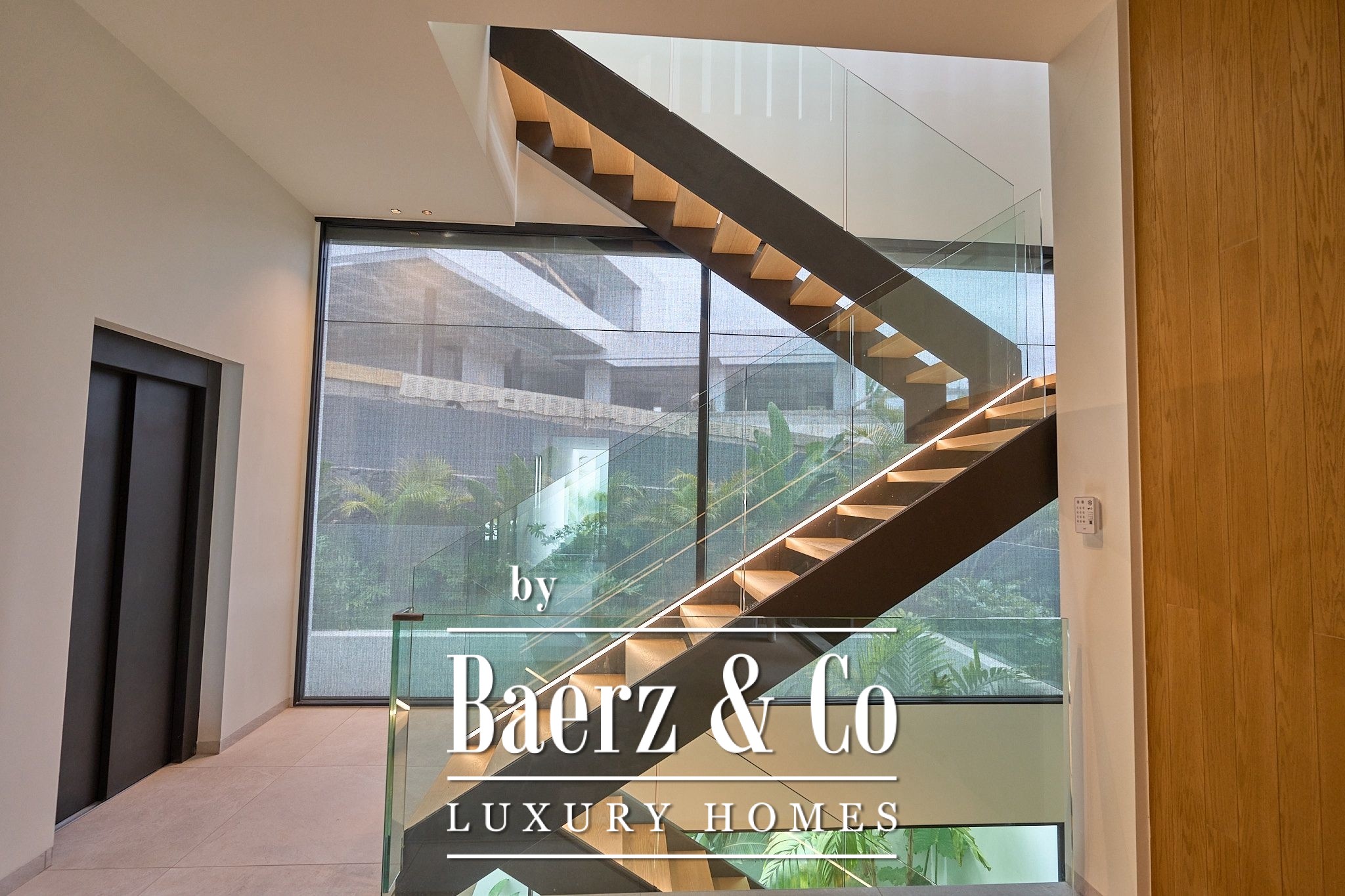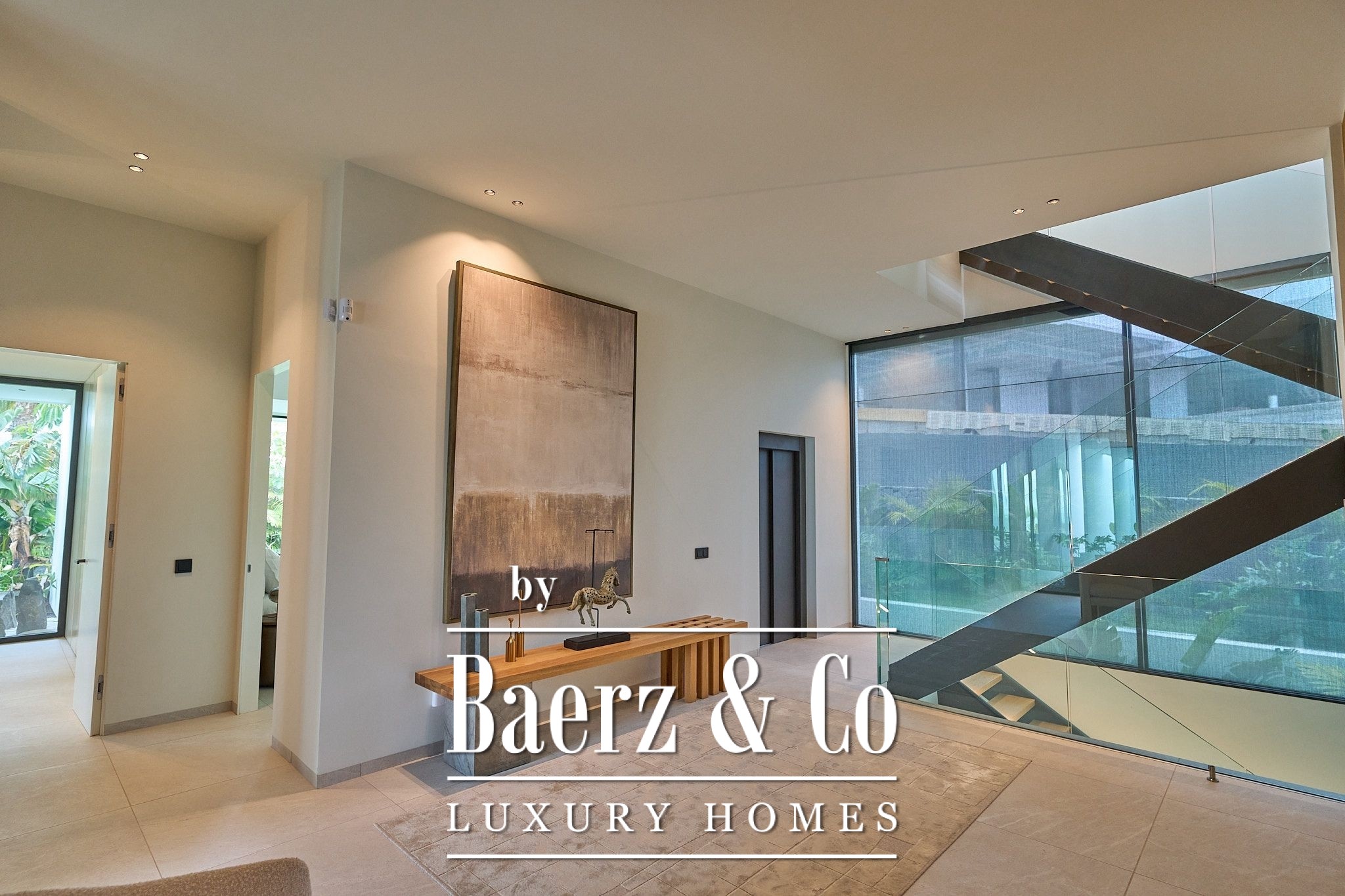 The villa features four en-suite bedrooms, each with built-in wardrobes and private access to lush tropical gardens that elevate the sense of space and tranquility. Upstairs, the spacious living and dining area flows naturally into a modern, fully equipped kitchen complemented by a climate-controlled wine cellar, while expansive windows amplify natural light and connect seamlessly to the exterior.