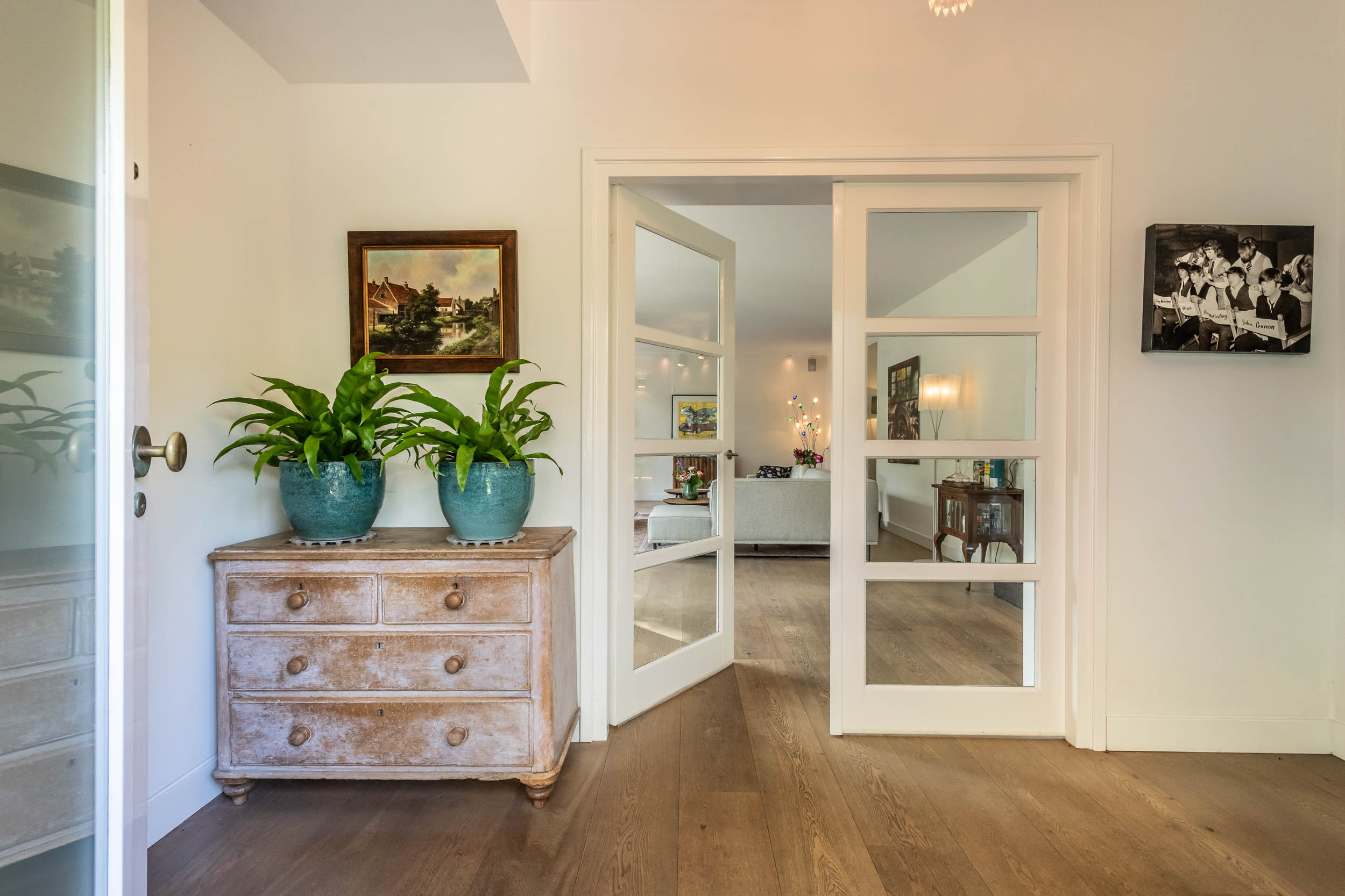 Entrance hall, spacious hallway with toilet and urinal, bright and spacious living room with fireplace, oak flooring and doors to the front terrace. A double door connects to the second living room/TV room with large windows and a view of the back garden. Luxurious, tailor-made kitchen-diner (’t Spant in Heemstede, 2022) featuring underfloor heating, a sink/kitchen island and various built-in appliances: wine climate cabinet, ovens, Quooker with sparkling water feature, coffee machine, Bora electric hob with flex zones and dishwasher. Door to the side garden.