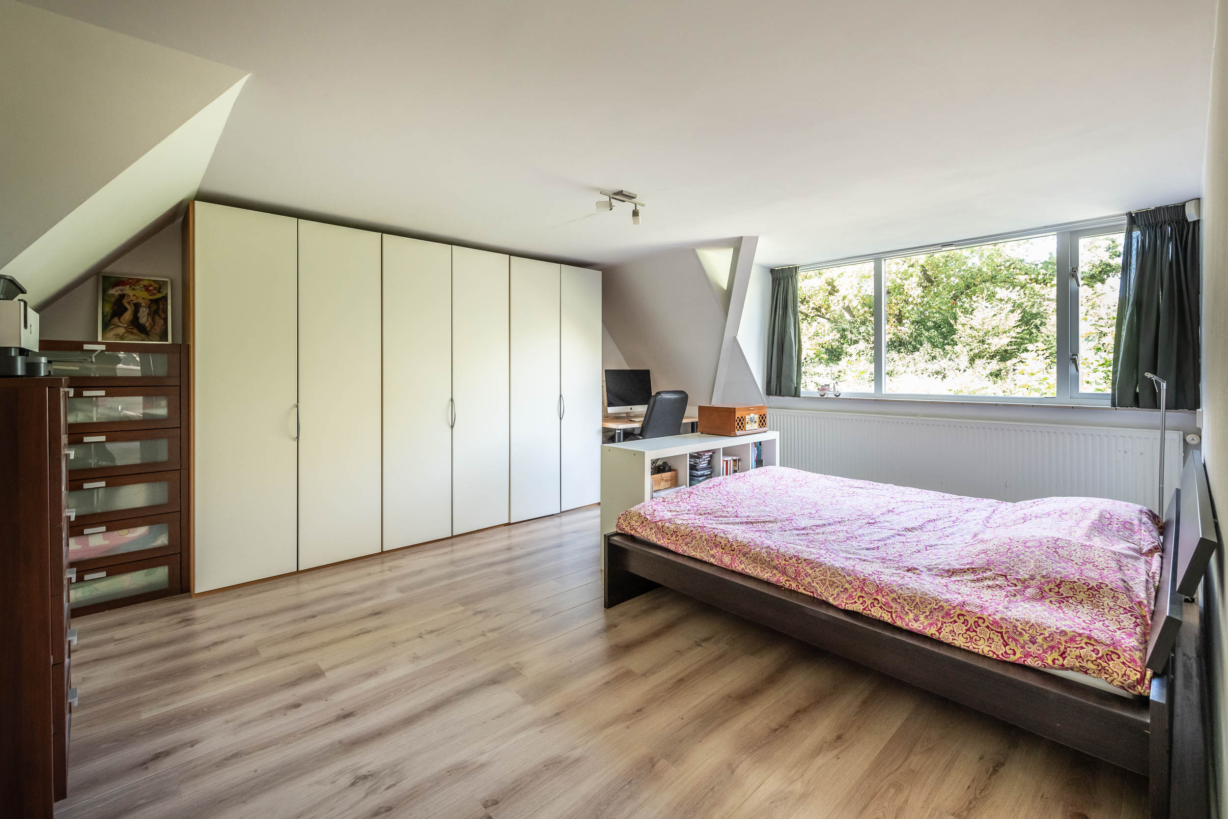 Landing, three bedrooms, including the spacious master bedroom (formerly two rooms) with walk-in wardrobes on both sides. Modern, tailor-made bathroom (’t Spant in Heemstede, 2022) with large dormer window, double washbasin unit, toilet, ample cupboard space, underfloor heating, freestanding bathtub, walk-in shower with Sunshower and hand shower.