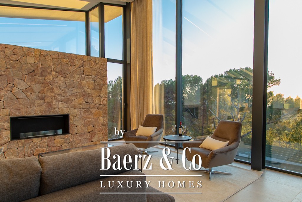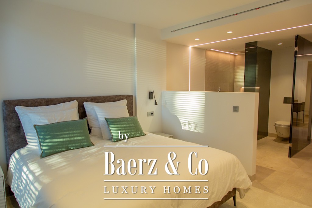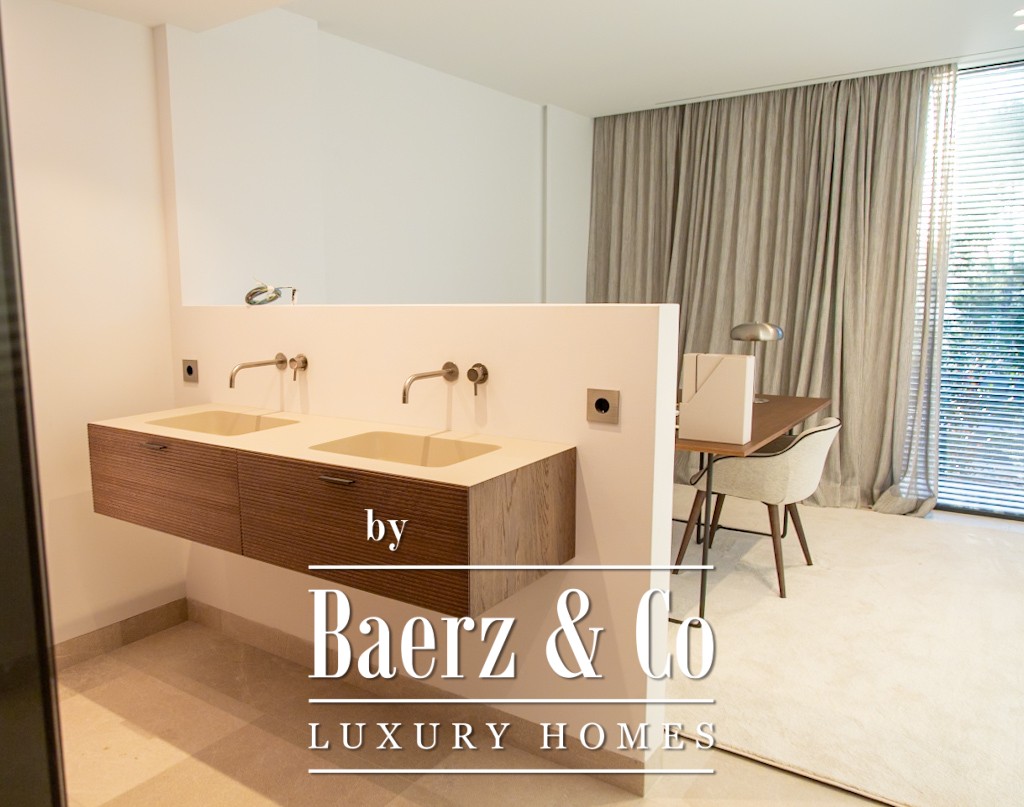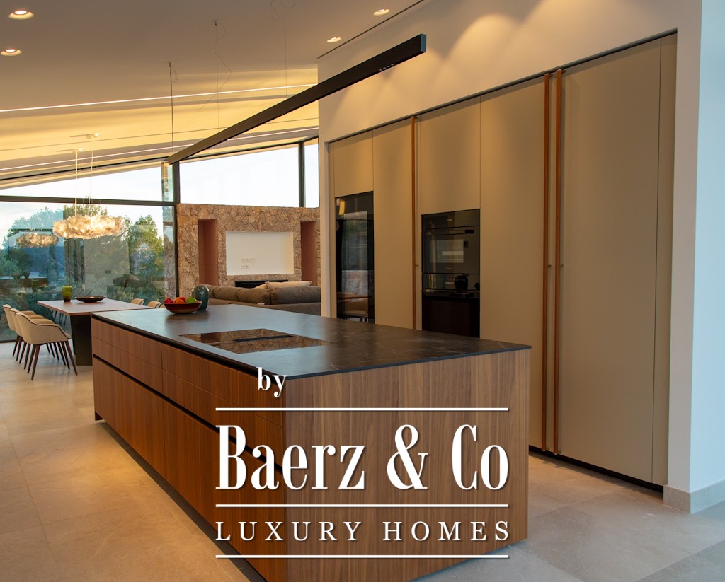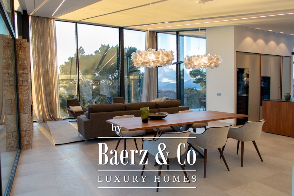 This modern villa Alcúdia features four spacious bedrooms, each with en suite bathroom, and a master suite enhanced by a dressing room and private covered terrace. Designed for comfort and privacy, the spacious layout blends seamlessly with a Boffi kitchen, an expansive living and dining area, and connecting terraces. Two swimming pools and unobstructed views over the bay of Pollensa and Tramuntana mountains lend a tranquil, year-round visual experience.