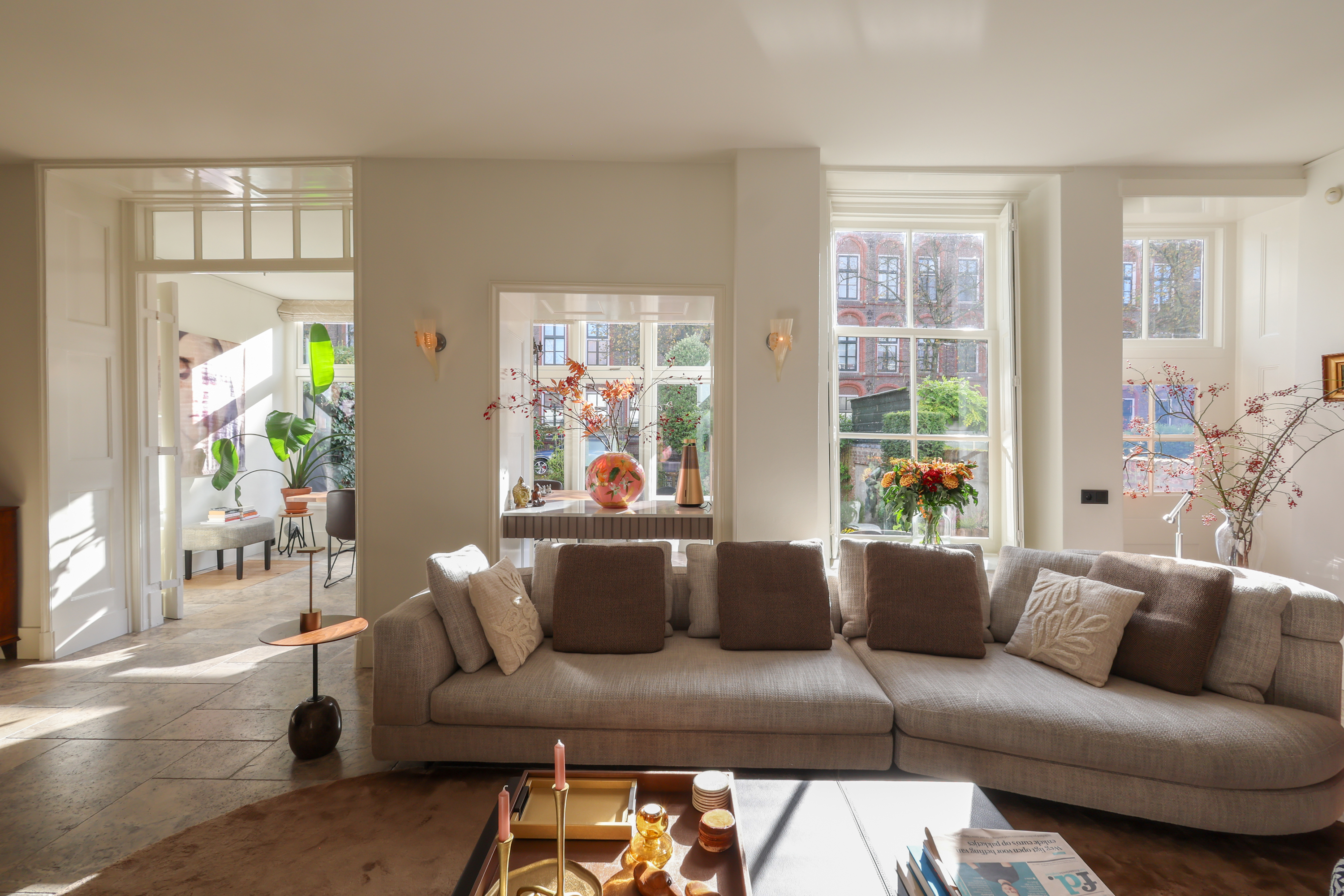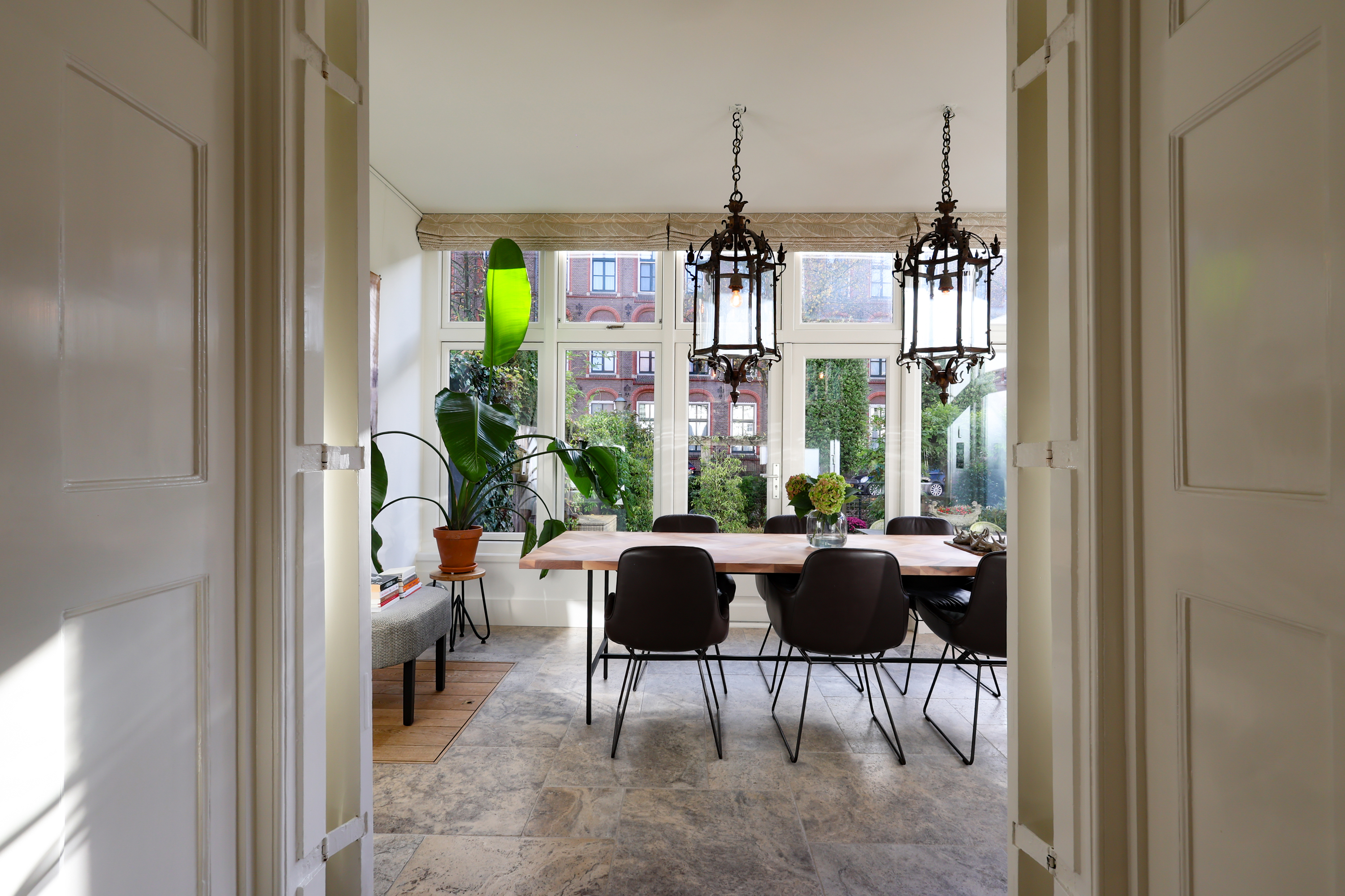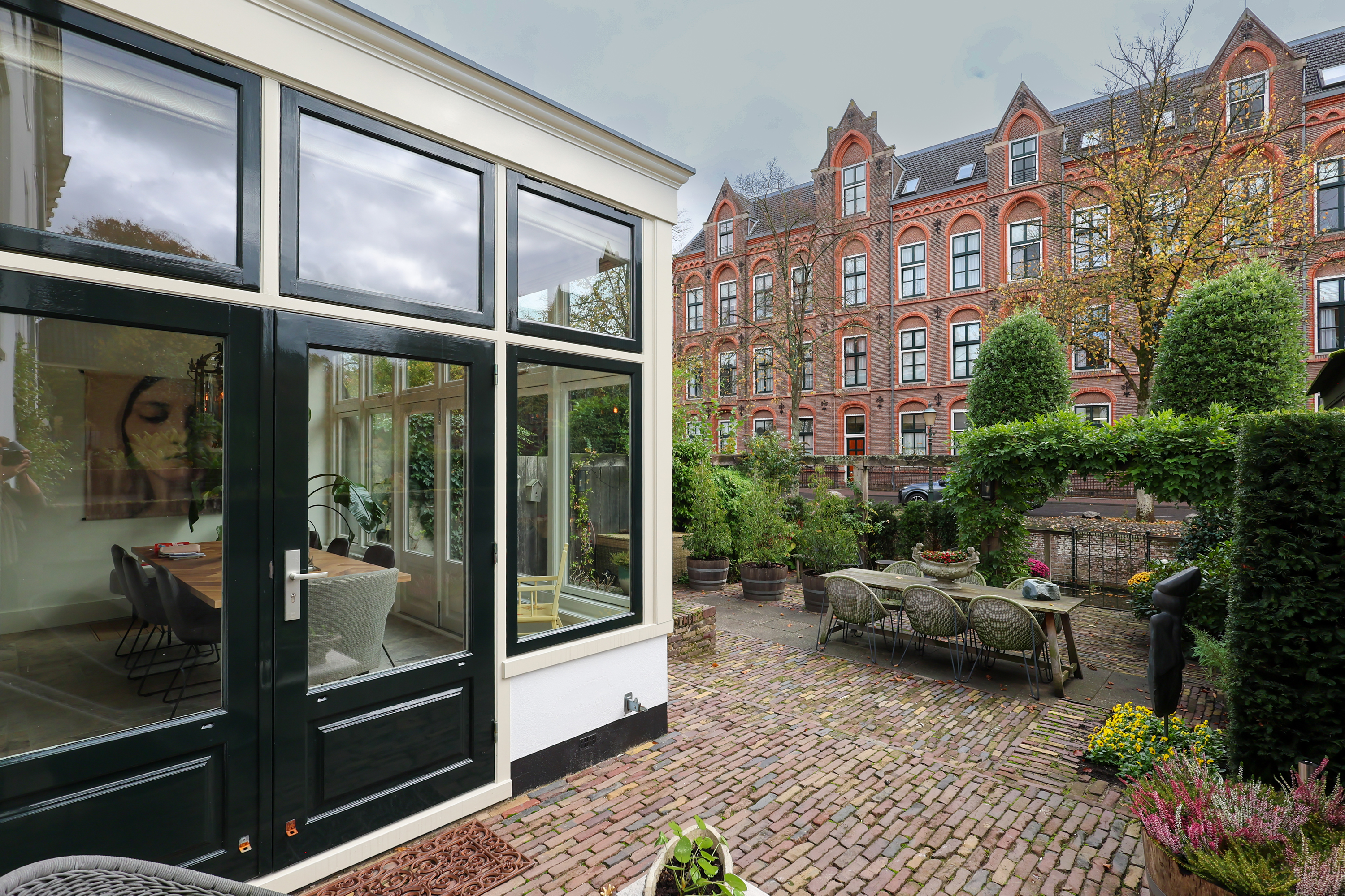 Stepping inside, the atmosphere is defined by light, volume, and original detail. The living room’s open fireplace and traditional windows frame city views, while the Lodder kitchen and breakfast nook overlook the storied avenue. A striking conservatory opens directly to the private garden, where a terrace sits softly above the Zuidsingel canal—cultivating a sense of peace just steps from the city’s rhythm.