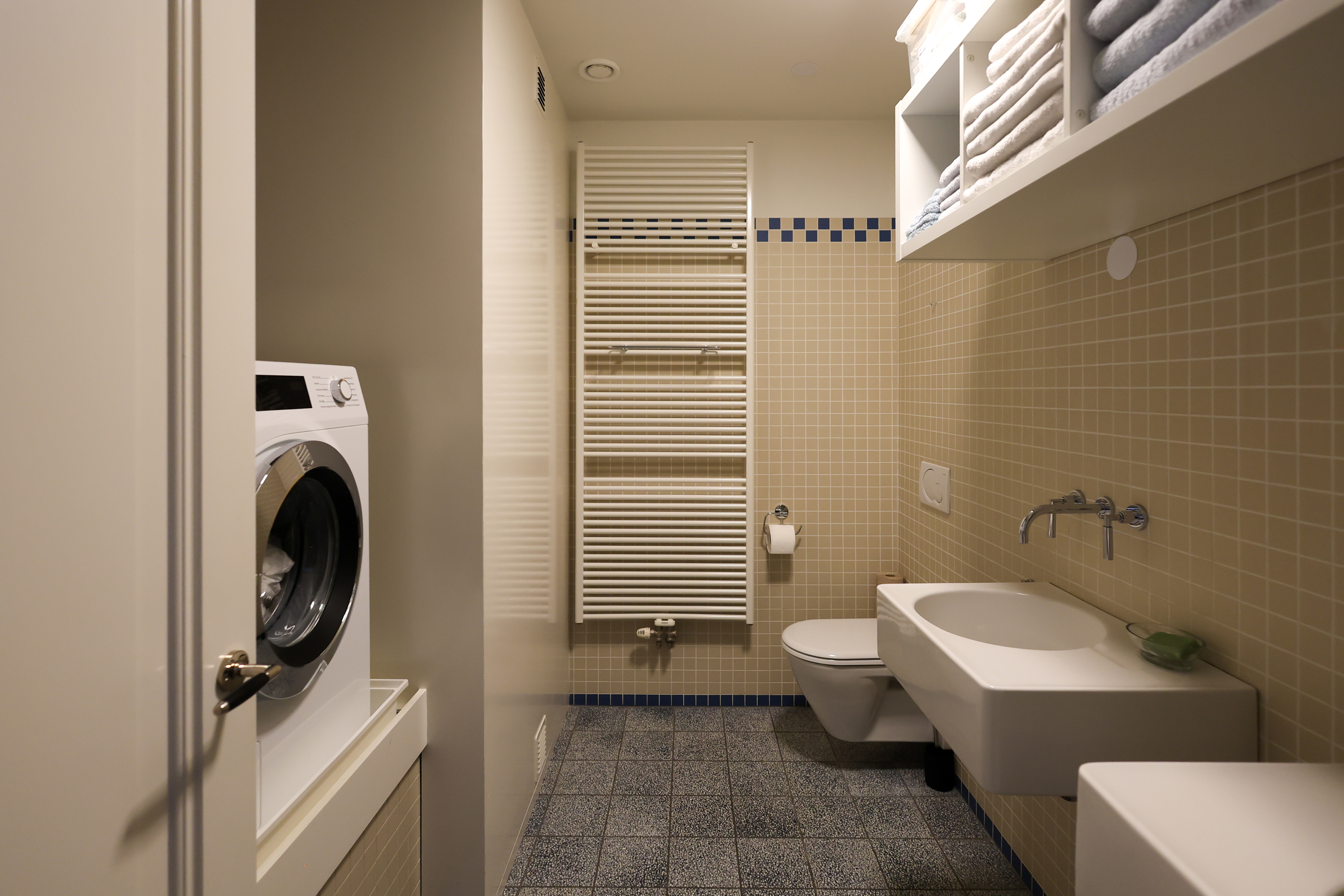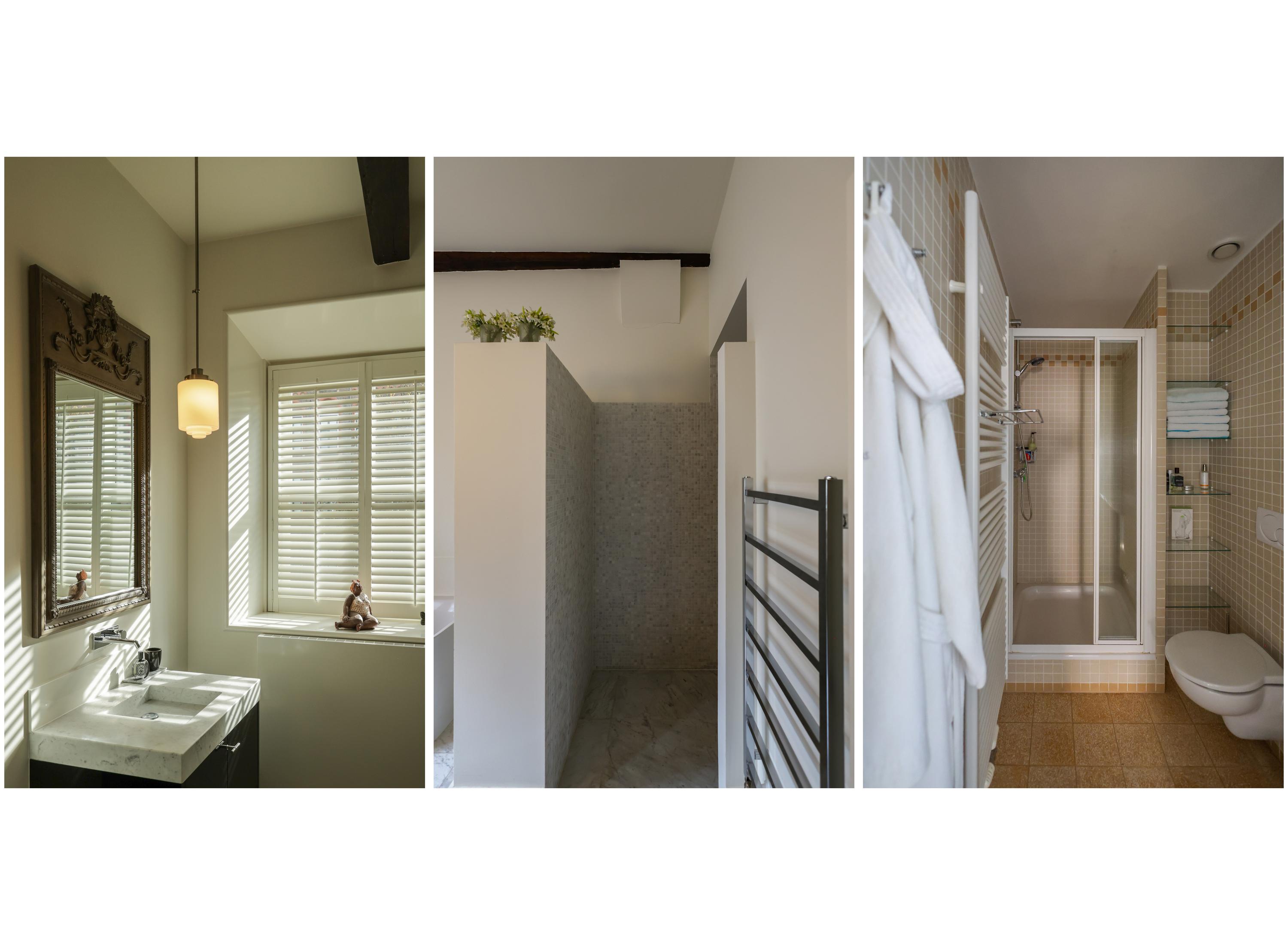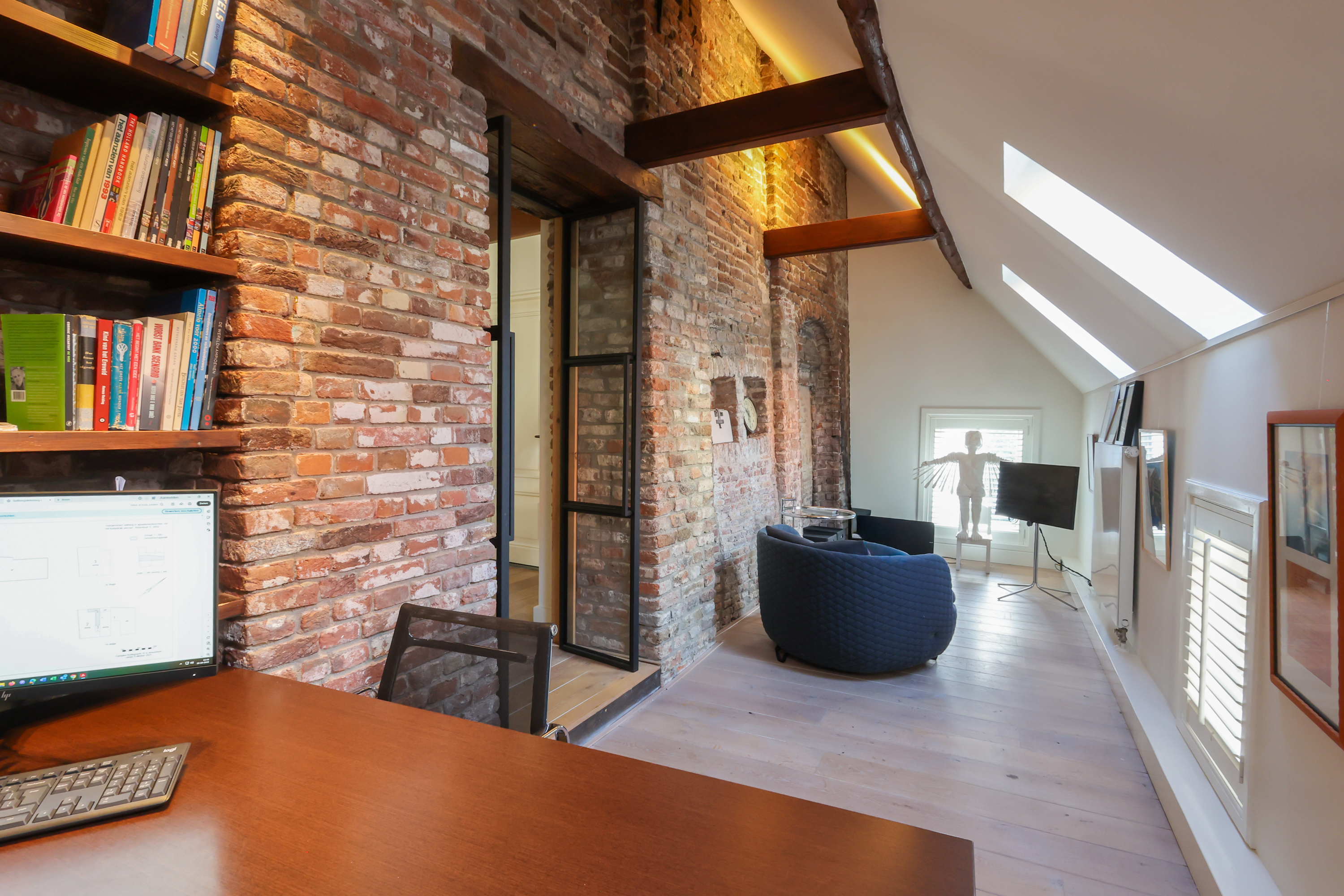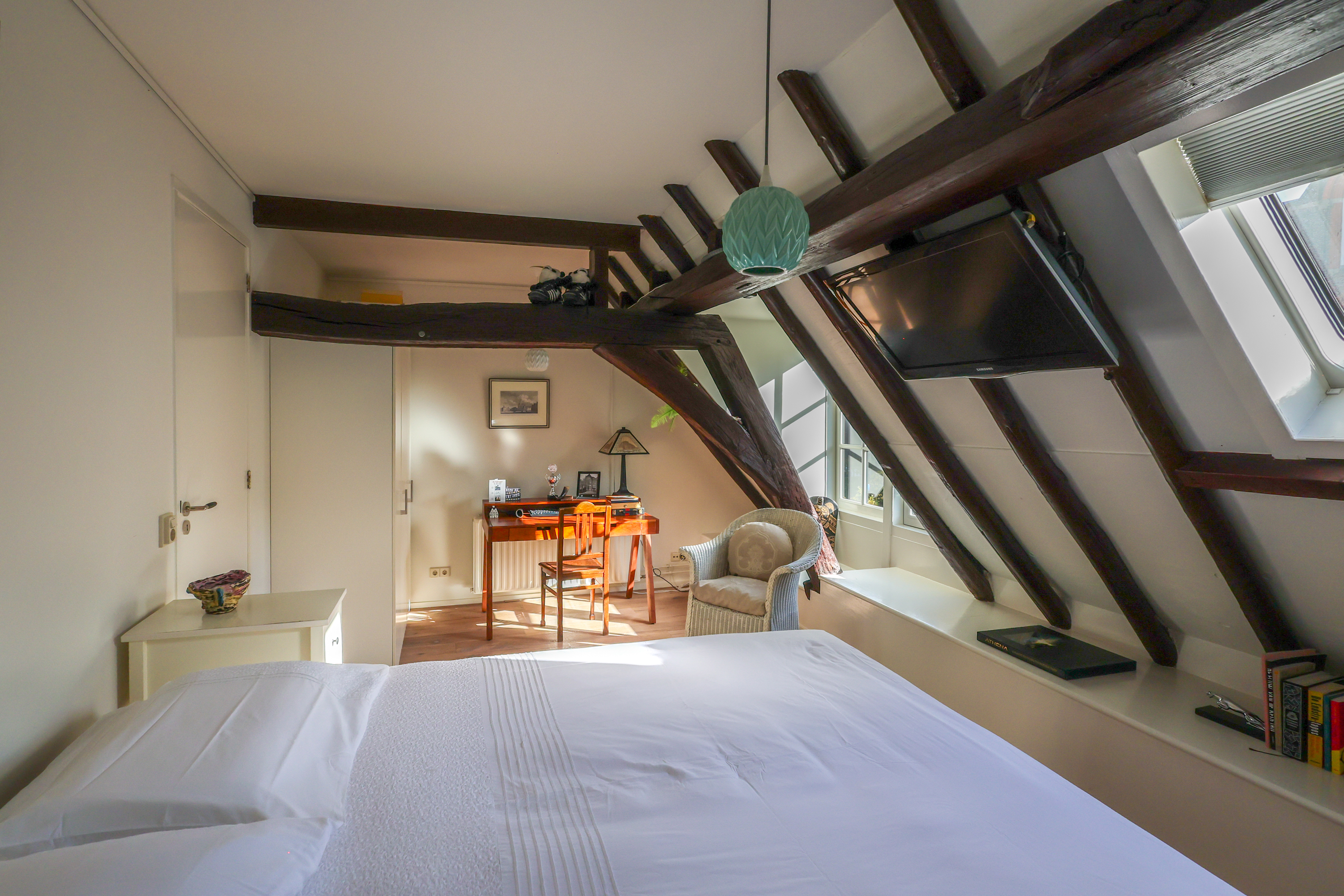 The primary bedroom features a walk-in closet with custom cabinetry and a spacious bathroom. Upstairs, an impressive work or play area showcases exposed segments of the old city wall beneath generous skylights, accentuating the connection to Amersfoort’s rich past. Three more bedrooms and a second bathroom offer flexible accommodation.