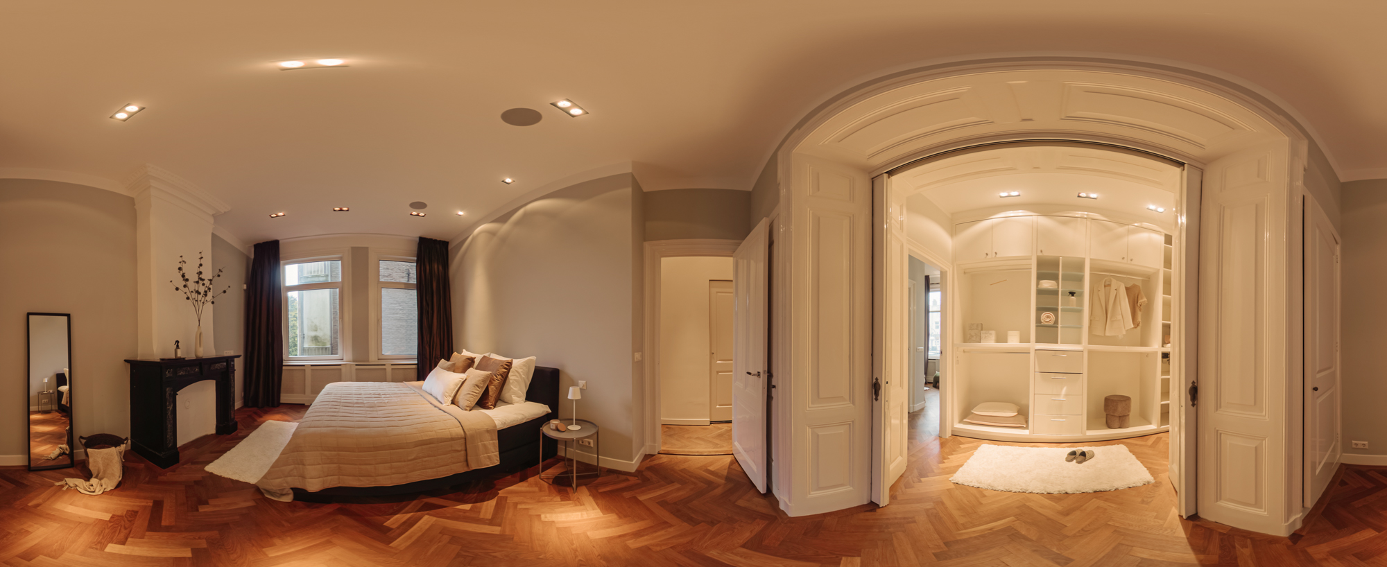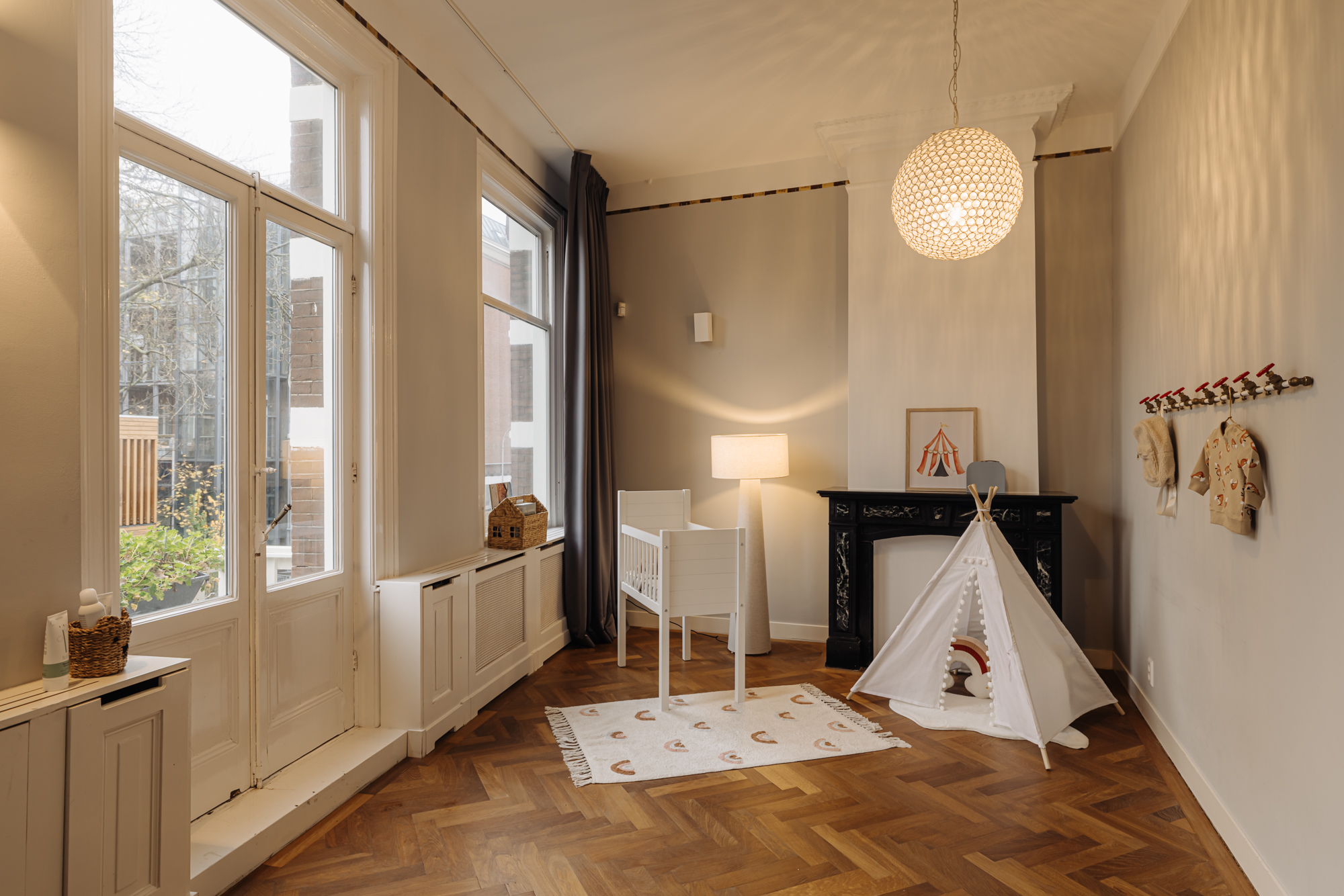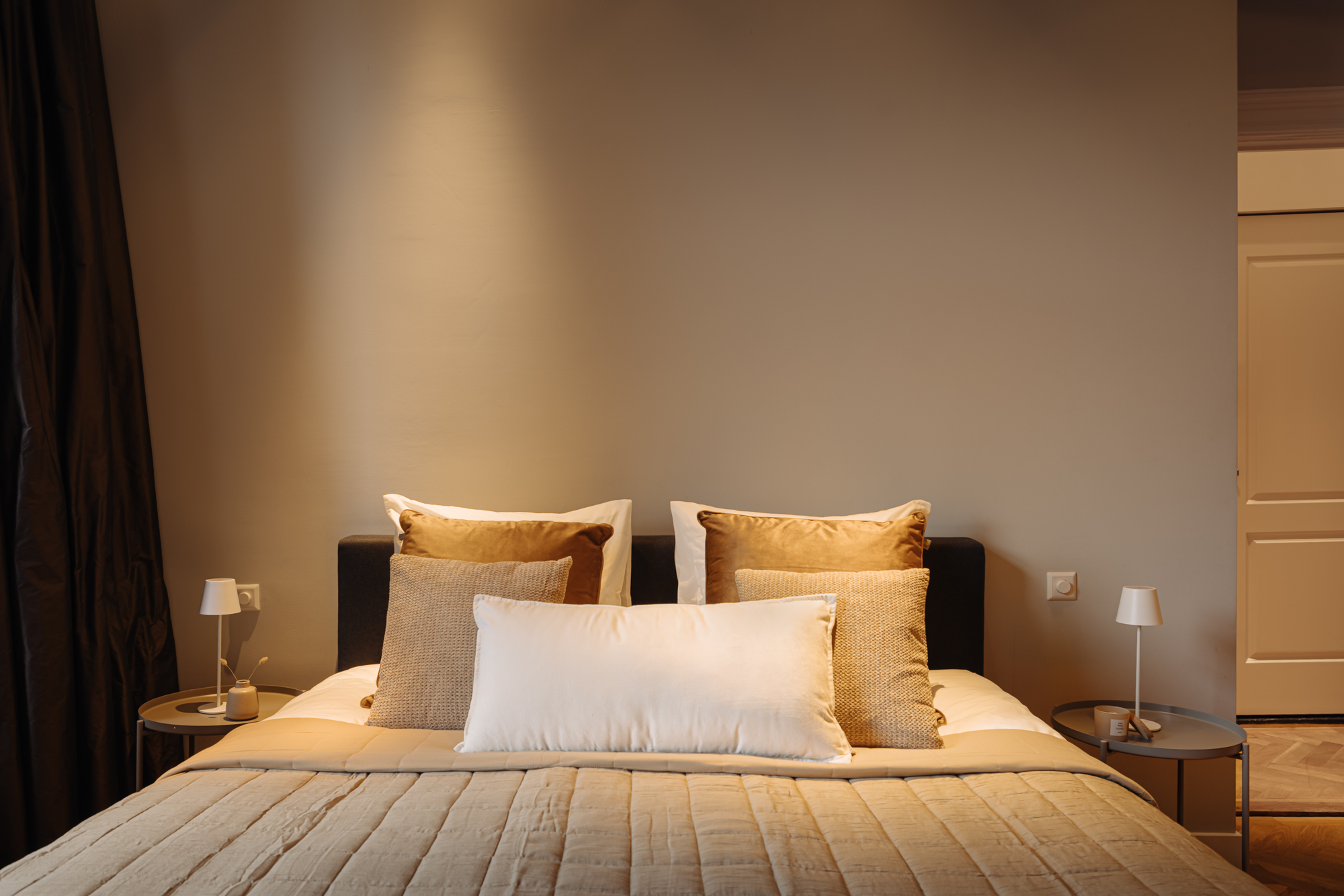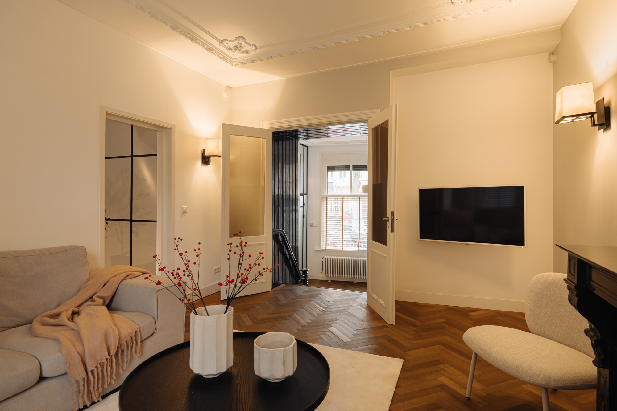 The entrance is located on the ground floor. Upon entering, you step into a beautifully designed hallway where the character and refined style of the home immediately become visible. The high ceilings, warm tones, thoughtful lighting, ceiling ornaments and classic details create a welcoming atmosphere that almost makes you forget you are in the centre of the city.