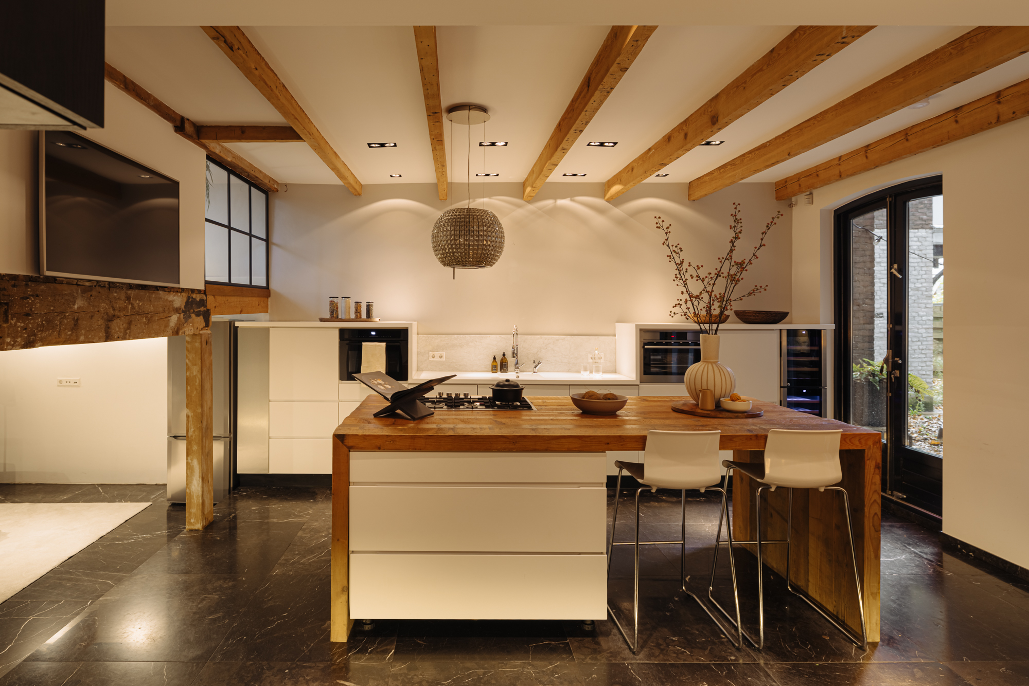 A staircase from the bel-étage leads to the souterrain. Here you will find the spacious kitchen-diner with a high ceiling and access to the patio. The kitchen is equipped with a large cooking island with space for bar stools and fitted with all desired appliances: dishwasher, refrigerator, freezer, wine climate cabinet, oven and a four-burner gas hob.