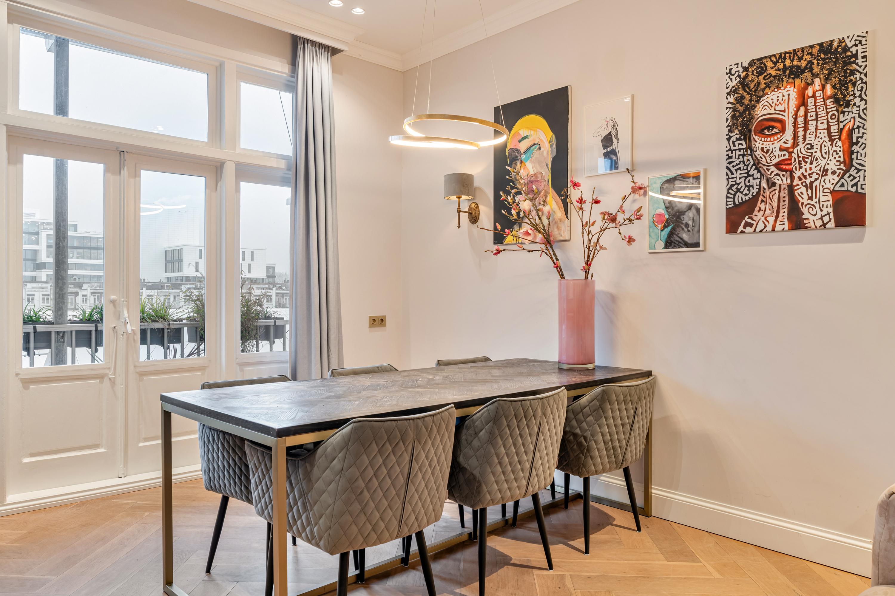 Fully renovated, high-end apartment of approximately 82 m², featuring high ceilings (3.16 m), three bedrooms, a luxurious bathroom, a sunny balcony, and a well-proportioned rooftop terrace (approx. 33 m²) complete with an outdoor kitchen and outdoor bath. The apartment is situated in a well-maintained building, which was redivided in 2023, in one of the most desirable locations along the Amstel.