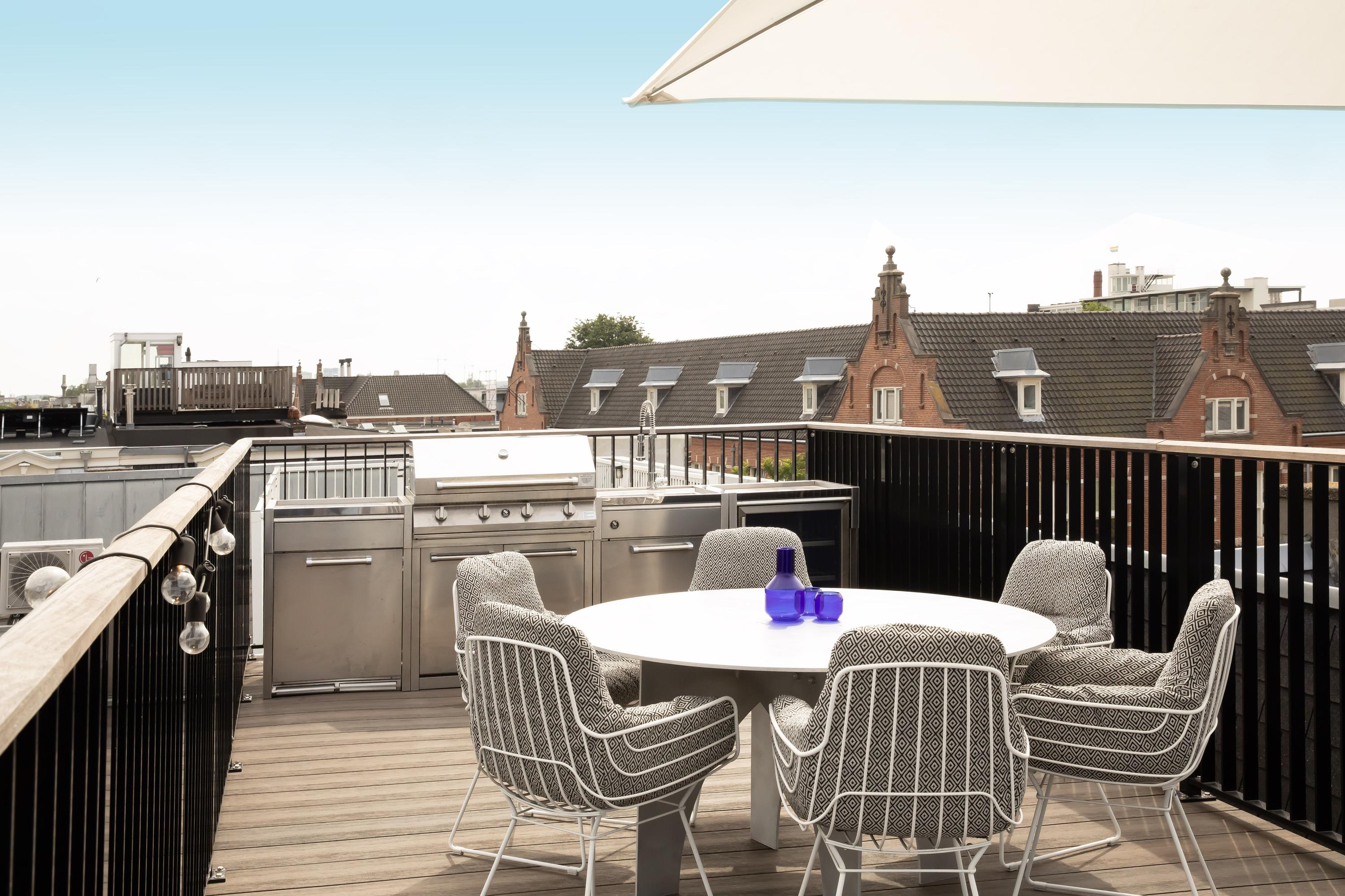 This apartment spans two floors and features a strikingly wide façade with no fewer than four large windows. The property offers a generous living room with open kitchen, a balcony, two well-sized bedrooms, and two modern bathrooms. The spacious roof terrace with outdoor kitchen provides a stunning view over the city. Finished with high-quality materials and great attention to detail, this loft-like apartment offers a stylish and comfortable living environment, with the vibrant city center just around the corner.
