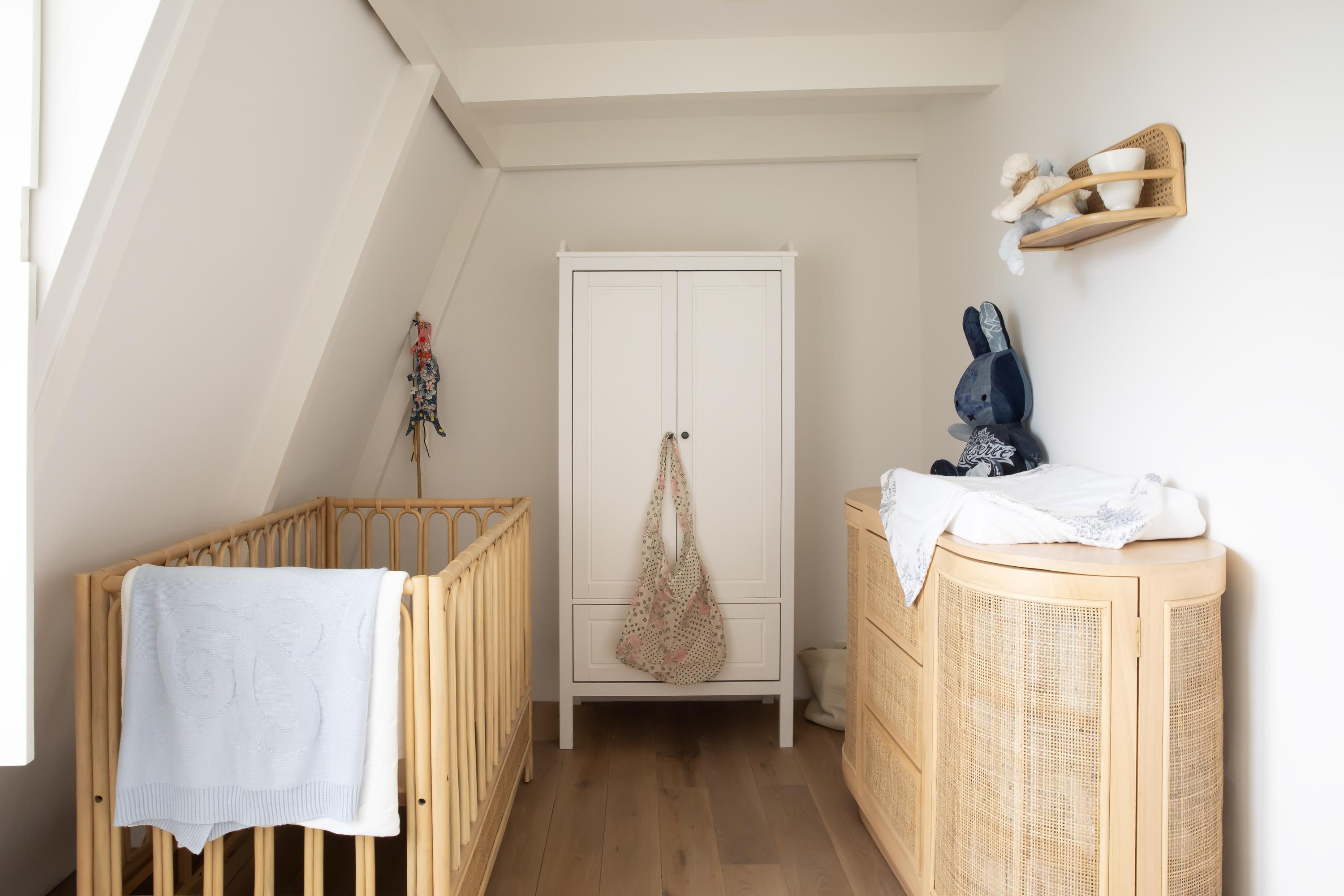 On the top floor you will find the spacious master bedroom, complete with a stylish built-in bed unit with integrated lighting, a freestanding bathtub, air-conditioning, and a characteristic beam construction. The en-suite bathroom features industrial details, a double sink with cabinet, walk-in shower, and toilet.