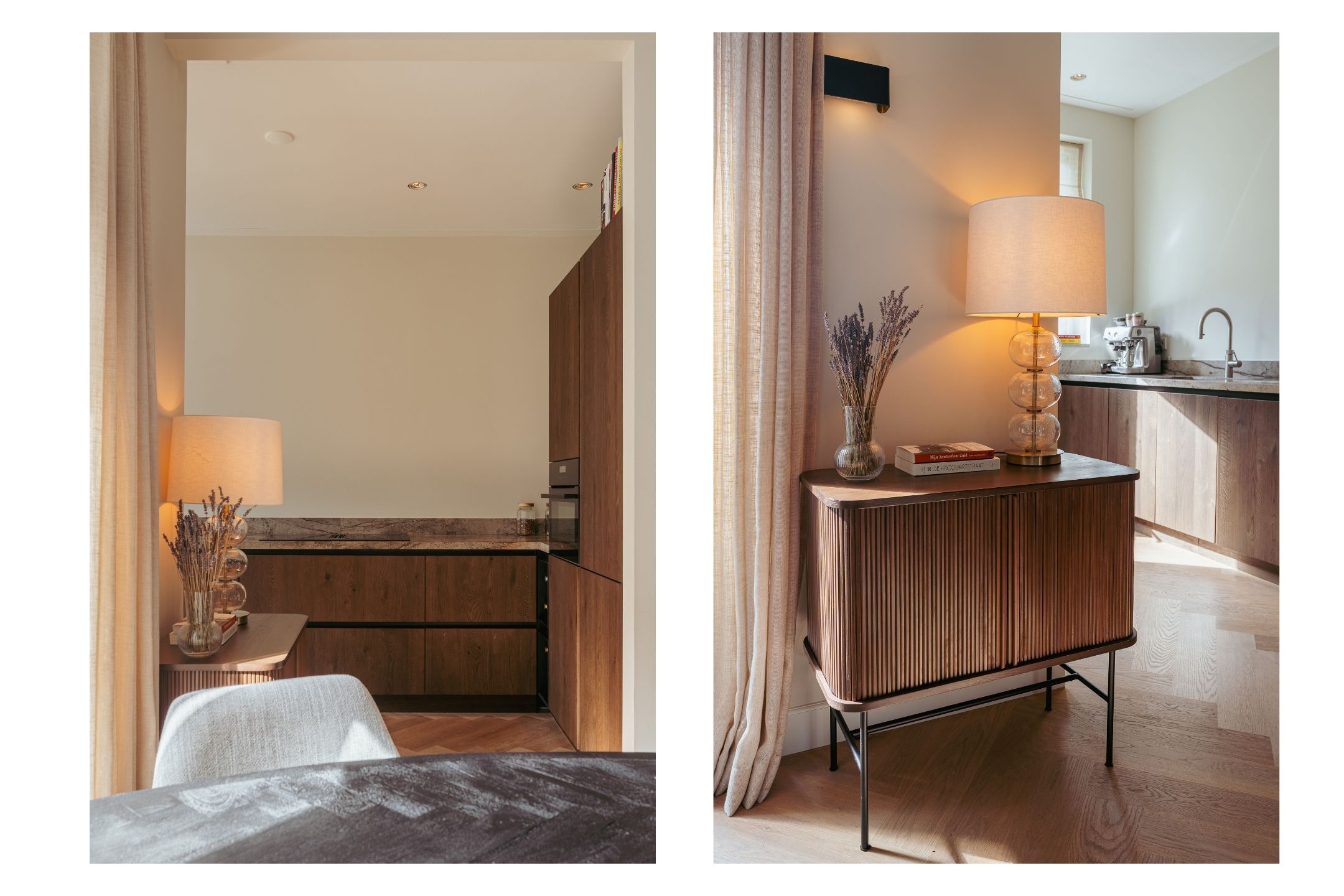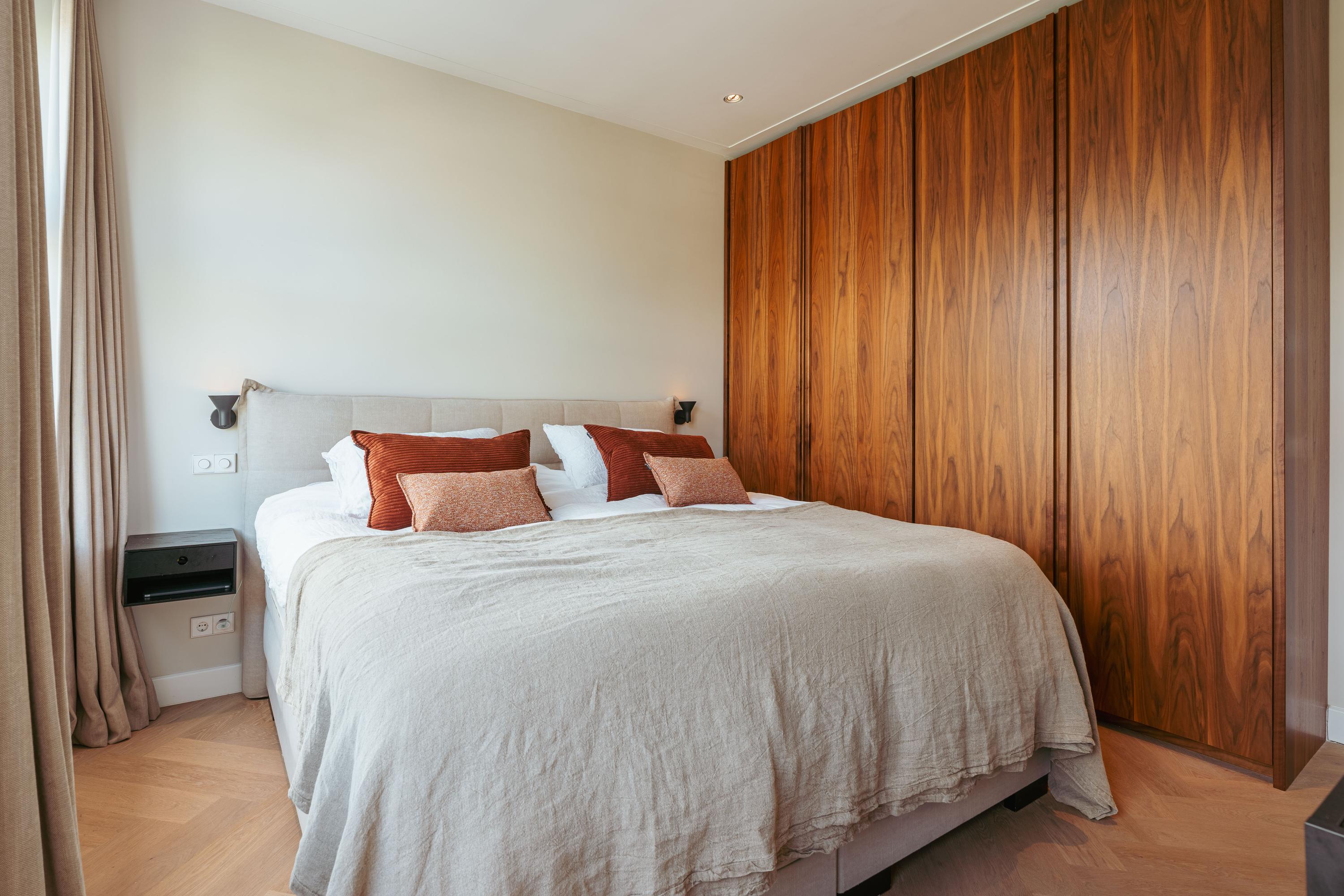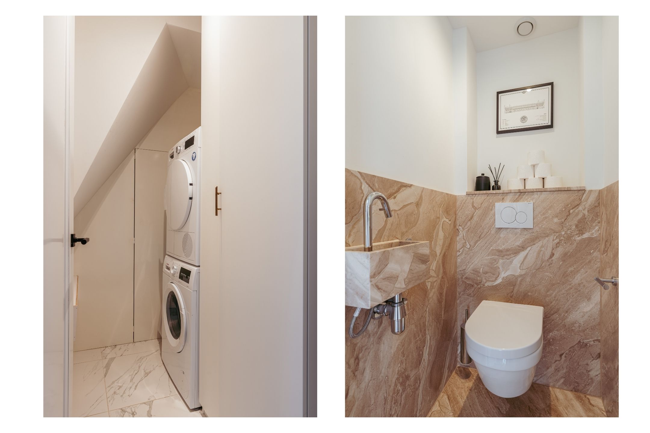 The semi-open kitchen is connected to the living area and equipped with an induction cooktop with downdraft extractor, combi-oven, dishwasher, refrigerator, freezer, and a Quooker. The kitchen features a stunning marble countertop. From here, you can access the second balcony, which includes a central heating cabinet. Both rear balconies are south-facing.
