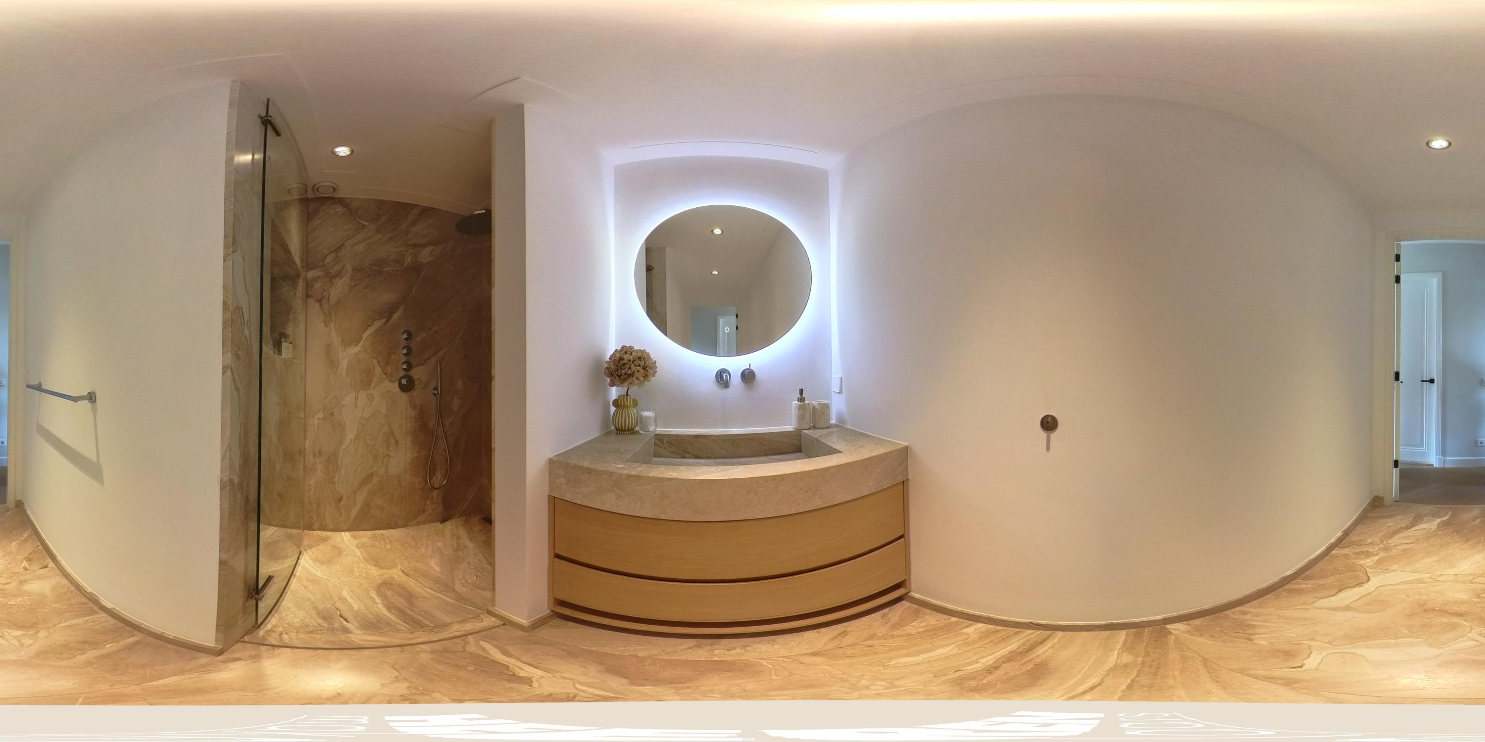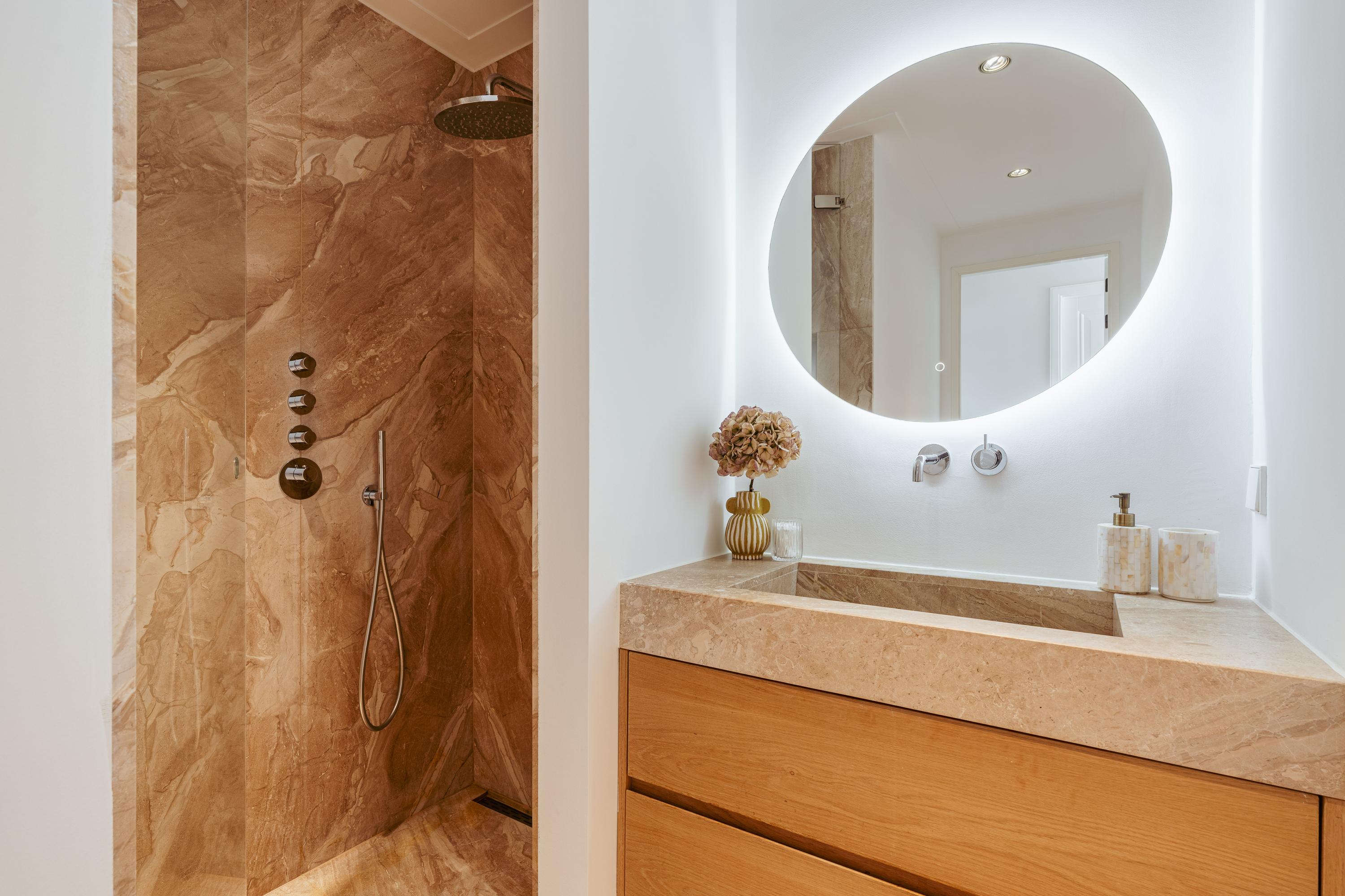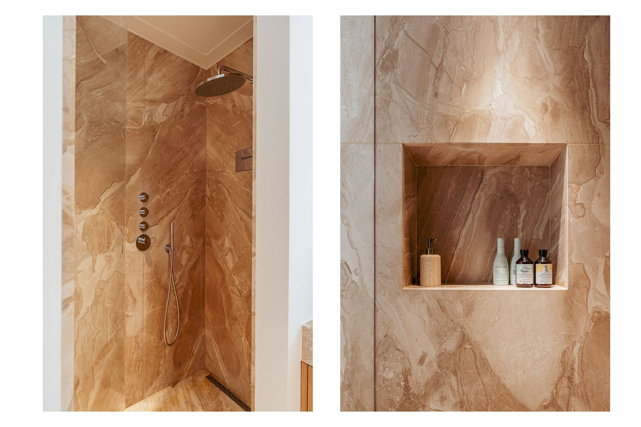 The centrally located bathroom is luxuriously finished with open book-matched travertine natural stone, and includes a walk-in rain shower with waterfall feature and a custom-made travertine vanity with illuminated mirror wall. The toilet is separate and features a matching custom-made travertine washbasin.