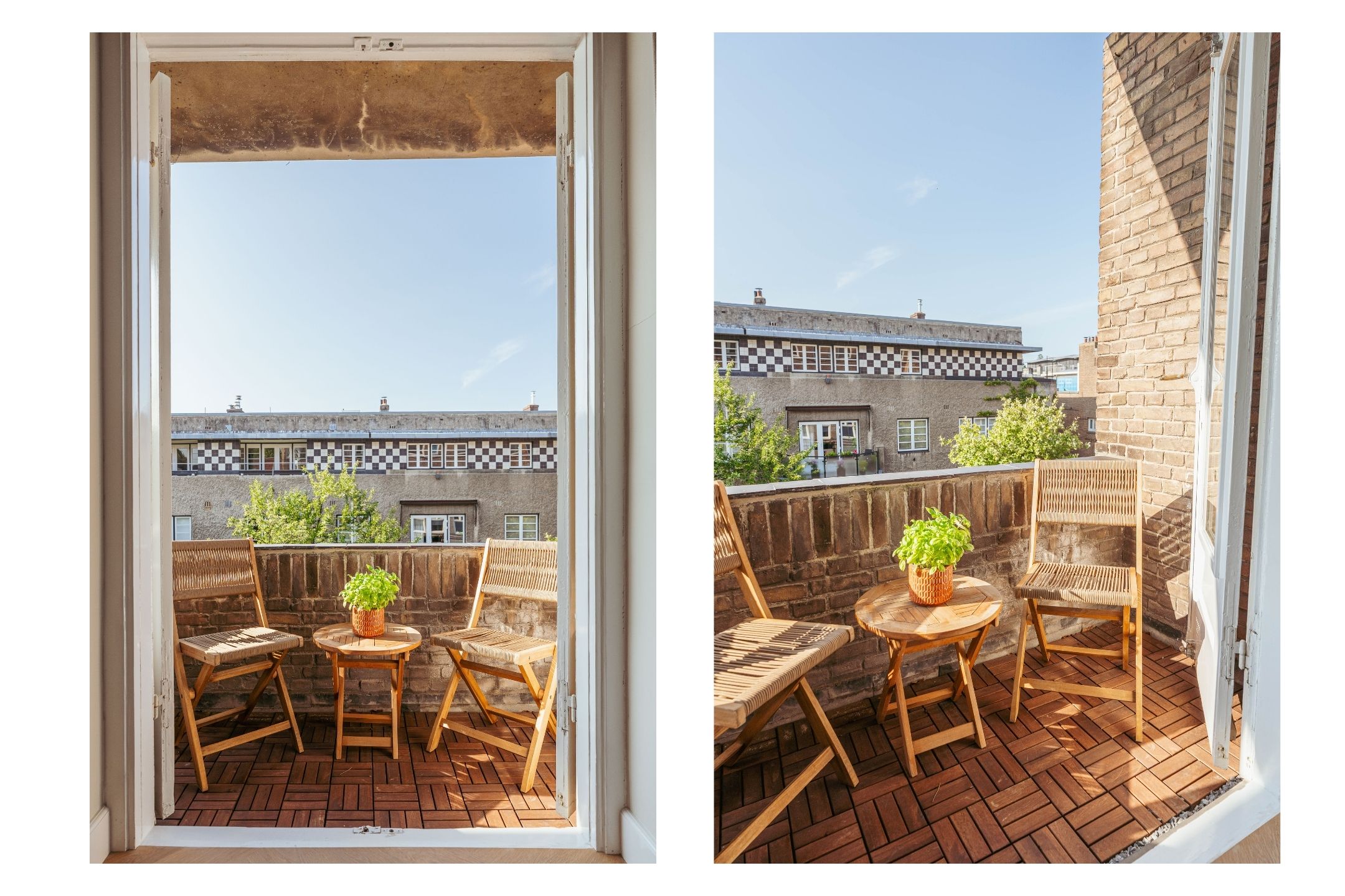 From the living room, a hallway leads to two front-facing bedrooms. The master bedroom includes beautiful built-in walnut wardrobes with integrated lighting. The second bedroom also has original double doors leading to the third balcony. This northwest-facing balcony allows you to enjoy the evening sun between approximately 6 and 9 PM in summer.