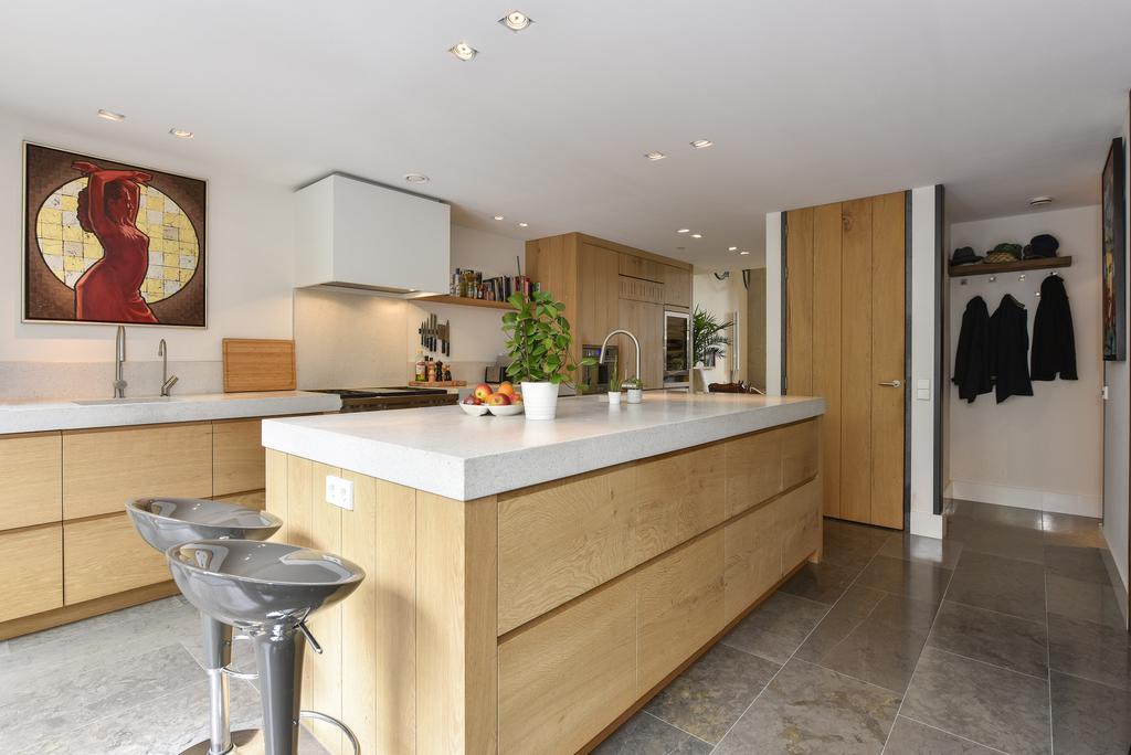 The generous entrance with a lift offers access to the apartment. Spacious hallway with separate toilet and cloakroom. You enter into the epicentre of the apartment - the open kitchen - which provides access to the spacious garden of 41 m2 through French windows. The luxurious and well-equipped kitchen is fitted with all the conveniences you can imagine. From the professional dishwasher to the several fridges, which make staying in this space an absolute joy. Here, you will also find a spacious cupboard under the stairs.