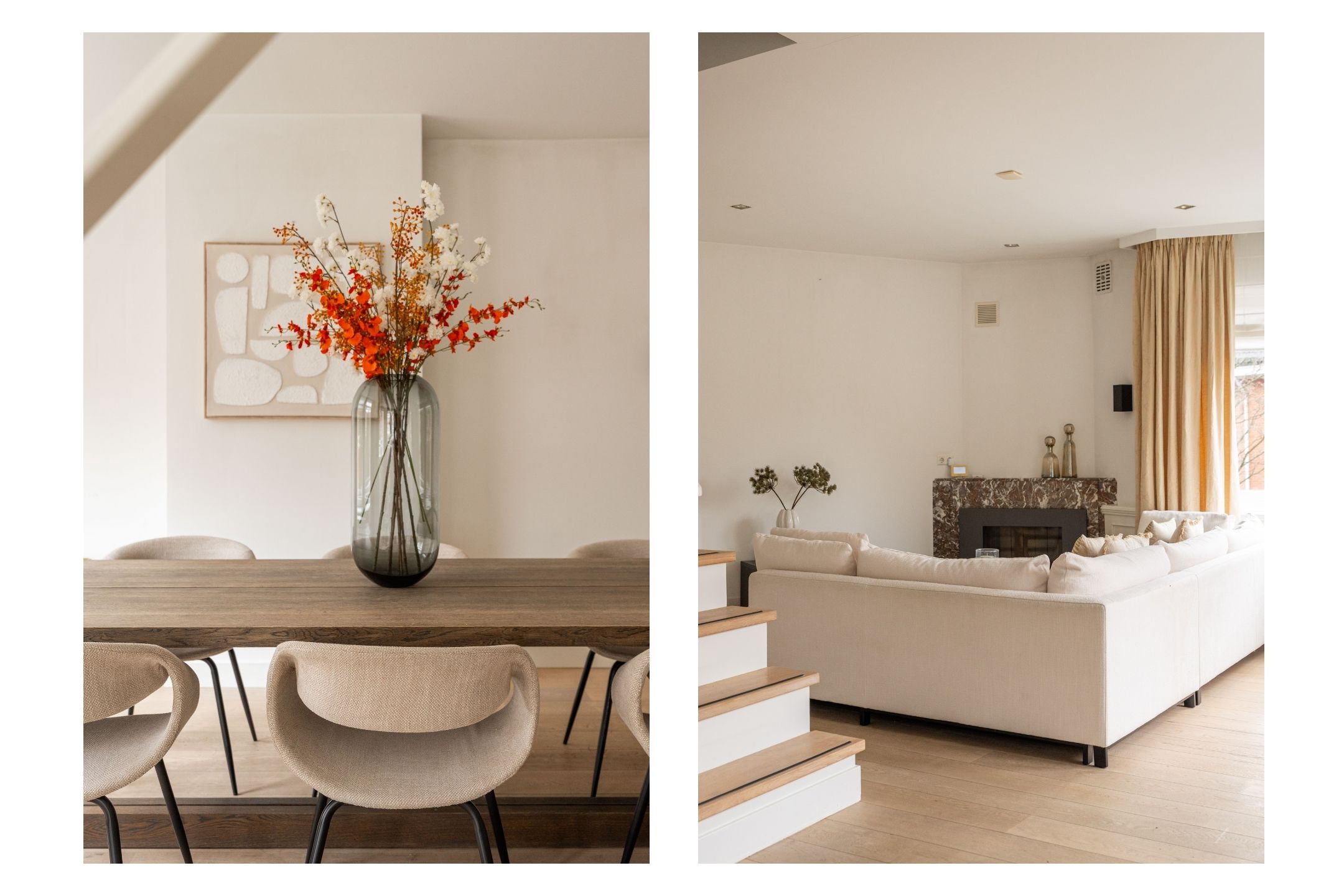 From the spacious landing you enter the exceptionally generous and light-filled living room, featuring a charming fireplace and a centrally positioned staircase that playfully divides the space into a sitting and dining area. Thanks to the many windows, the living room enjoys an abundance of natural light. There is also ample storage space in the form of bespoke, built-in cupboards.