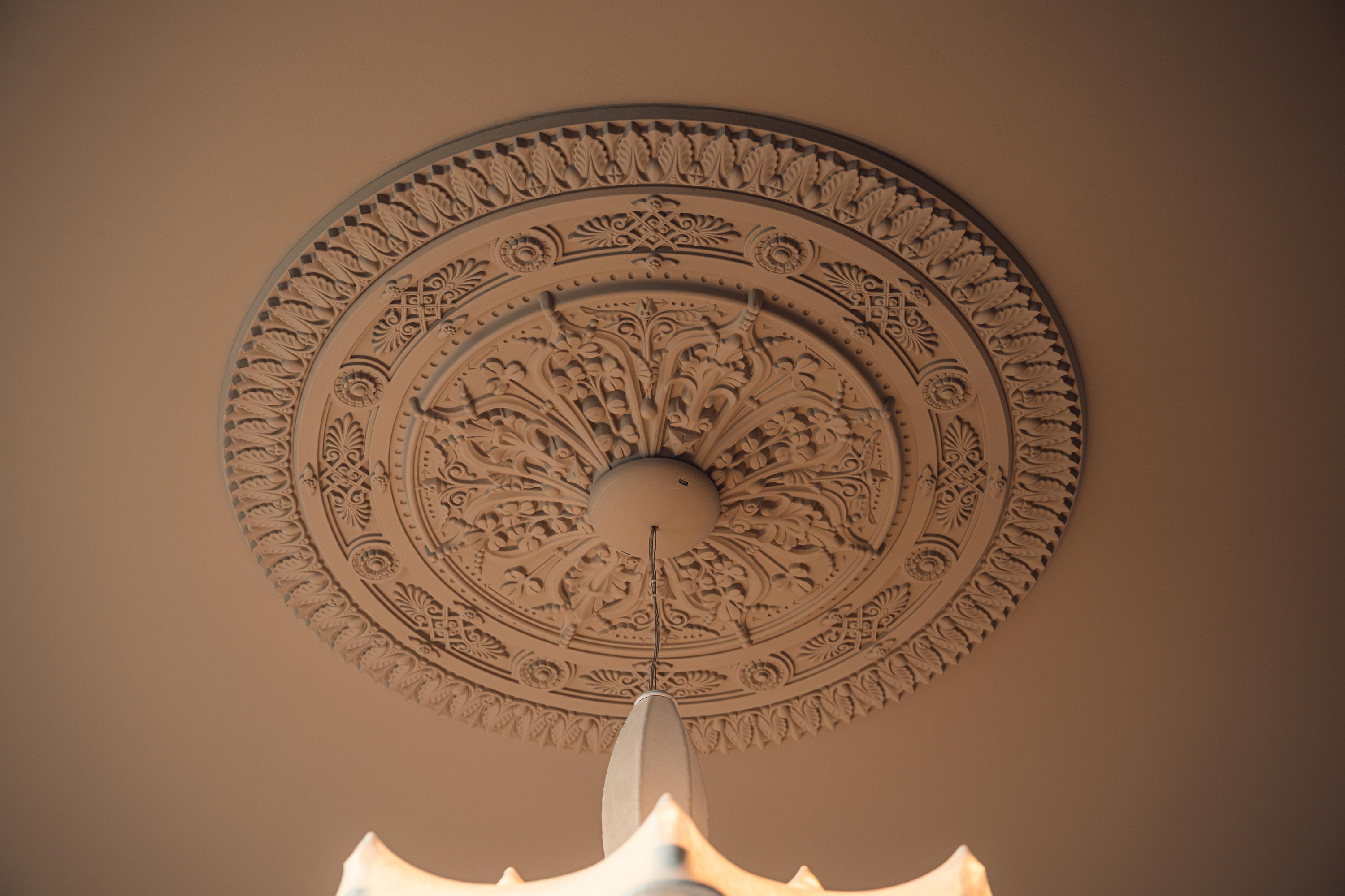 The spacious living room is a true showpiece. The classical stucco, decorative ceiling details, and an elegant ceiling rose give the room extra allure and warmth. At the center stands the (monumental) marble fireplace with open hearth, forming a stylish combination with the sleek, contemporary interior. The herringbone wooden floor with dark inlay emphasizes the length of the room and ties in beautifully with the refined wall finishes.