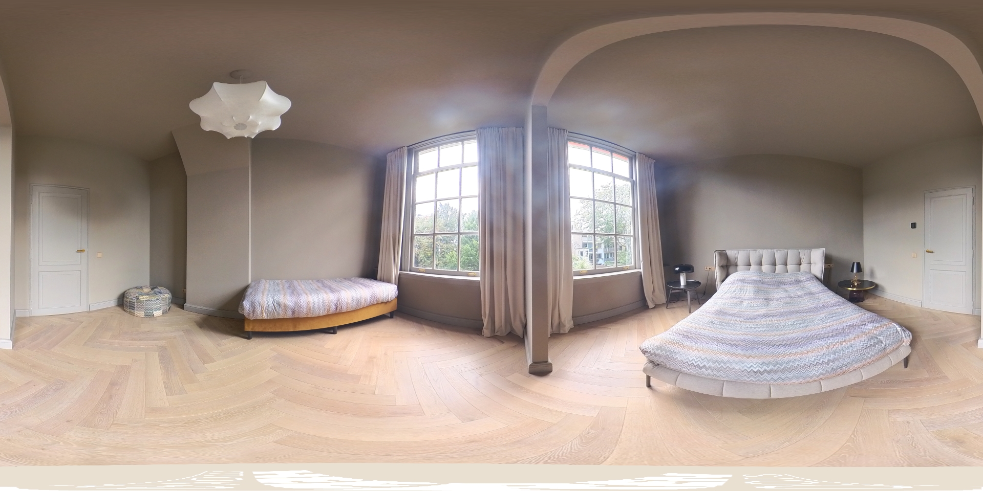 The bedroom is generously sized with large windows that allow abundant natural light. In the current layout, the partition wall has been removed, creating a spacious open room with space for both a double bed and guest bed. If desired, the original division can easily be restored to create two separate bedrooms.