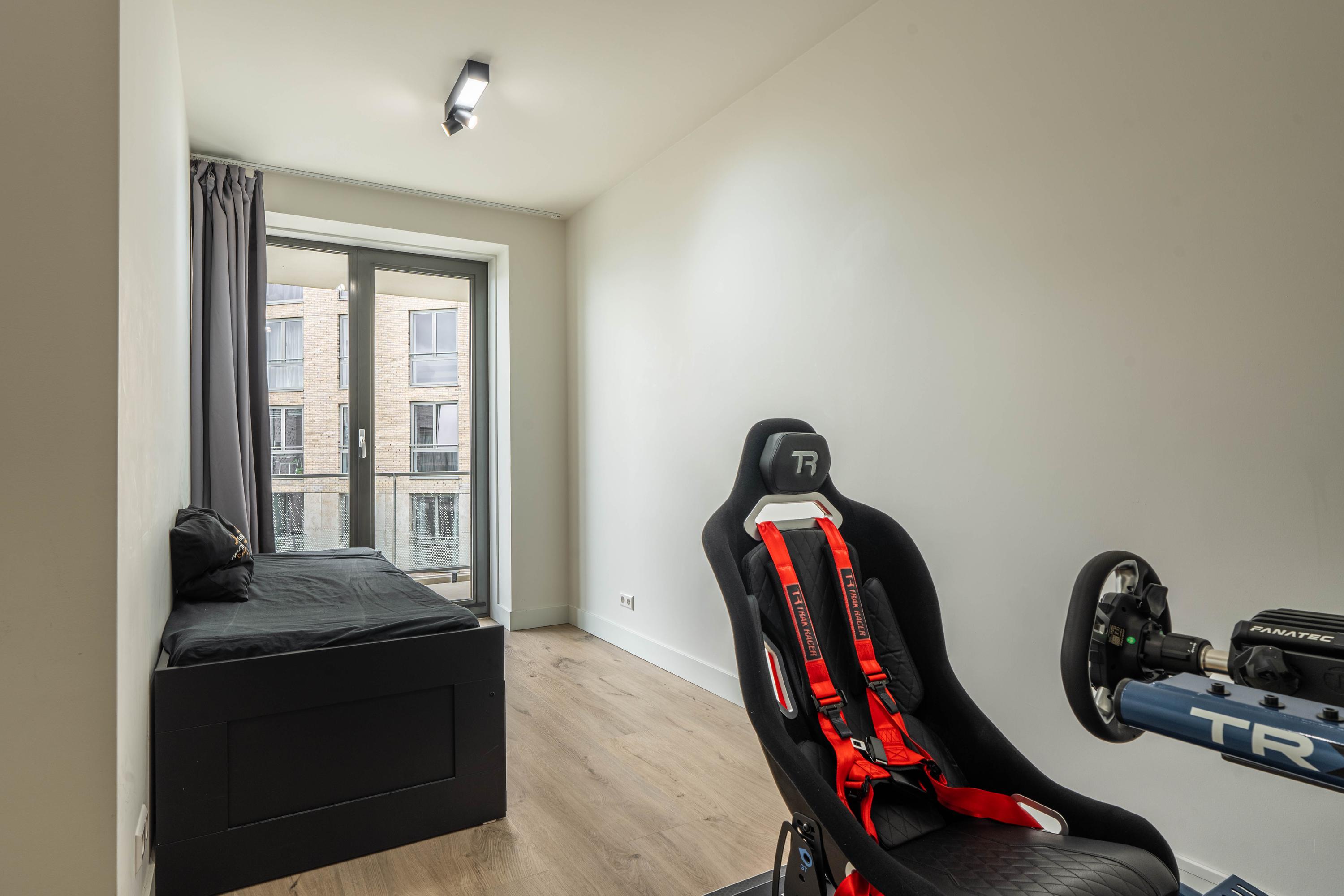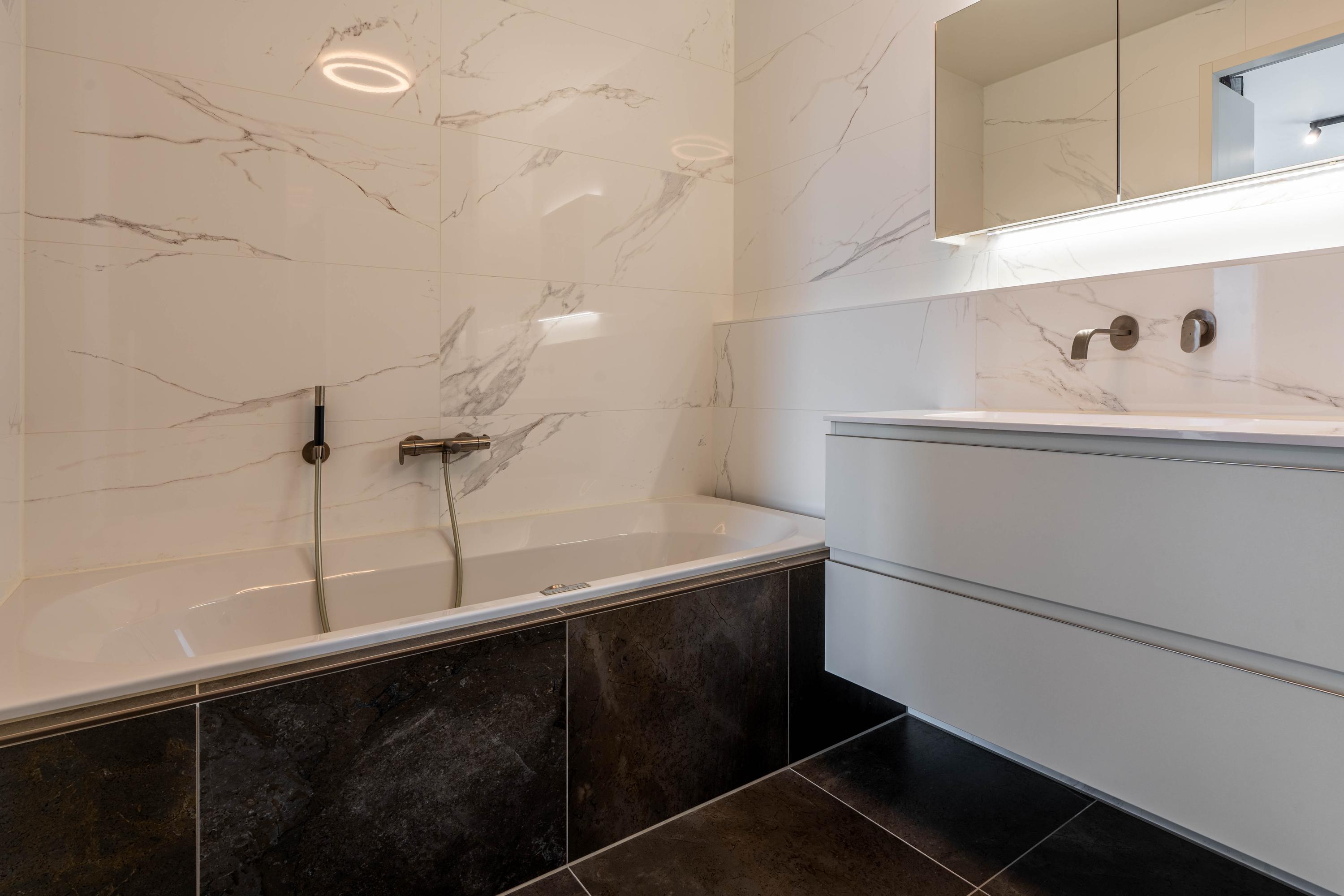 From the hallway, all three bedrooms are accessible, one of which also has access to the balcony. The master bedroom includes an en-suite bathroom with bathtub, walk-in shower, washbasin, and toilet. A second bathroom, accessible from the hallway, features a walk-in shower and washbasin. The entire apartment is equipped with a heat recovery ventilation system (HRV), an aquifer thermal energy storage system (ATES), underfloor heating, and cooling.